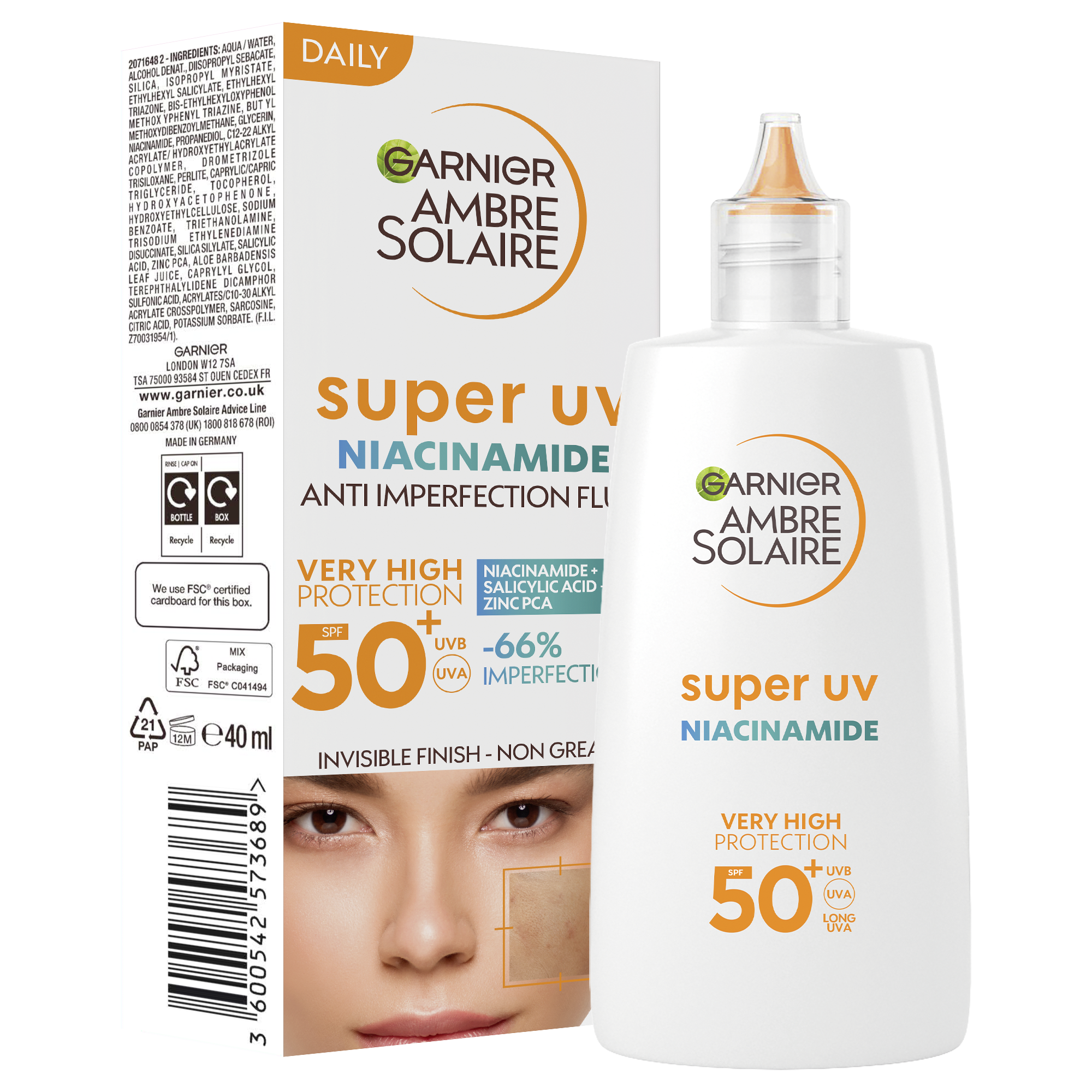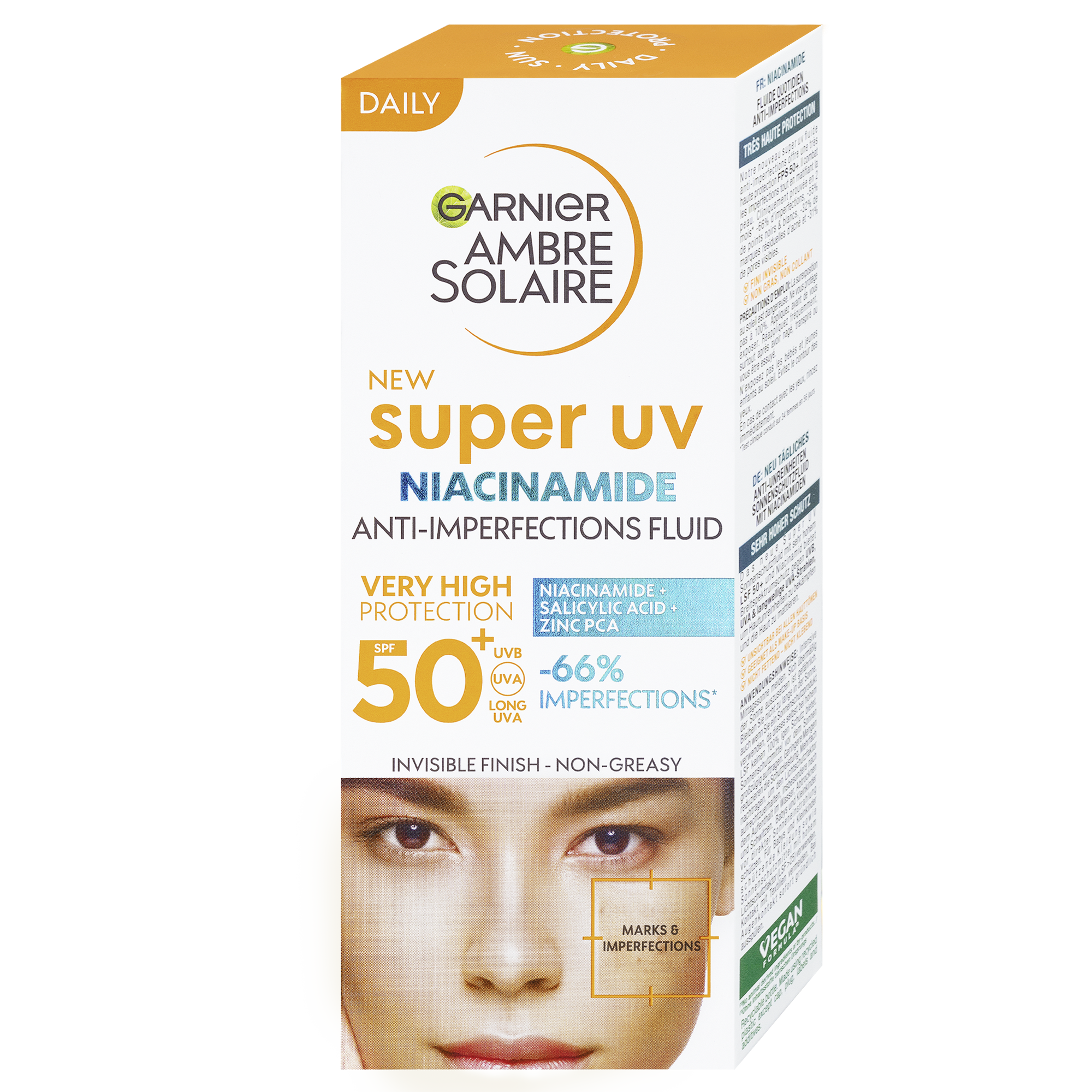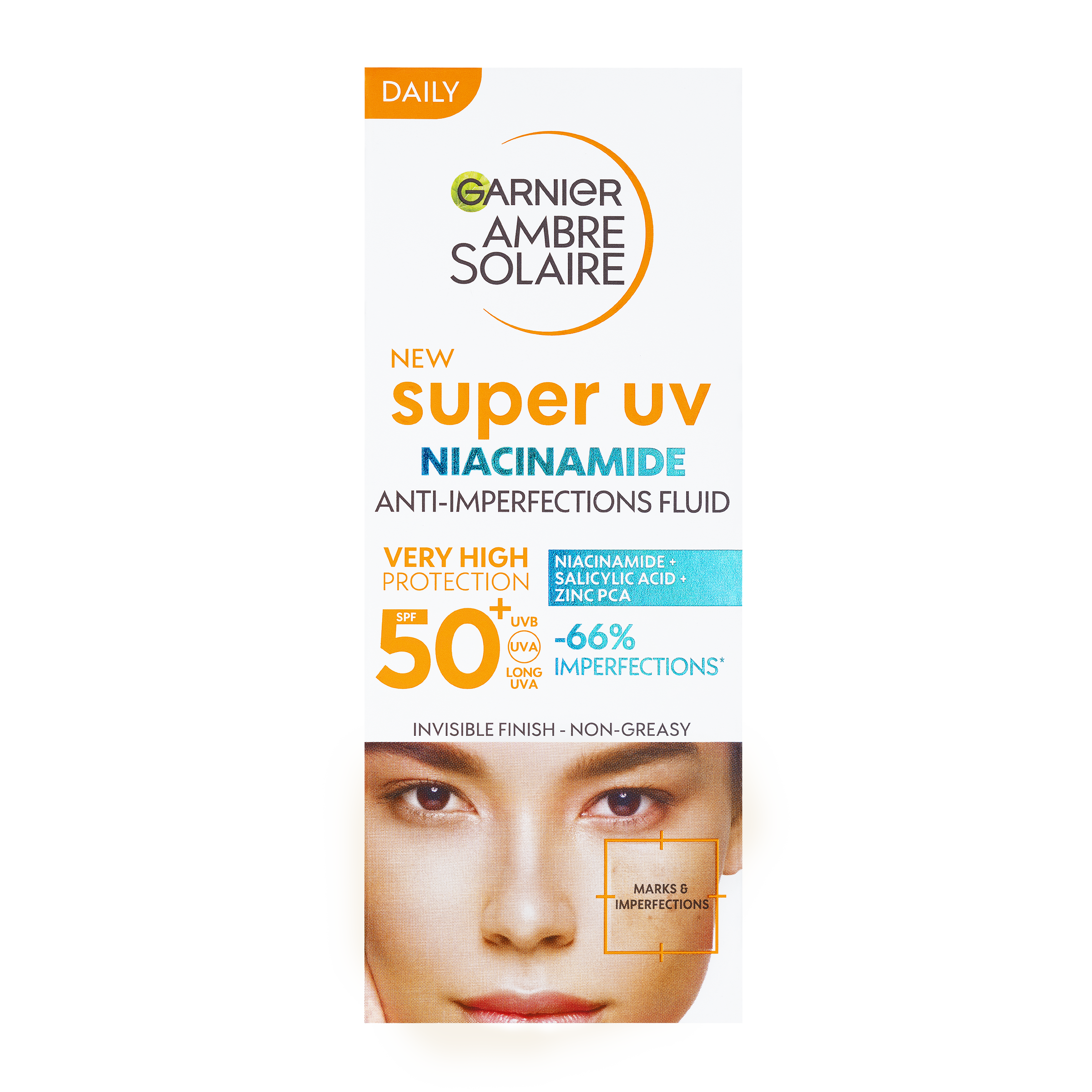 Super UV denní fluid proti proti nedokonalostem s niacinamidem a SPF 50+ obsahuje 3,5 % [niacinamidu + kyseliny salicylové + zinku PCA] a pomáhá bojovat proti nedokonalostem a má 12H matující účinek*. Ultra lehká textura se okamžitě vstřebává a zanechává na pokožce neviditelný, nemastný a nelepivý finiš. Denní fluid s niacinamidem je nekomedogenní a vhodný pro citlivou pleť. Složení fluidu chrání všechny odstíny pleti.