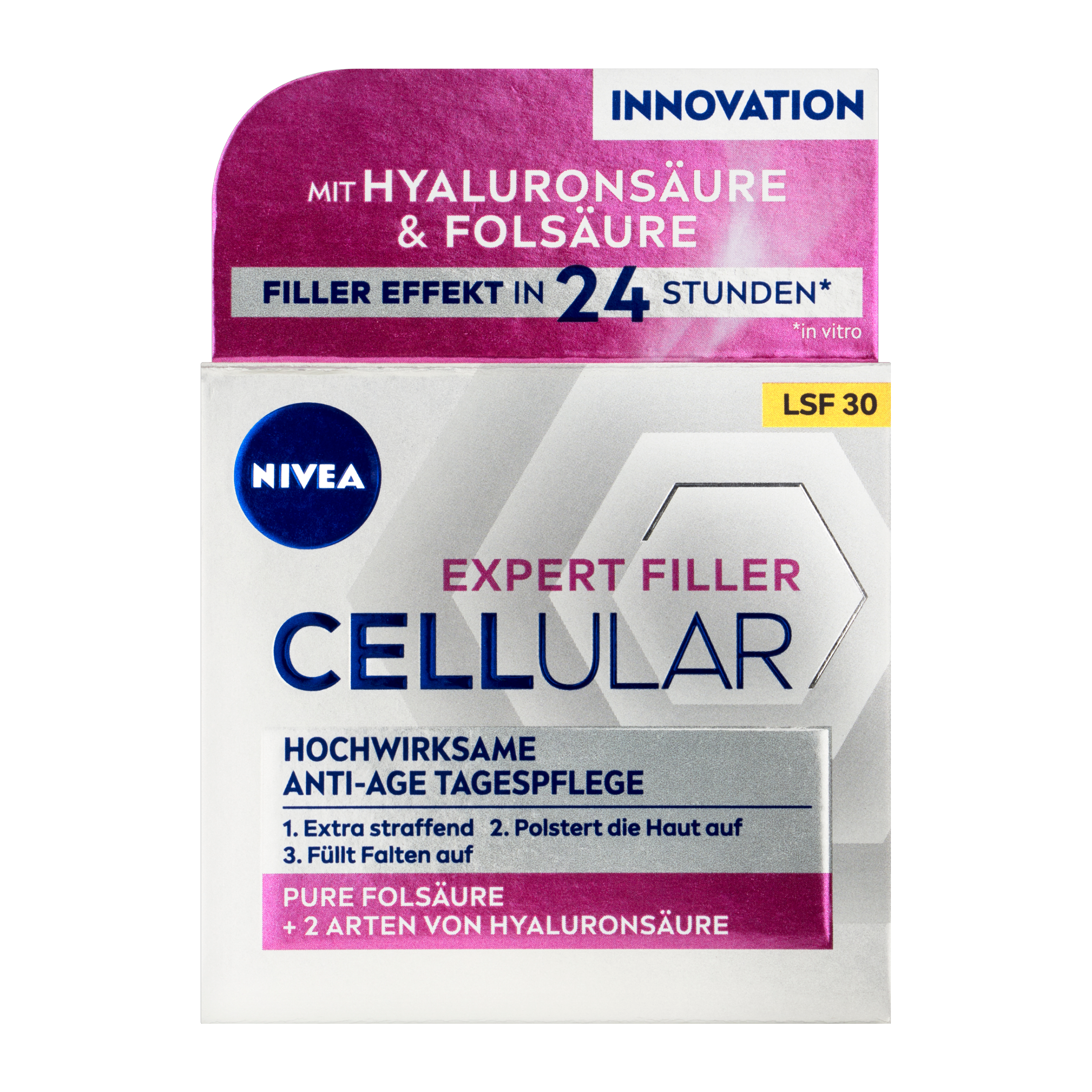 Denní krém Nivea Expert Filler přináší viditelně hladší a pevnější pleť již po prvním dni používání. Krém obsahuje vysoce účinné látky, které působí na buněčnou strukturu pleti. Kyselina listová stimuluje obnovu kožních buněk, opravuje poškození způsobené nejen UV zářením a pomáhá zpomalovat projevy stárnutí. V kombinaci s dvojí kyselinou hyaluronovou získá vaše pleť pevnost a mladistvý vzhled. Makro kyselina hyaluronová intenzivně hydratuje a zvláčňuje, zatímco její mikro obdoba proniká hluboko do struktury pleti, vyplňuje hluboké vrásky a dodává pleti hladší vzhled. Díky UVA a UVB filtrům s ochranným faktorem SPF30 získává pleť ochranu před sluncem a předčasným stárnutím.