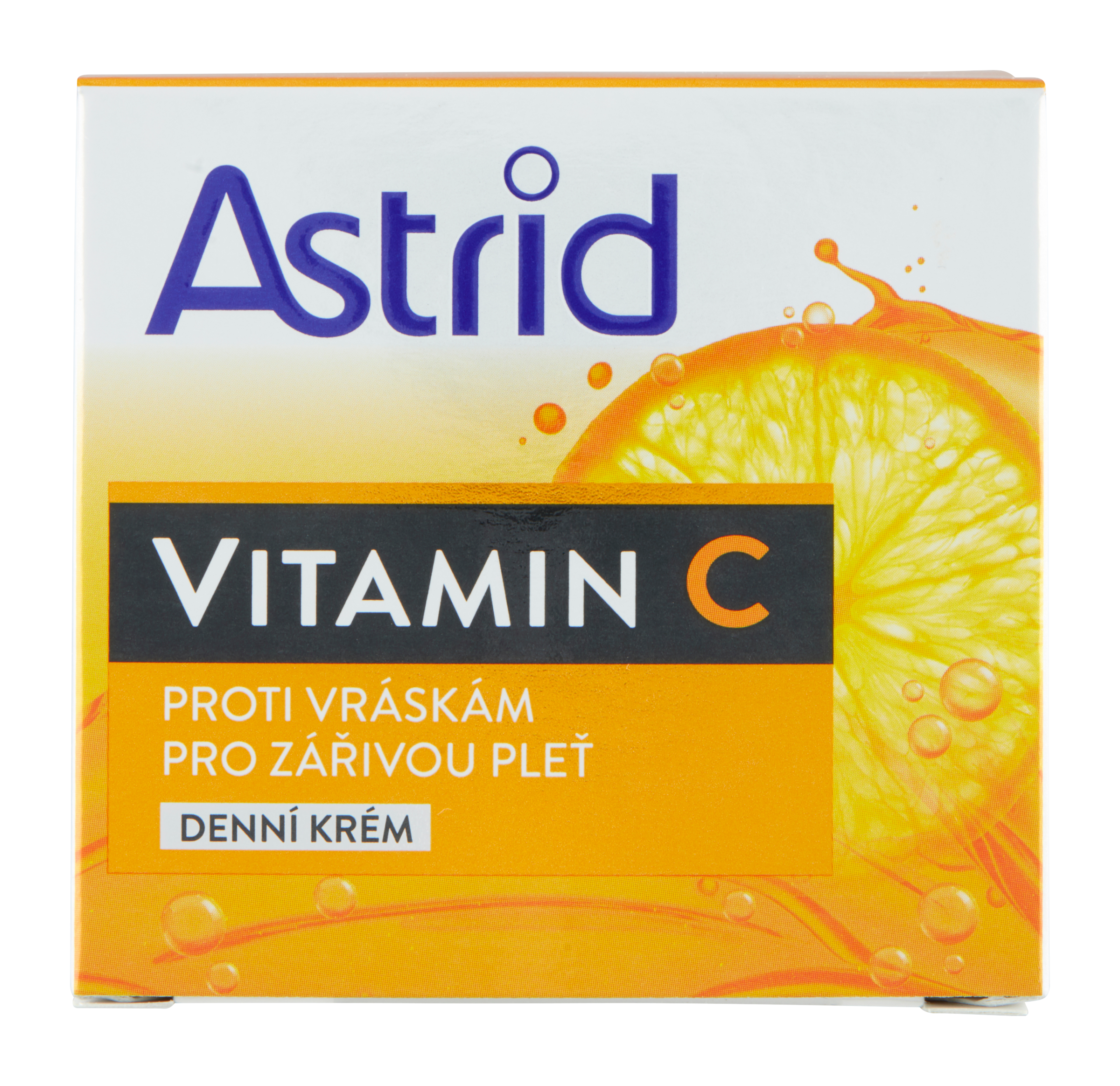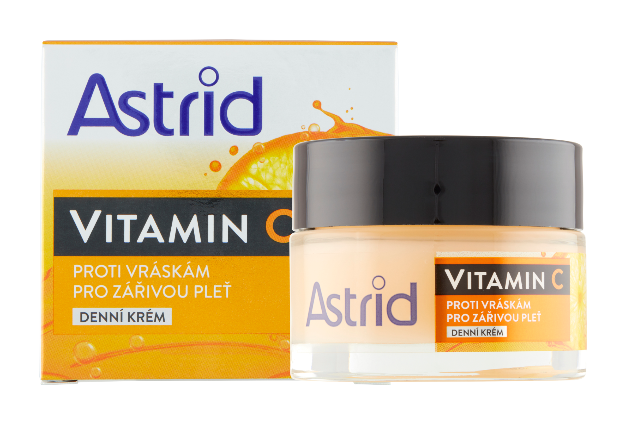 Denní krém Astrid Vitamin C, bohatý na vitamin C, který je známý svými antioxidačními účinky na pleť, posiluje produkci kolagenu a zvyšuje rovnoměrný tón a jas pleti.