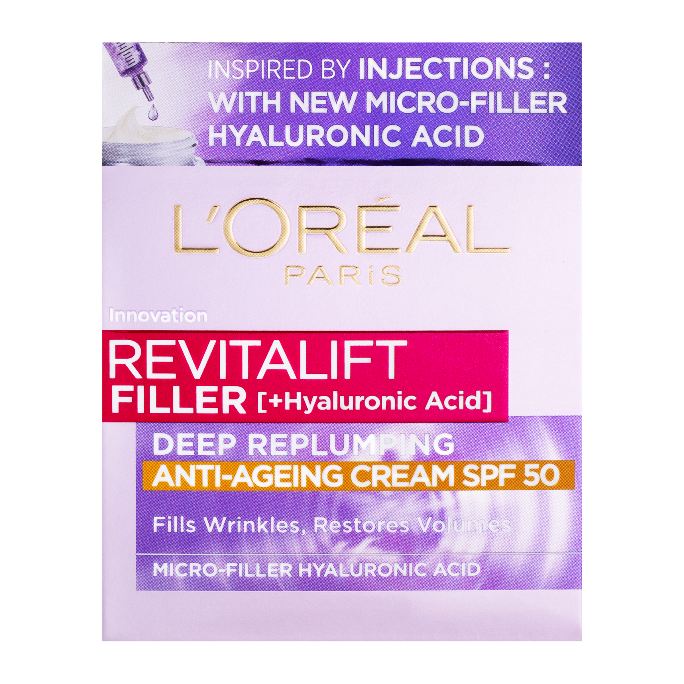 L'oréal Paris Revitalift Filler denní krém SPF 50 okamžitě hydratuje pleť až po dobu 48 hodin. Inovativní složení viditelně navrací pleti pružnost a pevnost, zlepšuje strukturu pleti a výrazně redukuje vrásky. Lehká textura krému chrání pokožku před UVA + UVB zářením za pomoci ochranného faktoru 50. L'ORÉAL PARIS Revitalift Filler denní krém SPF 50 bojuje proti známkám stárnutí a navrací pleti pružnost a pevnost.