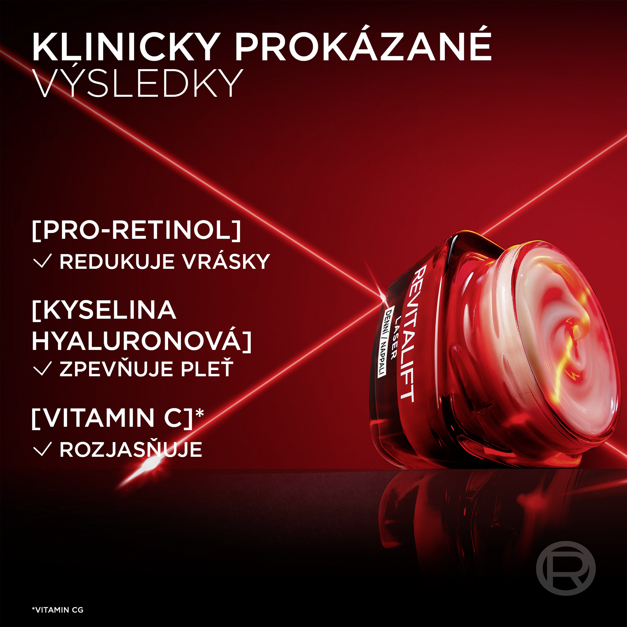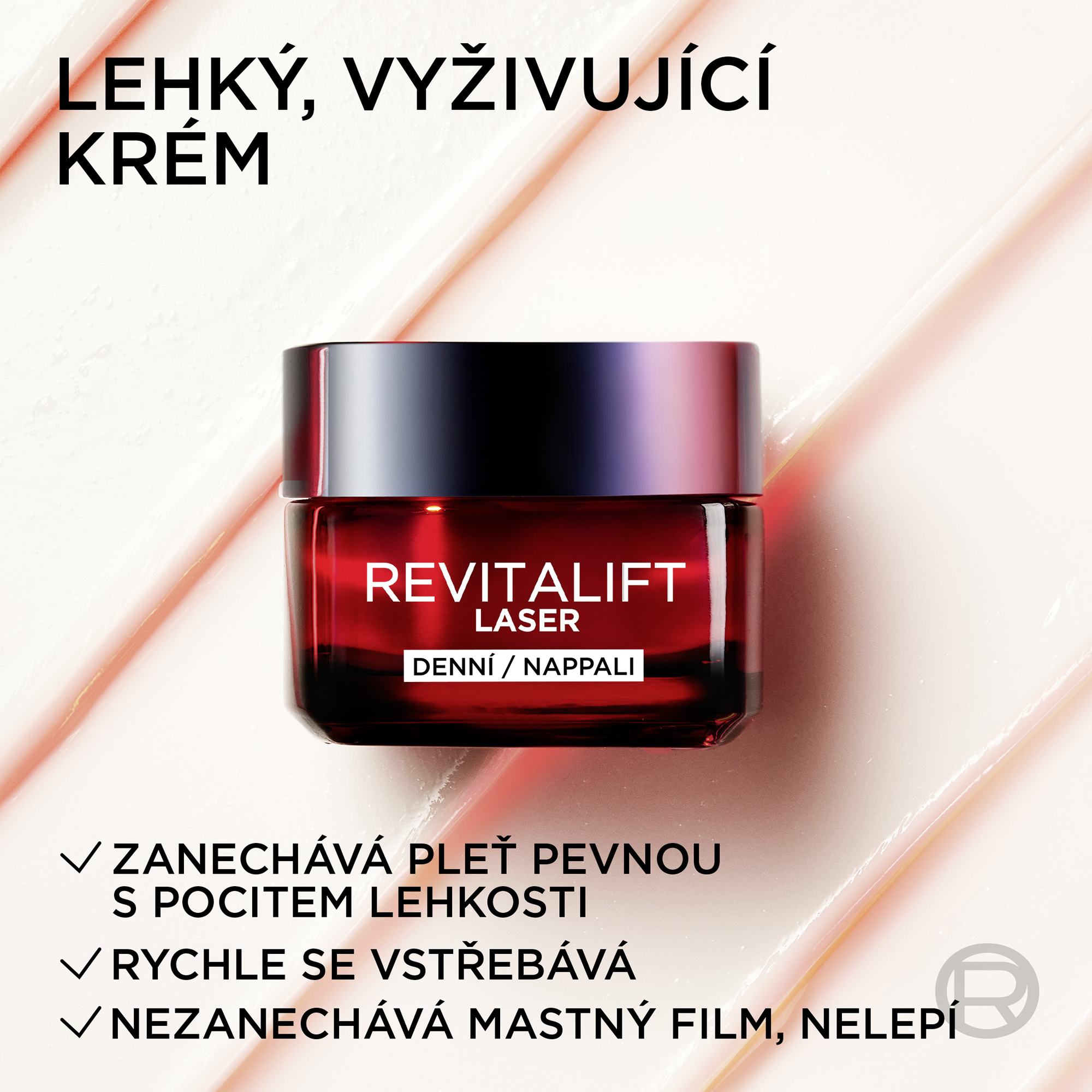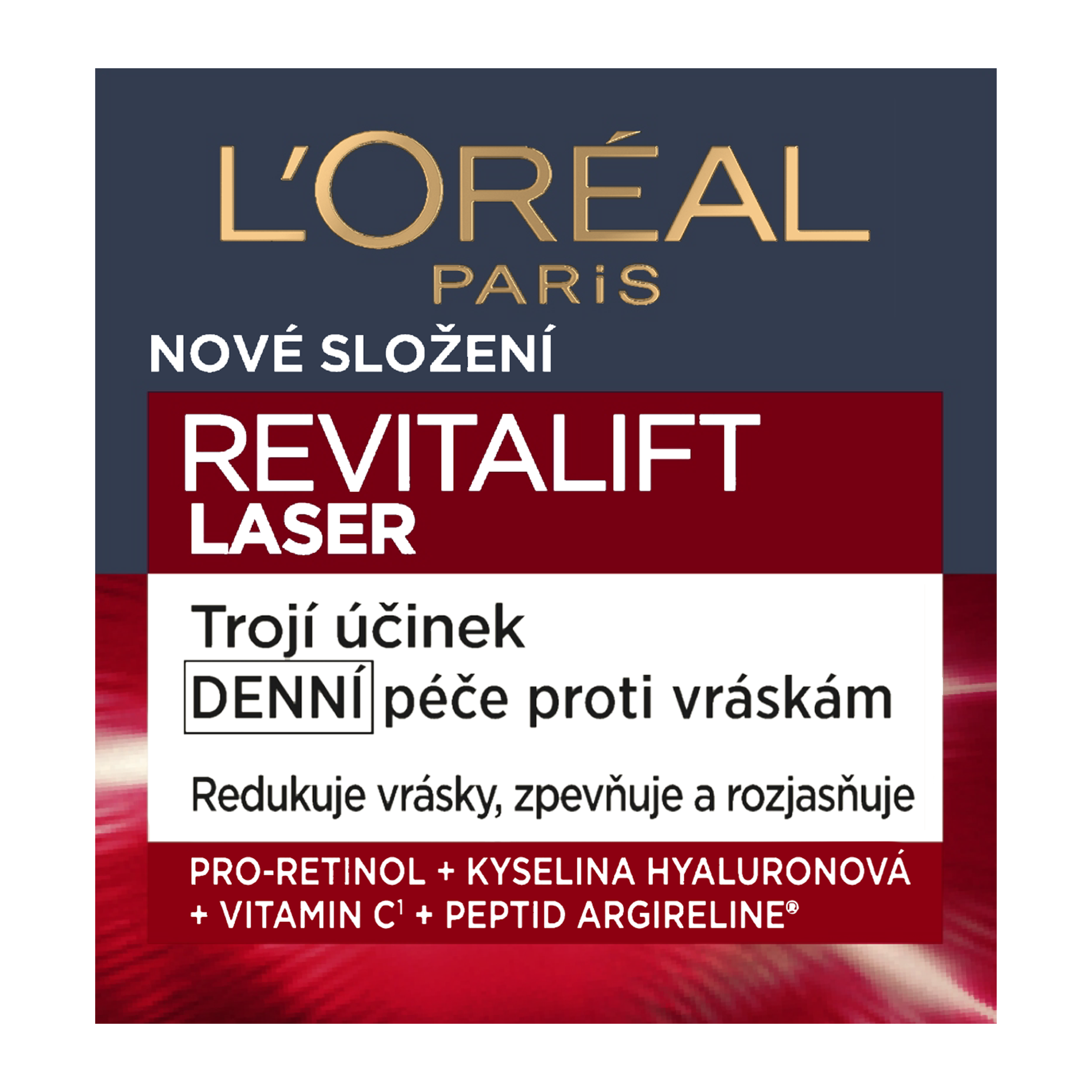 Revitalift Laser denní krém proti vráskám posílen top 3 aktivními látkami doporučovanými dermatology: pro-retinol pomáhá redukovat vrásky a obnovovat texturu pleti, kyselina hyaluronová intenzivně hydratuje a vyplňuje pleť a vitamín C pomáhá rozzářit pleť a viditelně zlepšuje tón pleti. Lehký, vyživující krém se rychle vstřebává a zanechává pleť pevnou s pocitem lehkosti. Nezanechává mastný film, nelepí.