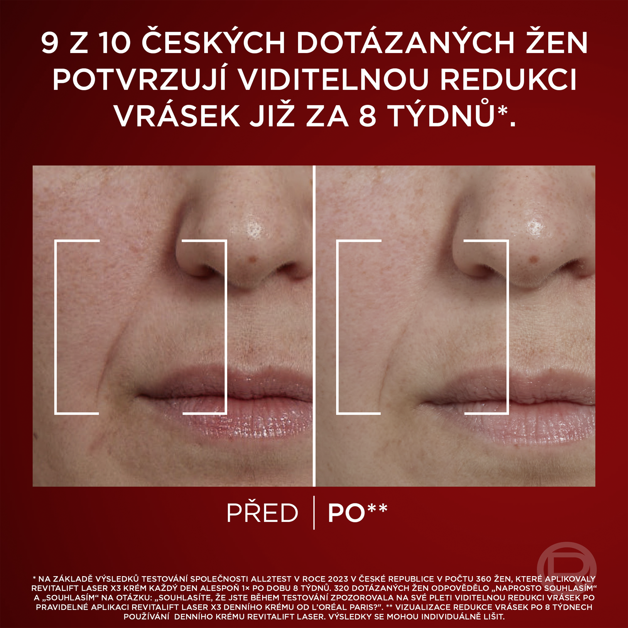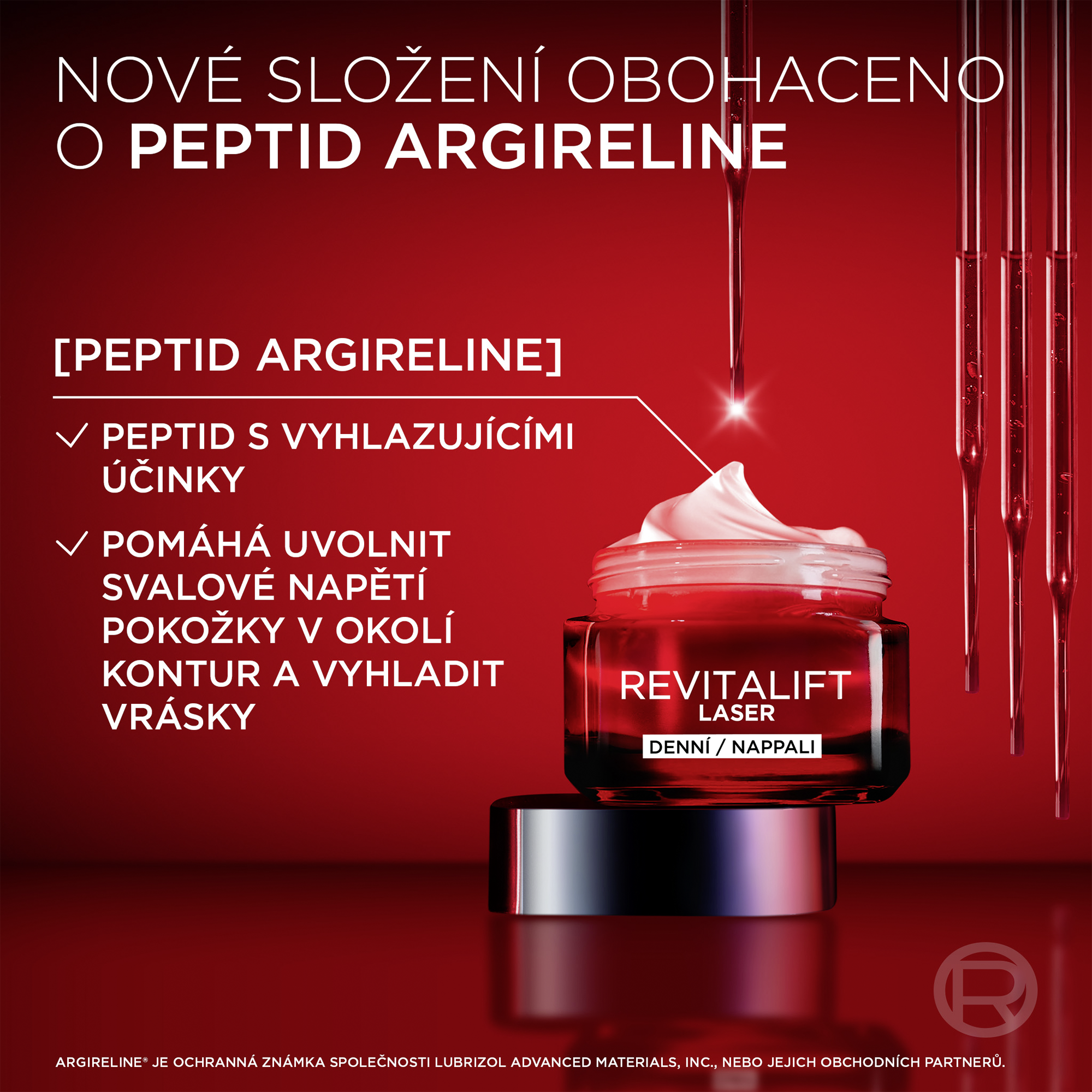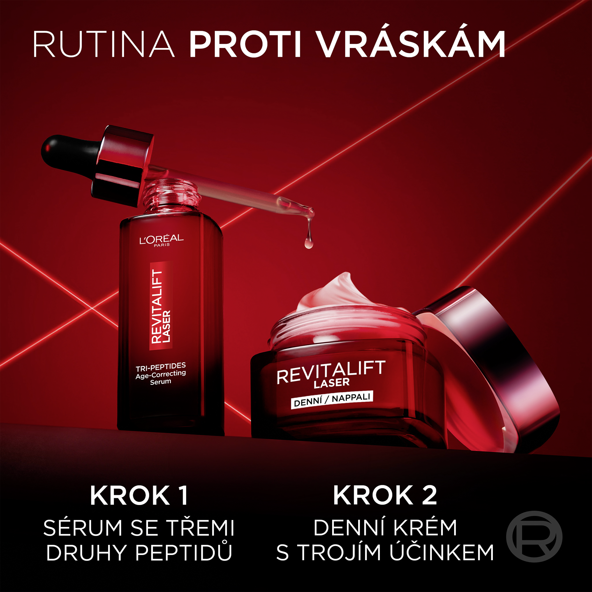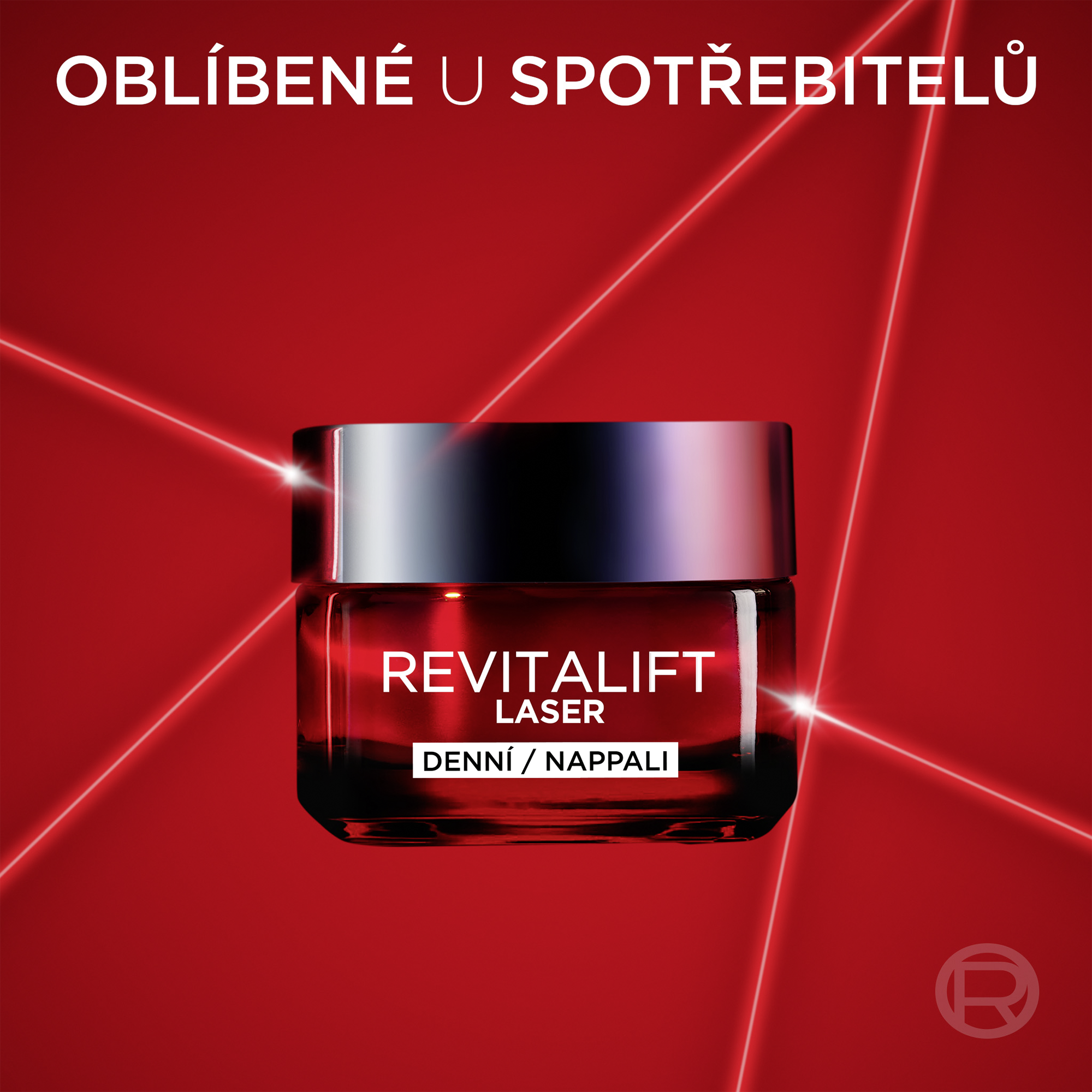 Revitalift Laser denní krém proti vráskám posílen top 3 aktivními látkami doporučovanými dermatology: pro-retinol pomáhá redukovat vrásky a obnovovat texturu pleti, kyselina hyaluronová intenzivně hydratuje a vyplňuje pleť a vitamín C pomáhá rozzářit pleť a viditelně zlepšuje tón pleti. Lehký, vyživující krém se rychle vstřebává a zanechává pleť pevnou s pocitem lehkosti. Nezanechává mastný film, nelepí.