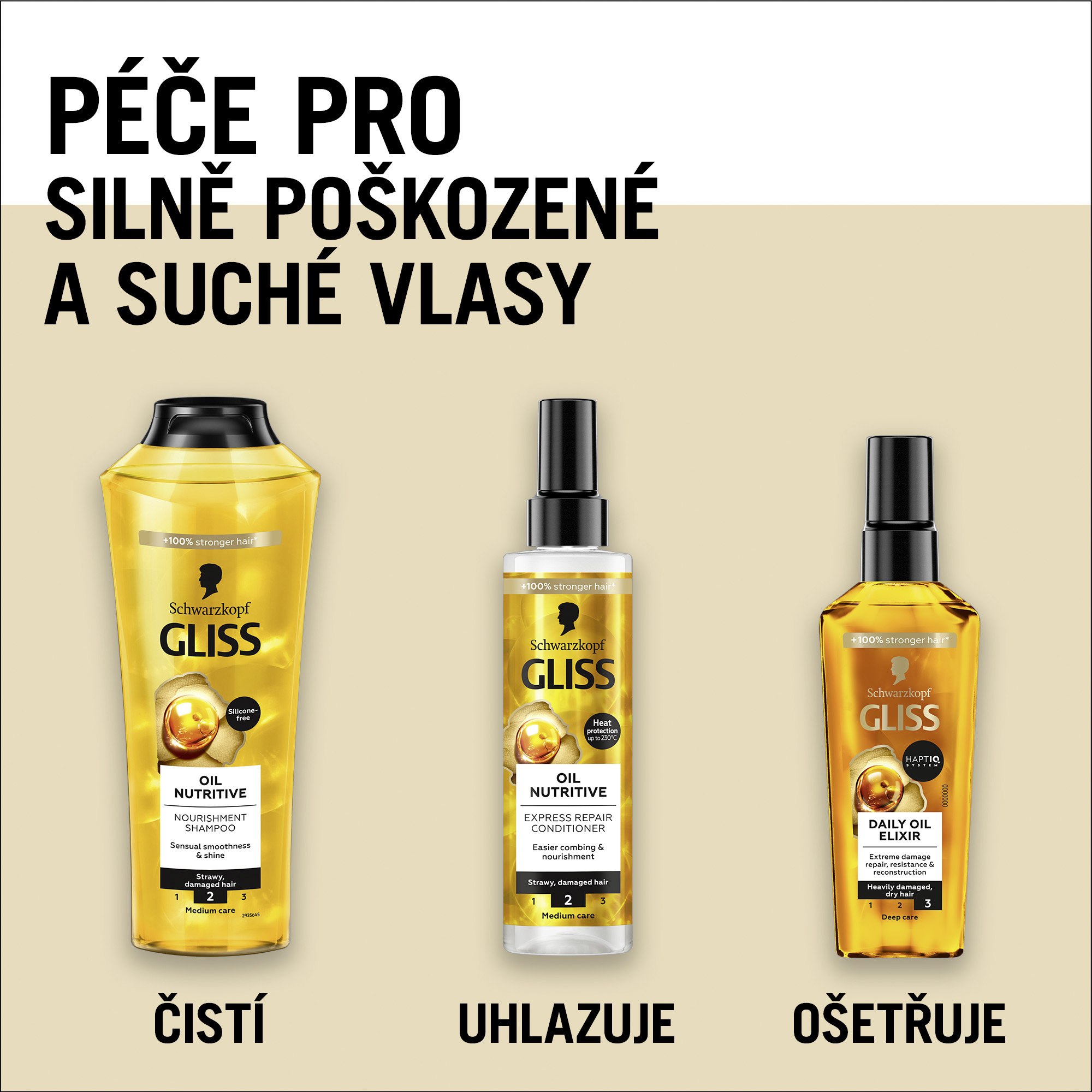 - Denní olejový elixír: Gliss olejový elixír poskytuje vlasům hloubkovou regeneraci a intenzivní výživu. Zvláště vhodný pro silně poškozené, suché vlasy. Vhodné pro každodenní použití