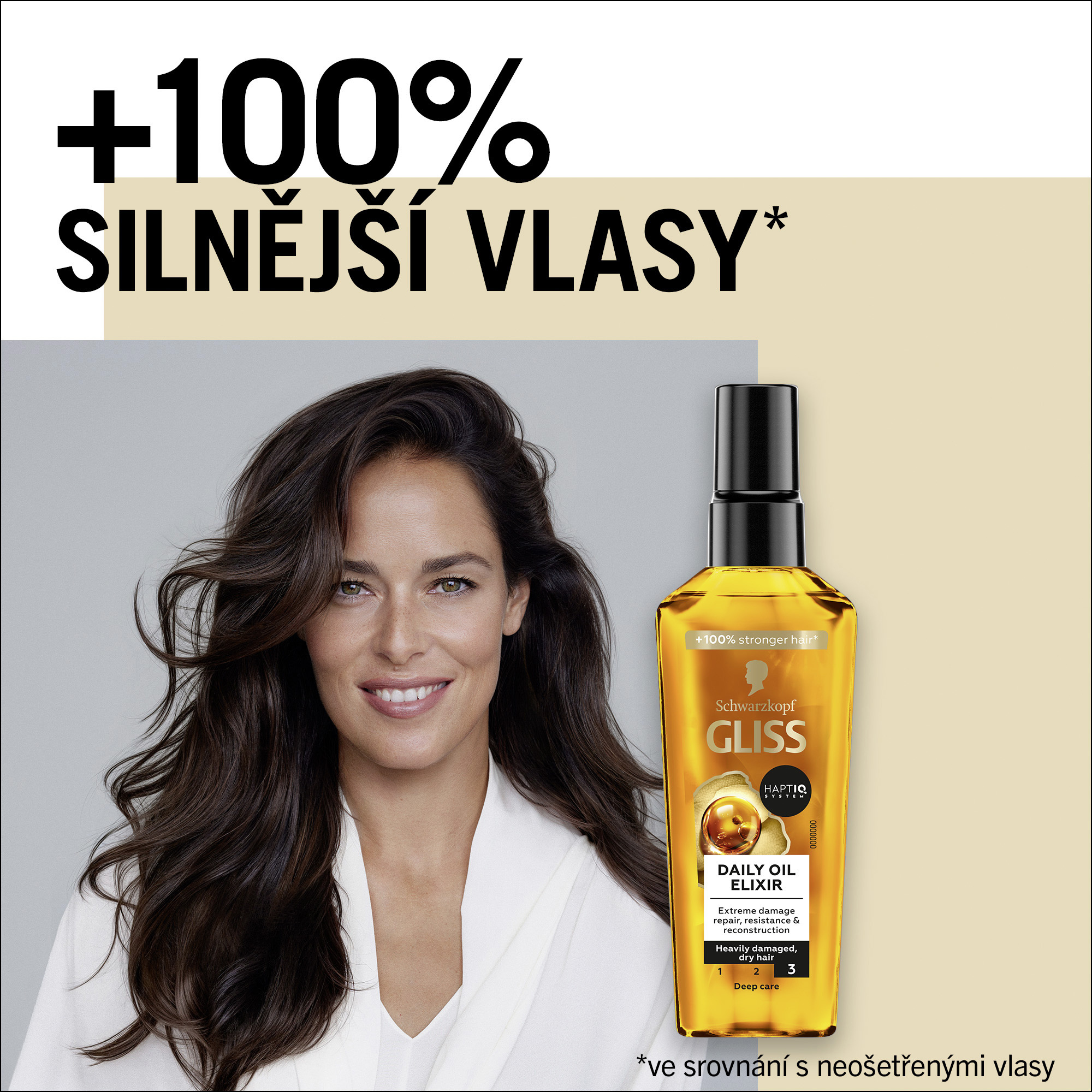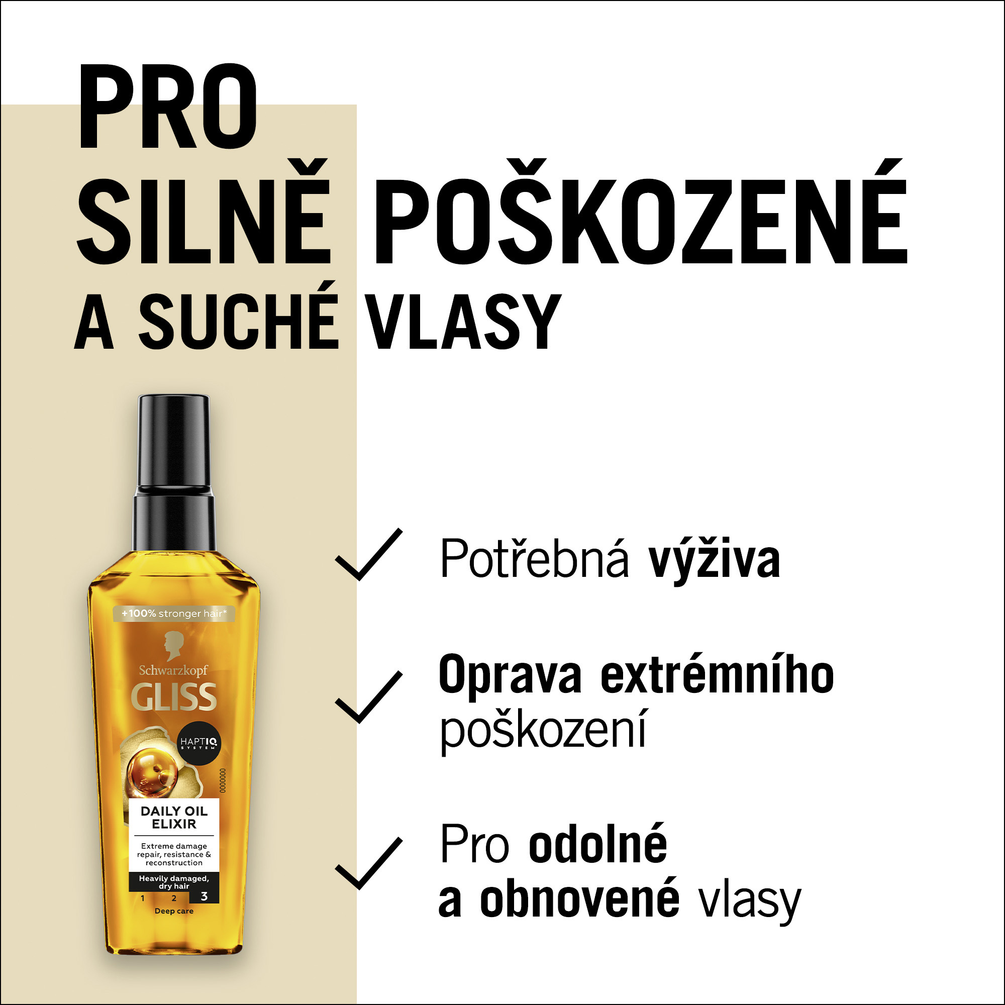 - Gliss Daily Oil elixír pro silně poškozené, suché vlasy. Obnova extrémního poškození, odolnost a regenerace. Naše péče díky systému HAPTIQ vytváří mikrovazby a posiluje vlasovou strukturu.