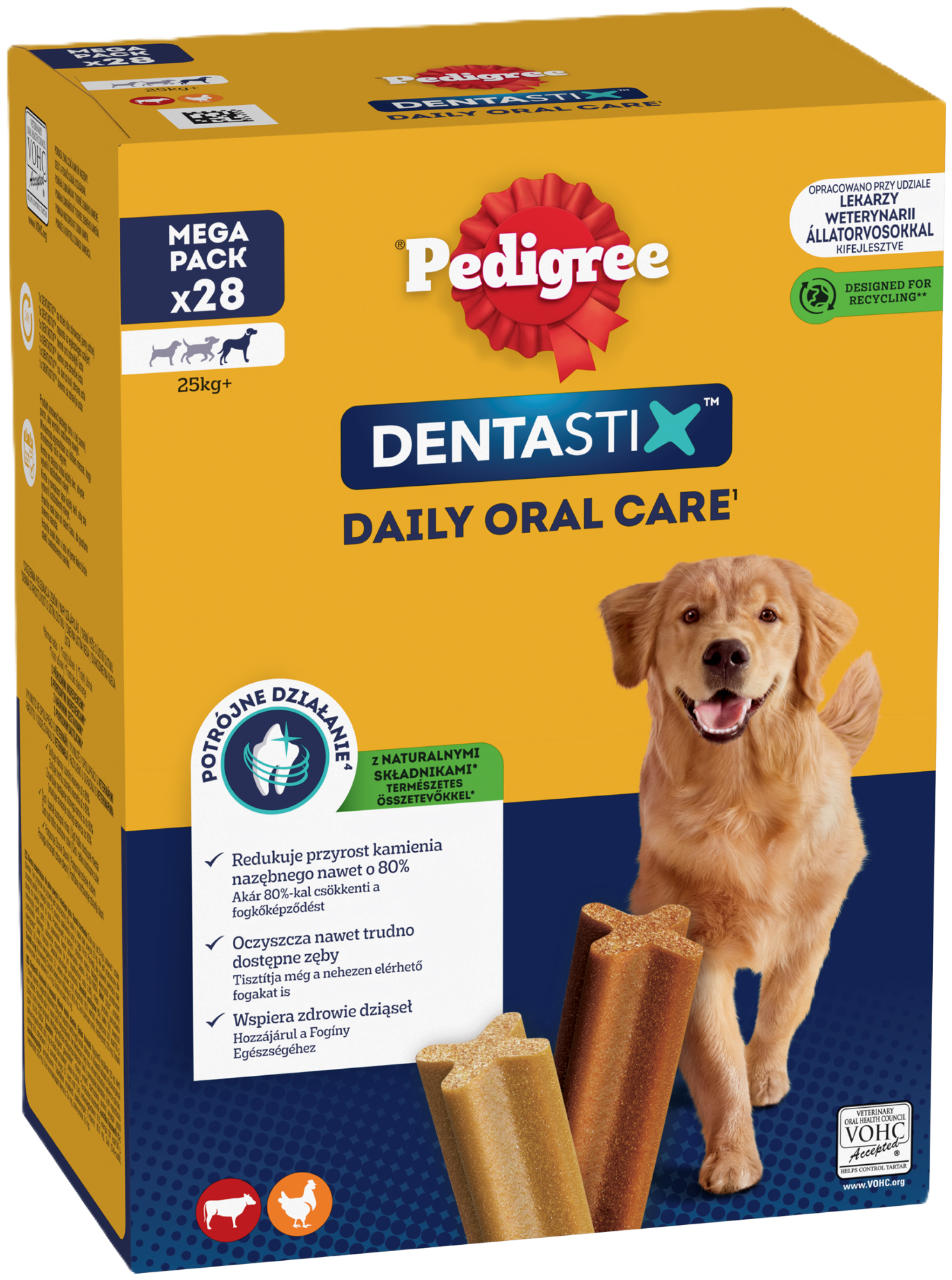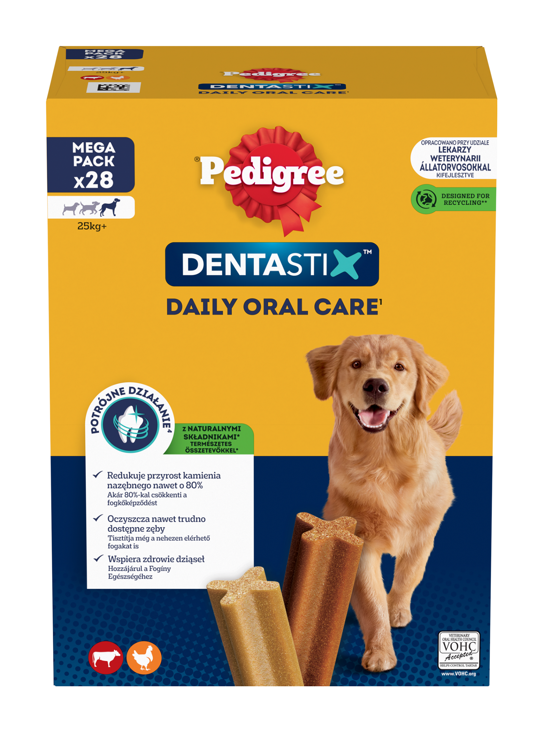 Pedigree Dentastix Daily Oral Care jsou dentální pamlsky v jedinečném tvaru písmene X, u kterých je vědecky dokázáno, že při každodenním užívání pomáhají snižovat tvorbu zubního kamene až o 80 %. Pedigree Dentastix Daily Oral Care mají jemnou abrazivní texturu a aktivní složky, které pomáhají omezit usazování plaku a tvorbu zubního kamene. Jsou chutné, přesto mají nízký obsah tuku, neobsahují přidaný cukr, umělá barviva a ochucovadla. Pedigree – posilujte to dobré ve svém psovi.