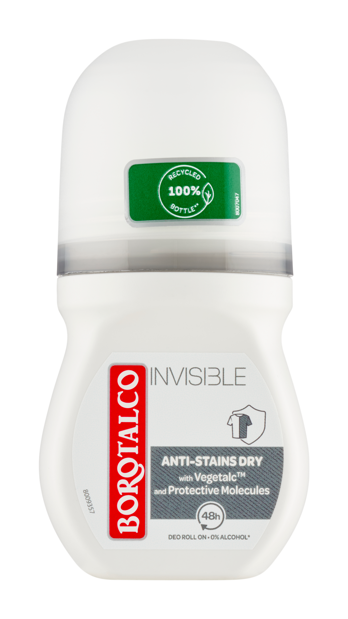 Oddejte se Borotalco zážitku s Borotalco Invisible! Jeho složení obohacené inovativním VegetalcTM, směsí absorpčních prášků rostlinného původu, a ochranných molekul: sítí neviditelných molekul která zachycuje a nepřenáší bílé stopy, pachy a skvrny a vytváří bariérový efekt mezi pokožkou a suchý pocit na pokožce. Účinný na žluté a bílé stopy, vhodný také na jemné oblečení jako je hedvábí. 48hodinová účinnost deodorantu. Obsahuje 0 % alkoholu. Dermatologicky testováno