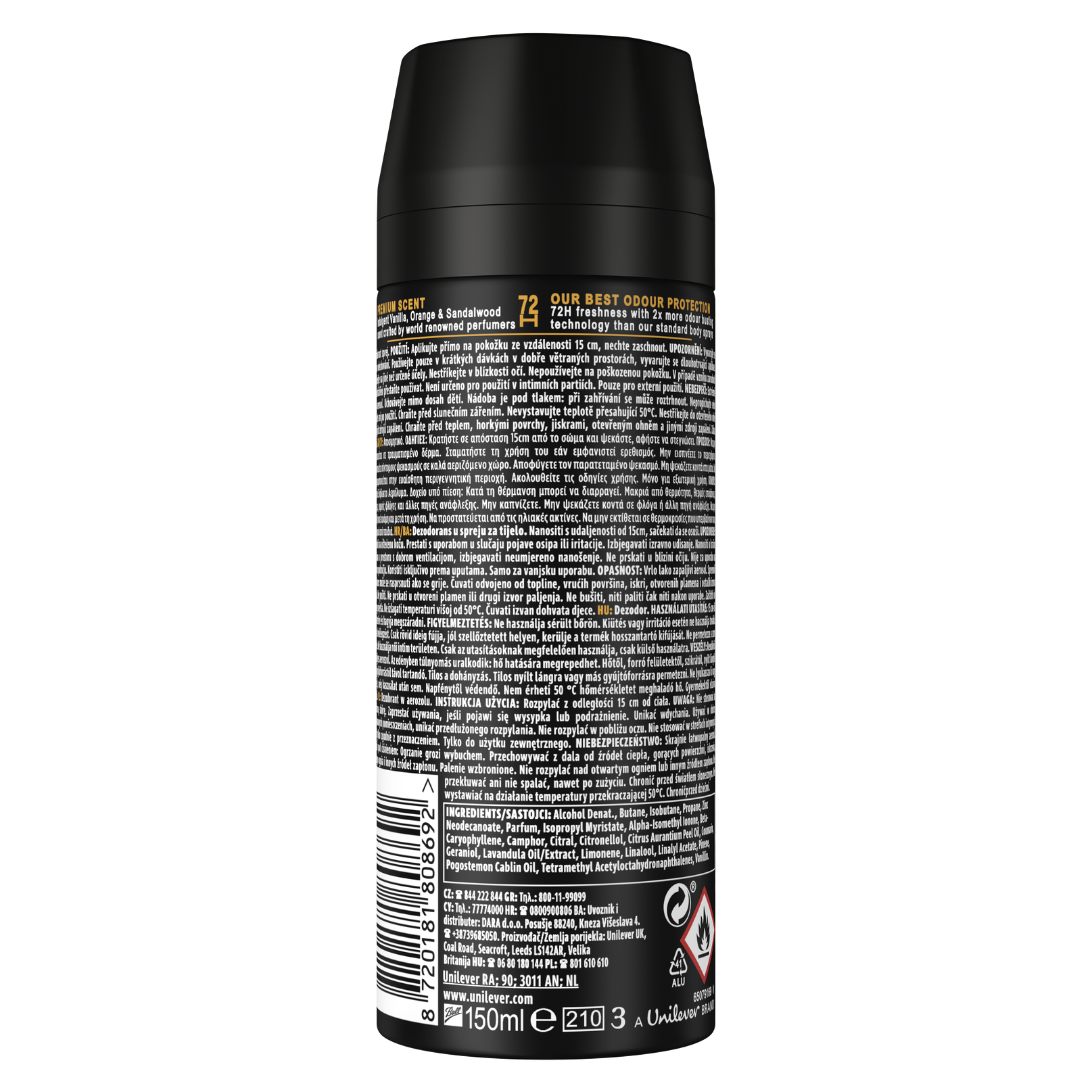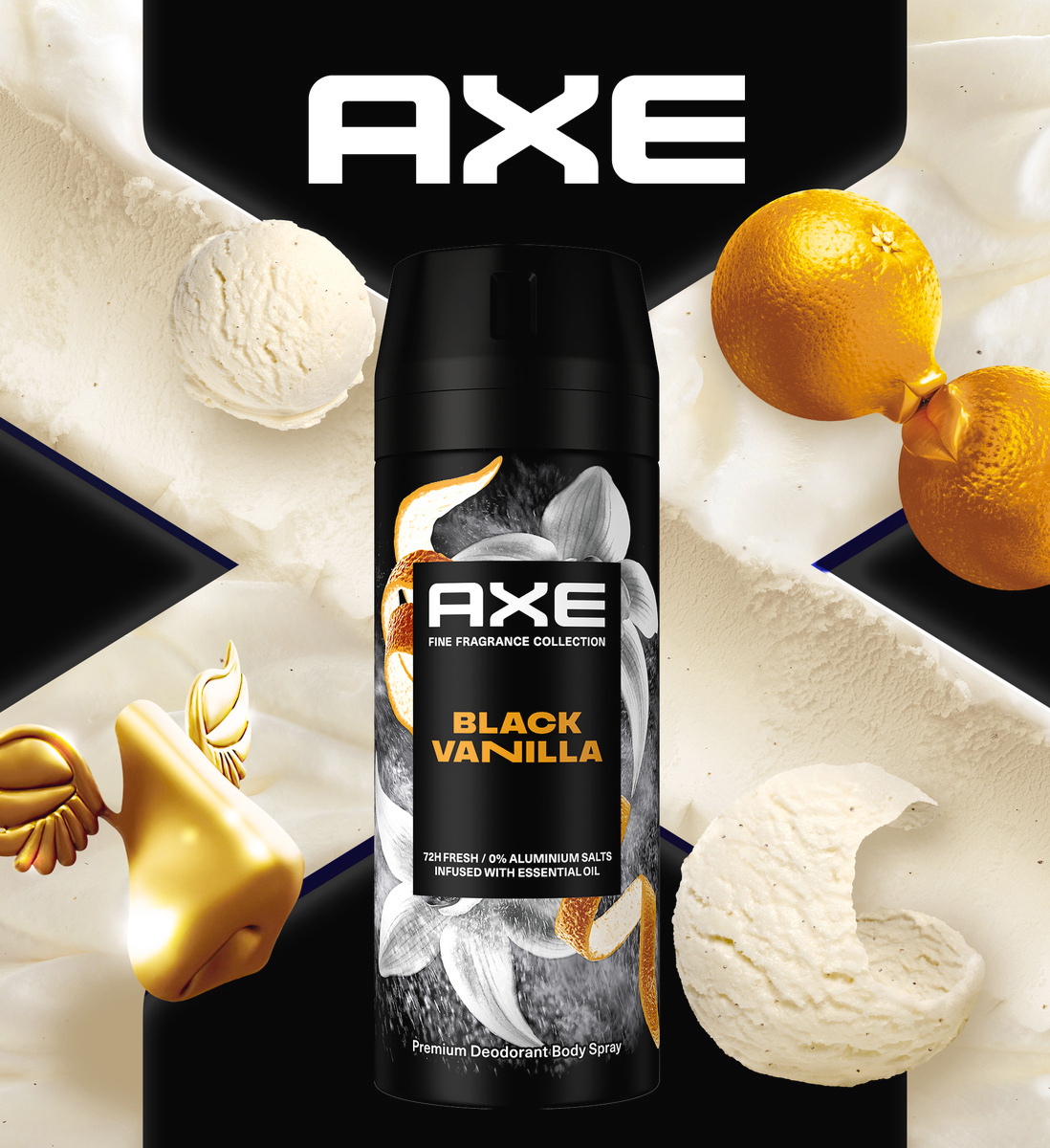 Kdo říká, že kvalitní vůně jsou jen pro speciální příležitosti? AXE Premium Black Vanilla deodorant z kolekce AXE Fine Fragrance Collection je deodorant, díky kterému budete každý den vonět tak dobře, jako byste si právě nanesli svůj oblíbený parfém. Nikdy nevíte, co se může stát. Proto muži potřebují deodorant, který zajistí, že budou celý den vonět a zůstanou svěží. Tento pánský deodorant s neodolatelnou vůni vanilky s tóny pomeranče a santalového dřeva obsahuje dvojnásobné množství inovativní patentované zinkové technologie ve srovnání s našimi standardními AXE deodoranty. Díky tomu vůně deodorantu vydrží déle a zůstane autentická. Deodorant bez hliníkových solí chrání svého nositele účinně a spolehlivě před tělesným zápachem, aby mohl čelit světu s naprostým klidem. Stačí krátký střik na podpaží a horní část těla a zažijete až 72 hodin svěžesti! AXE Premium Black Vanilla deodorant je součástí kolekce AXE Fine Fragrance Collection, která vznikla ve spolupráci s předními světovými parfuméry. Výsledkem je řada prémiových deodorantů obohacených o éterické oleje, s vůněmi jako u luxusních parfémů, které zároveň poskytují ochranu deodorantu.