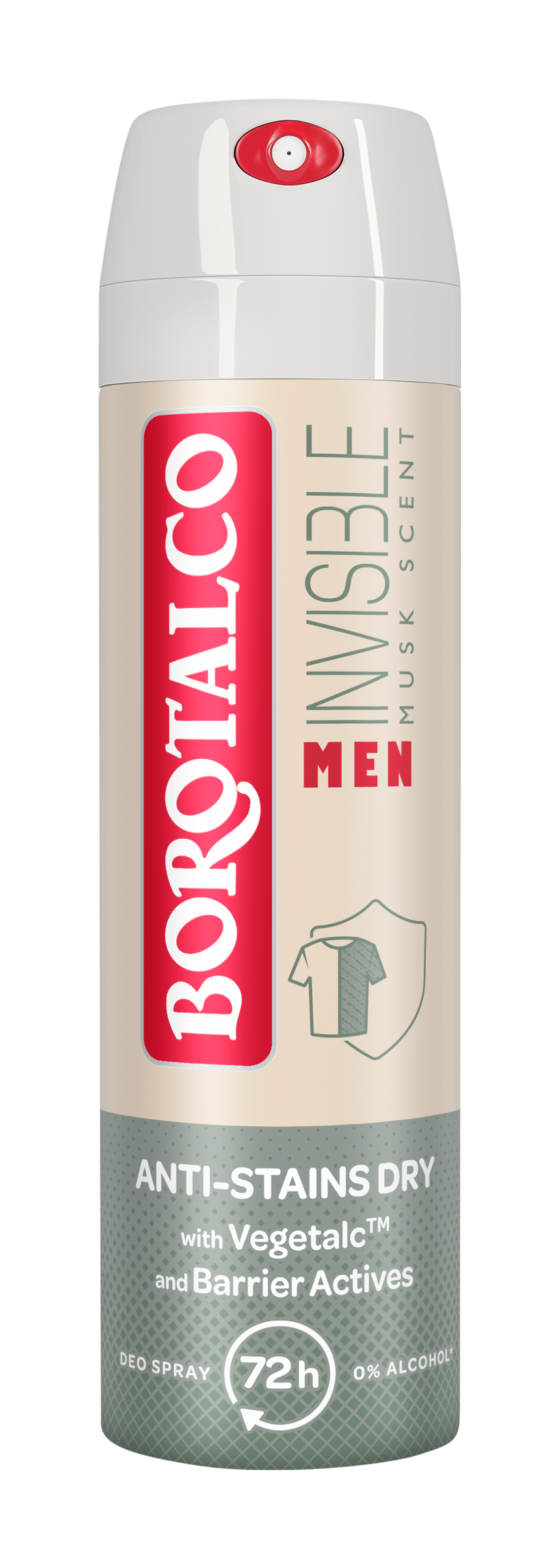 Oddejte se novému Borotalco Men zážitku! Exkluzivní složení obohacené inovativním VegetalcTM, směsí absorpčních prášků rostlinného původu, a absorpční účinné látky, nabízí extra suchou ochranu, díky které se budete cítit bezpečně a v pohodě, vždy připraveni na jakoukoli výzvu. 72hodinová účinnost deodorantu. 0% alkoholu*. Dermatologicky testováno. Vůně mošusu: harmonická kombinace hřejivých mošusových esencí prosvětlená aromatickým akordem fougère, která v základu odhaluje intenzitu vzácných dřev a zahalujících pudrových tónů.
