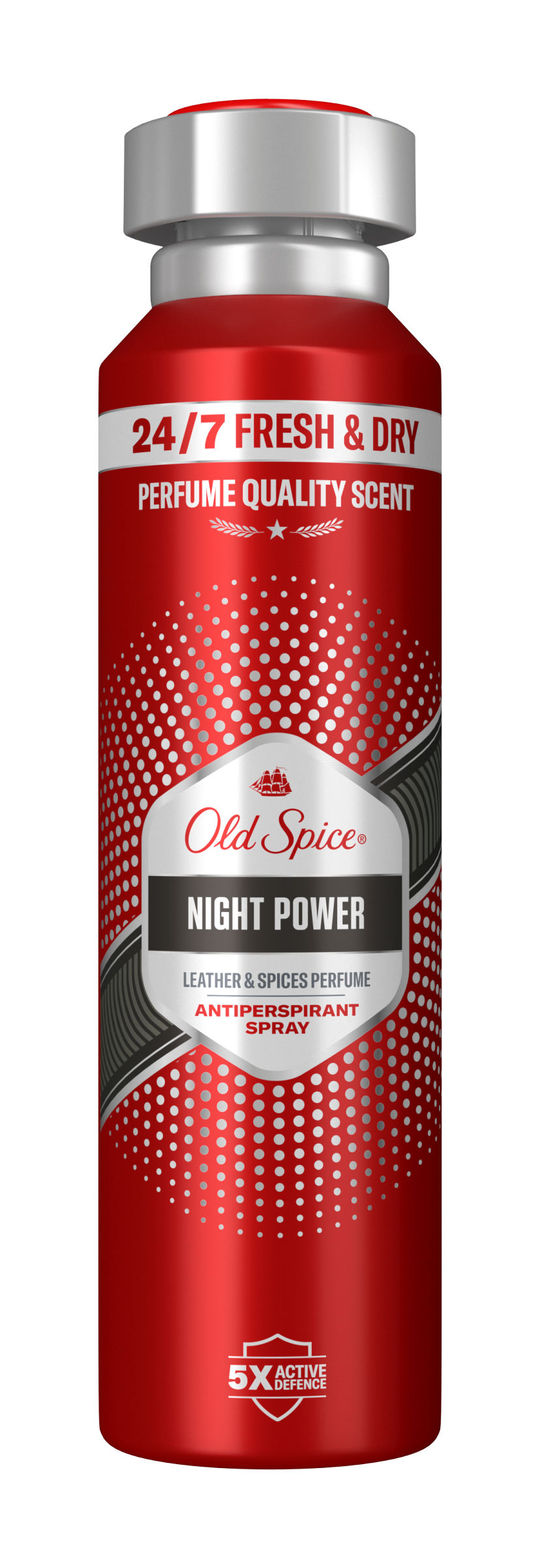 Užij si dlouhotrvající ochranu před potem a vůni parfémové kvality. Antiperspirant ve spreji Old Spice ti zajistí nepřetržitou svěžest a pocit sucha* 24 hodin denně, 7 dní v týdnu s voňtastickou sebedůvěrou. Začni posilovat s Old Spice Night Power Ponoř se do svůdné symfonie Leather & Spices s hřejivým kardamomem, vůní tonky a esenciálními tóny jantaru. Složení 5× Active Defence: parfém s dlouhou výdrží, ochrana před zápachem, ochrana před potem, aktivace vůně potem a technologie proti vyprchání vůně, která ti pomůže snadno zvládnout vše, co se děje ve tvém podpaží. Tento antiperspirant ve spreji nabízí ochranu proti zápachu a potu v jediné aplikaci. Zůstaneš v suchu, budeš skvěle vonět po celý den a zároveň udržíš otravné bílé stopy na uzdě.