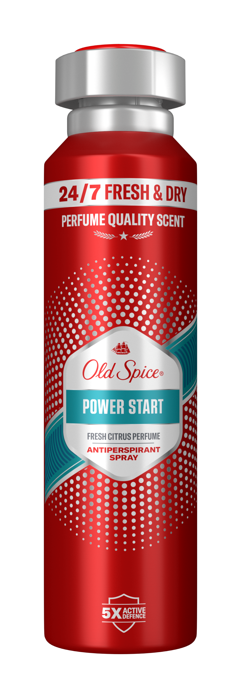 Užij si dlouhotrvající ochranu před potem a vůni parfémové kvality. Antiperspirant ve spreji Old Spice ti zajistí nepřetržitou svěžest a pocit sucha* 24 hodin denně, 7 dní v týdnu s voňtastickou sebedůvěrou. Začni den s Old Spice Power Start Ponoř se do povzbuzující symfonie vůně Old Spice Power Start Fresh Citrus s limetkou, pelargonií a cedrovým dřevem, která nastartuje tvůj den záplavou svěžesti. Složení 5× Active Defence: parfém s dlouhou výdrží, ochrana před zápachem, ochrana před potem, aktivace vůně potem a technologie proti vyprchání vůně, která ti pomůže snadno zvládnout vše, co se děje ve tvém podpaží. Tento antiperspirant ve spreji nabízí ochranu proti zápachu a potu v jediné aplikaci. Zůstaneš v suchu, budeš skvěle vonět po celý den a zároveň udržíš otravné bílé stopy na uzdě.