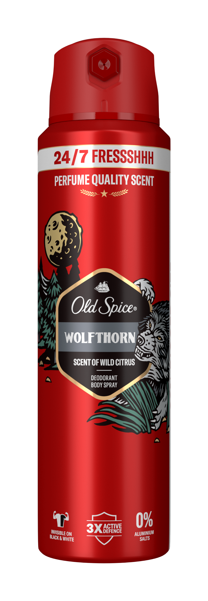 Dopřej si svěžest* 24 hodin denně, 7 dní v týdnu a voňtastické sebevědomí díky Wolfthorn deodorantu ve spreji Old Spice. A s touto úrovní bezstarostné svěžesti se můžeš soustředit na vyšší cíle, jako je uzavírání velkých obchodů nebo učení delfínů lidské řeči. Uvolněte složení 3x Active Defence: Dlouhotrvající vůně / ochrana před zápachem / se složkami proti zápachu, takže budete vonět legendárně 24 hodin denně, 7 dní v týdnu*. Svěží vůně divokých citrusů, tropického ovoce, šťavnaté mandarinky se špetkou vanilky zdůrazní tvou nezkrotnou povahu. A zmínili jsme, že neobsahuje žádné hliníkové soli a zároveň je neviditelný na černém i bílém oblečení? Protože je to tak.