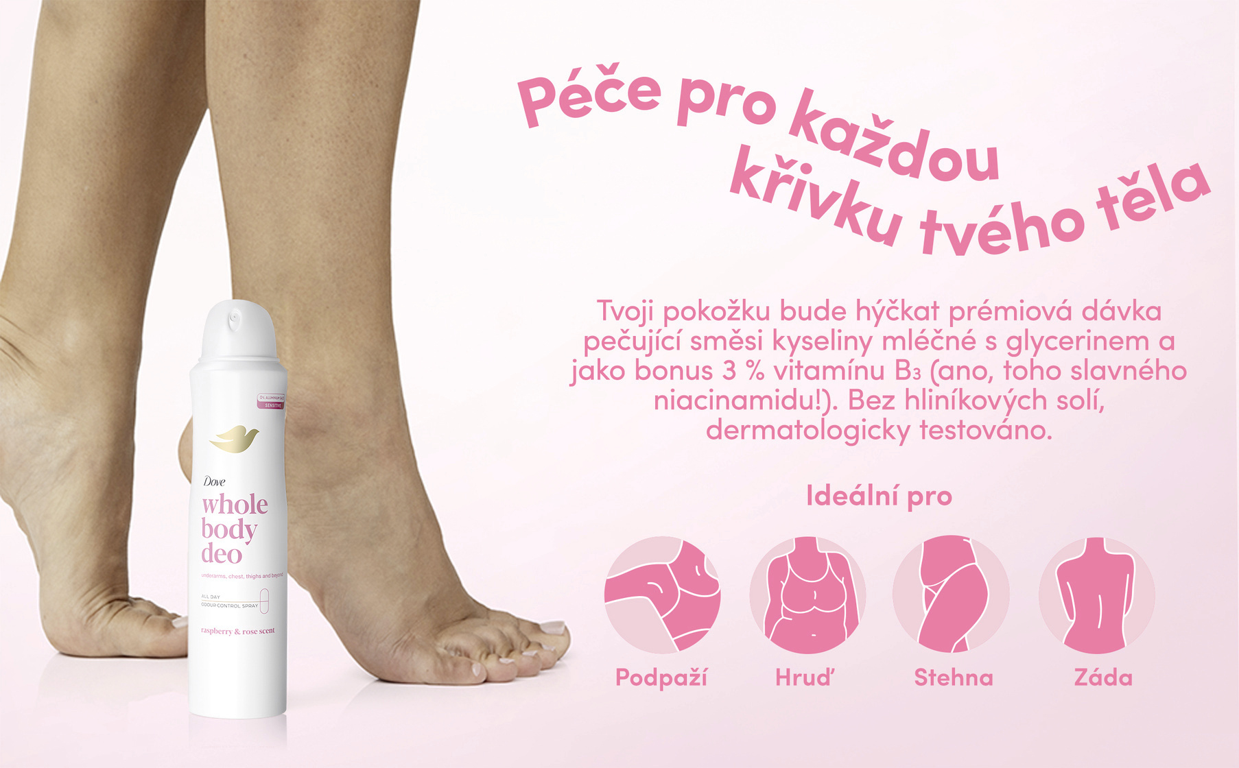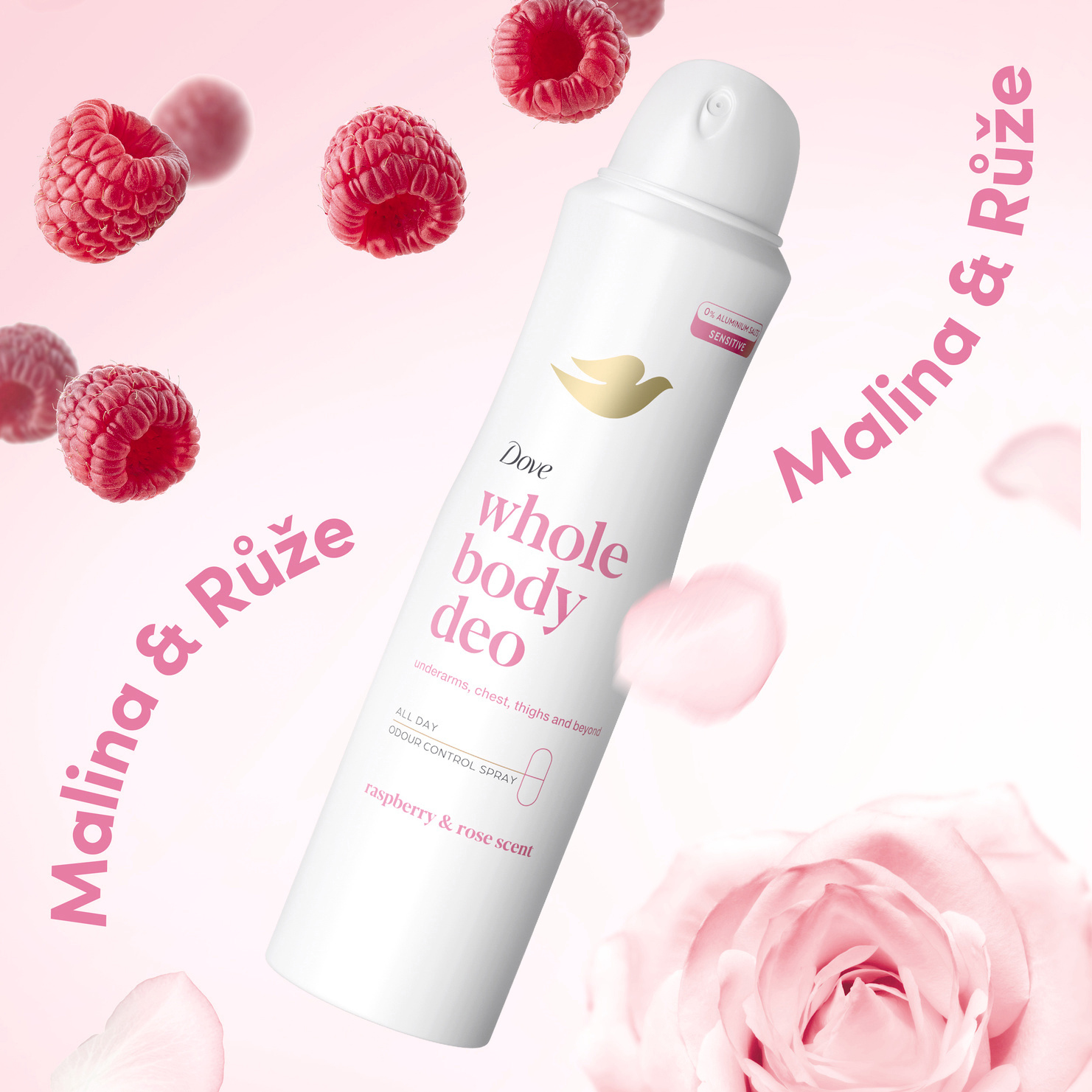 Objev jemnou péči s deodorantem na celé tělo od Dove s vůní maliny a růže. Tento sprej je navržen pro každodenní použití na citlivá místa jako podpaží, hrudník, nohy a další části těla. Neobsahuje hliník, je dermatologicky testovaný a vhodný i pro citlivou pokožku. Spolehlivě tě ochrání před tělesným zápachem a zároveň poskytne dlouhotrvající svěžest. Jemné složení se rychle vstřebává, nezanechává zbytky na pokožce a zanechává příjemný pocit čistoty. Malina a růže dodávají deodorantu ovocně-květinový charakter, který tě provází po celý den.