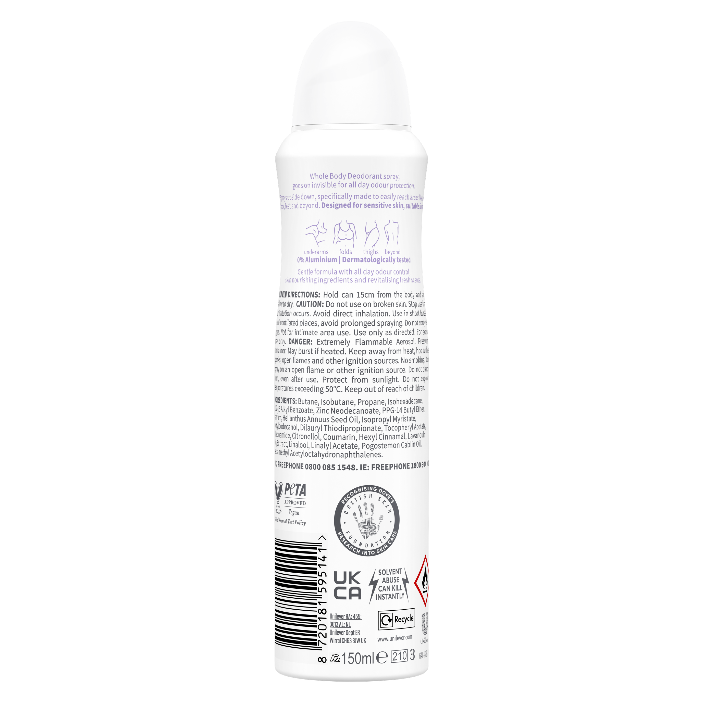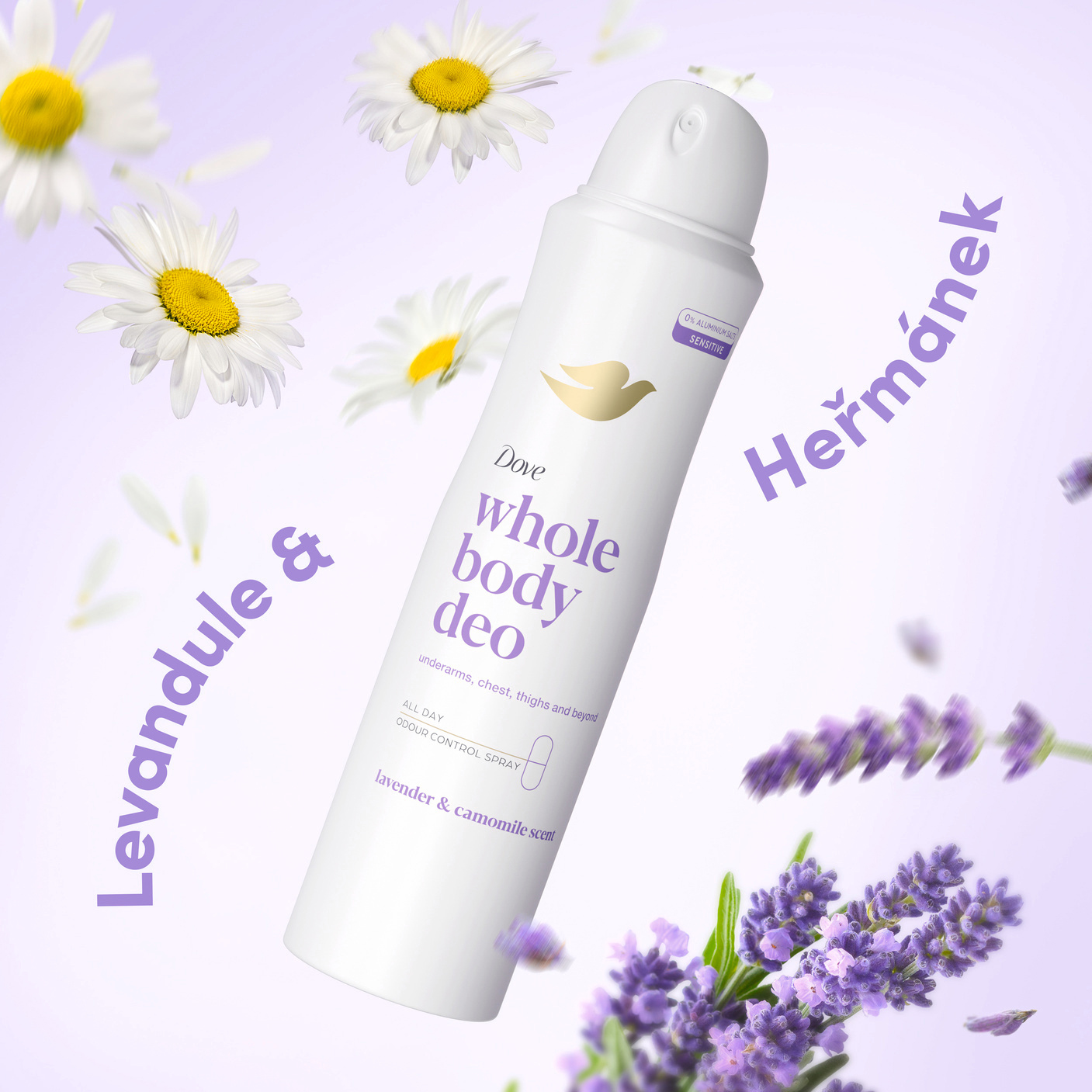 Objev jemnou péči s deodorantem na celé tělo od Dove s vůní levandule a heřmánku. Tento sprej je navržený pro každodenní použití na citlivá místa jako jsou podpaží, hrudník, nohy a další části těla. Je bez obsahu hliníku, dermatologicky testovaný a vhodný i pro citlivou pokožku. Díky kombinaci účinných složek a přírodně působící vůně ti poskytne dlouhotrvající svěžest a ochranu před tělesným zápachem. Jemné složení bez zbytků na pokožce se rychle vstřebává a zanechává příjemný pocit čistoty. Levandule a heřmánek dodávají deodorantu osvěžující charakter, který tě doprovodí po celý den.