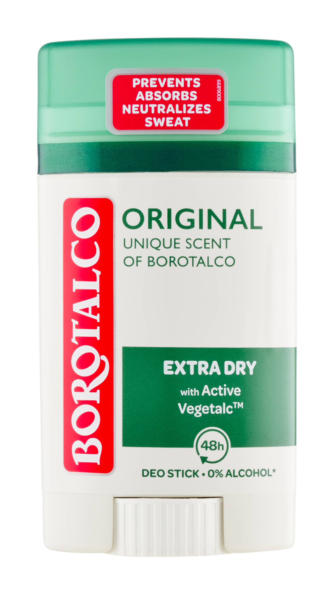 Oddejte se Borotalco zážitku s Borotalco Original! Jeho složení obohacené inovativním Active VegetalcTM, směsí absorpčních prášků rostlinného původu, nabízí trojitou ochranu proti pocení a extra suchý účinek, abyste se vždy cítili v pohodě: – Zabraňuje pocení a omezuje jeho tvorbu – Absorbuje pot hned, jak se objeví – Neutralizuje molekuly tvořící pot 48hodinová účinnost deodorantu. 0% alkoholu*. Dermatologicky testováno. Jedinečné a nadčasové aroma, které kombinuje svěžest citrusových plodů s jemným srdcem z bílých květů na pudrovém základu. Typicky italská vůně, původní od roku 1904.