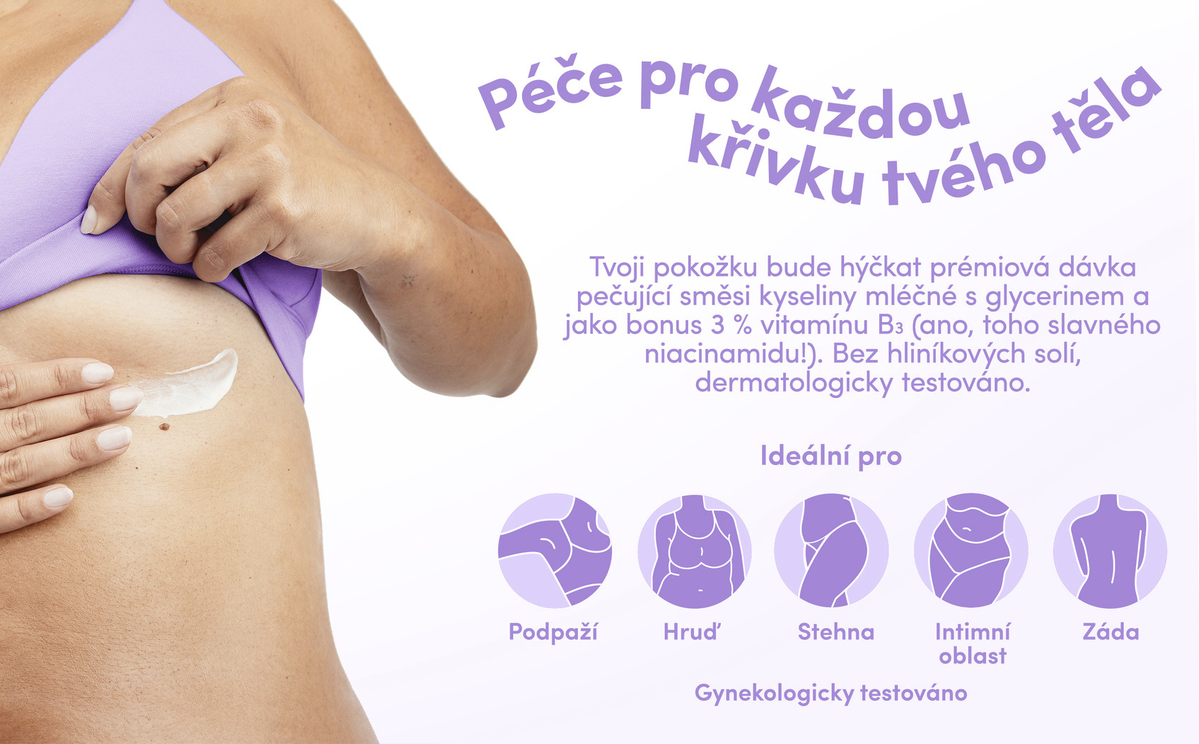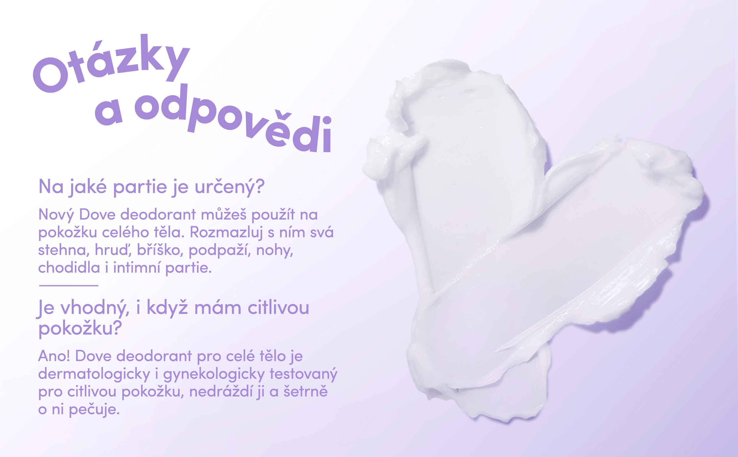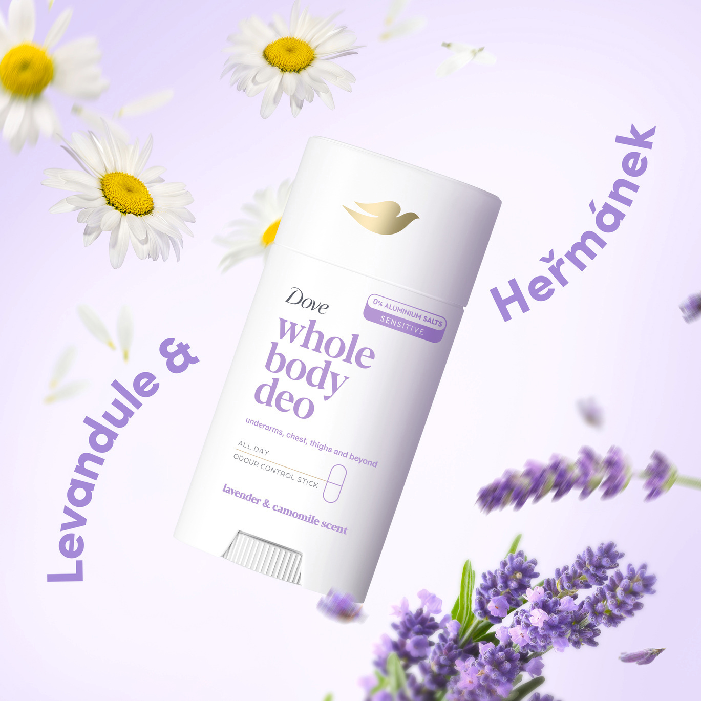 Objev péči o celé tělo s tuhým deodorantem Dove s vůní levandule a heřmánku Tento tuhý deodorant kombinuje účinnou ochranu proti tělesnému zápachu s jemnou péčí o pokožku. Je navržený pro každodenní použití na citlivé oblasti jako jsou podpaží, hrudník, stehna, kožní záhyby a další části těla. Dermatologicky testované složení je vhodné pro citlivou pokožku, ale i pro všechny typy pleti. Díky pečující receptuře s aktivními látkami proti zápachu a výživnými složkami poskytuje deodorant dlouhotrvající svěžest a zároveň podporuje regeneraci podrážděné pokožky. Osvěžující vůně levandule a heřmánku tě bude doprovázet po celý den.