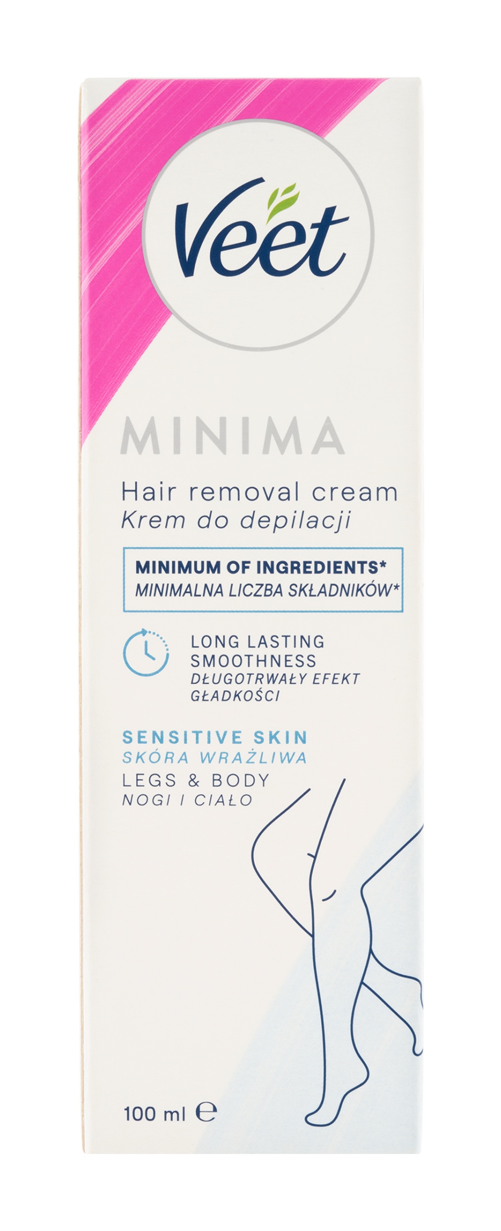 Objev Veet Minima Depilační krém na nohy a tělo pro citlivou pokožku. Složení s minimálním množstvím ingrediencí* pro dlouhotrvající hebkost pokožky. Bez zápachu amoniaku**. *Složení s nejmenším počtem ingrediencí ve srovnání s ostatními krémy Veet. **Díky odstranění ingrediencí, které zápach způsobovaly.