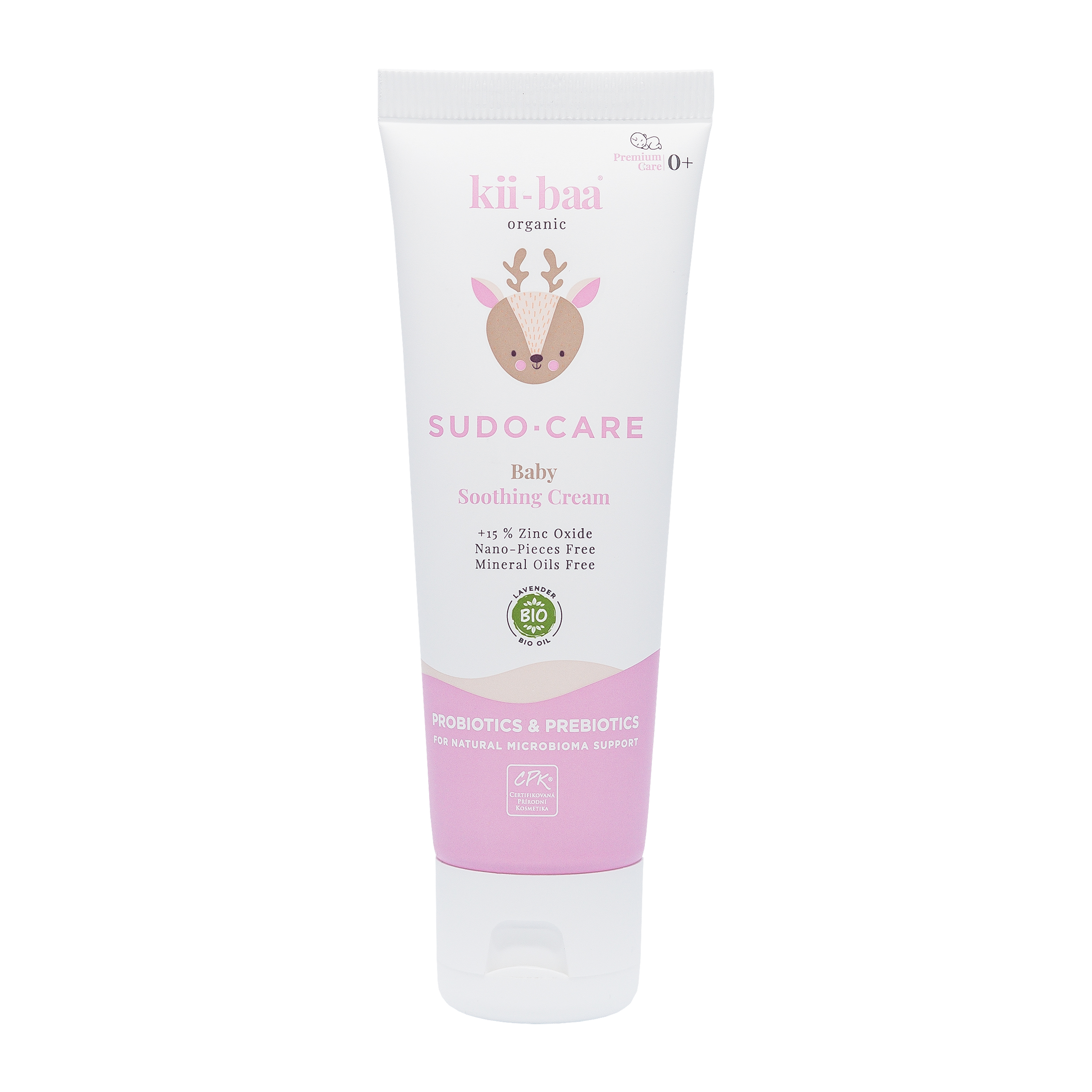 Zklidňující ochranný krém kii-baa® organic s probiotiky a prebiotiky a vysokým obsahem zinku bez nanočástic.
