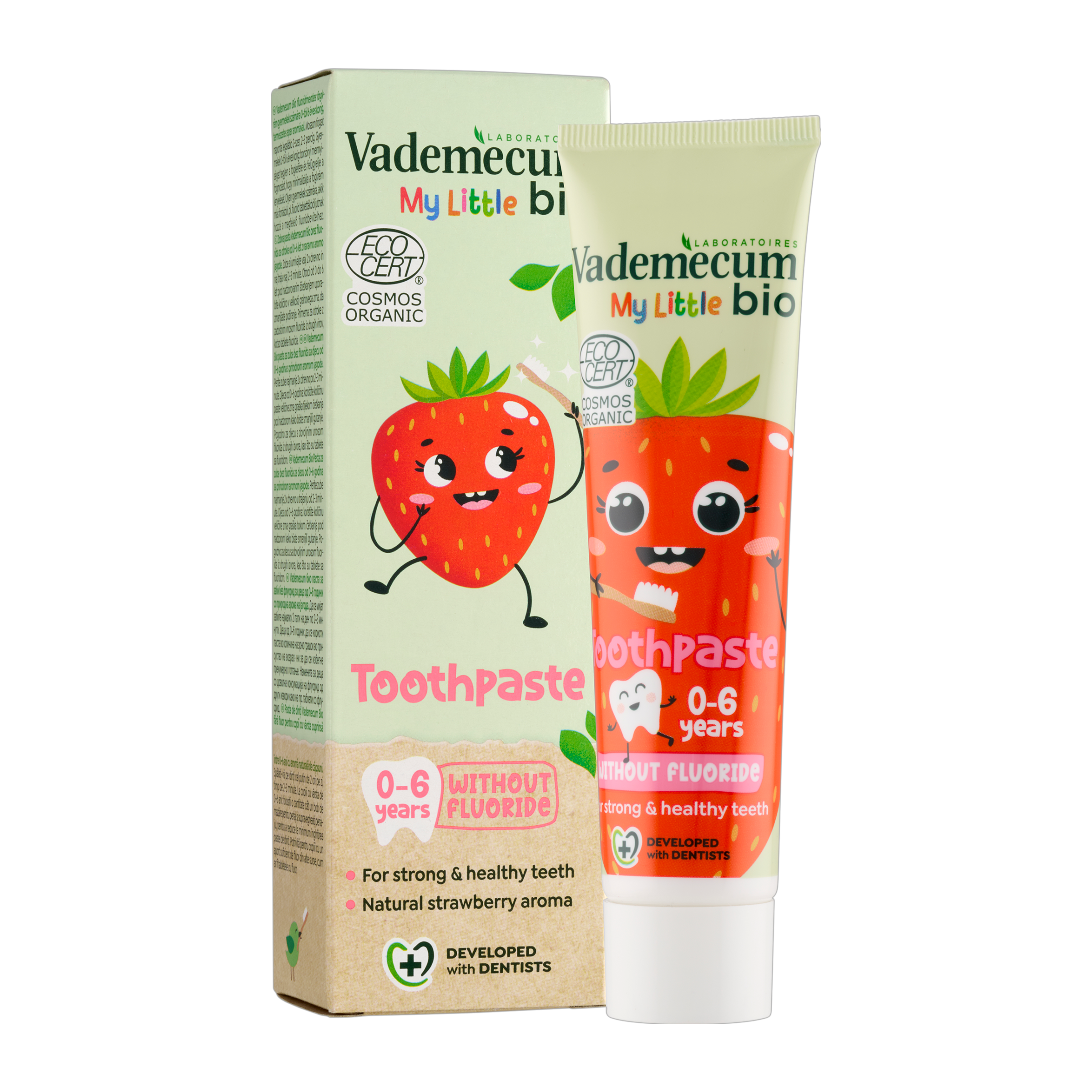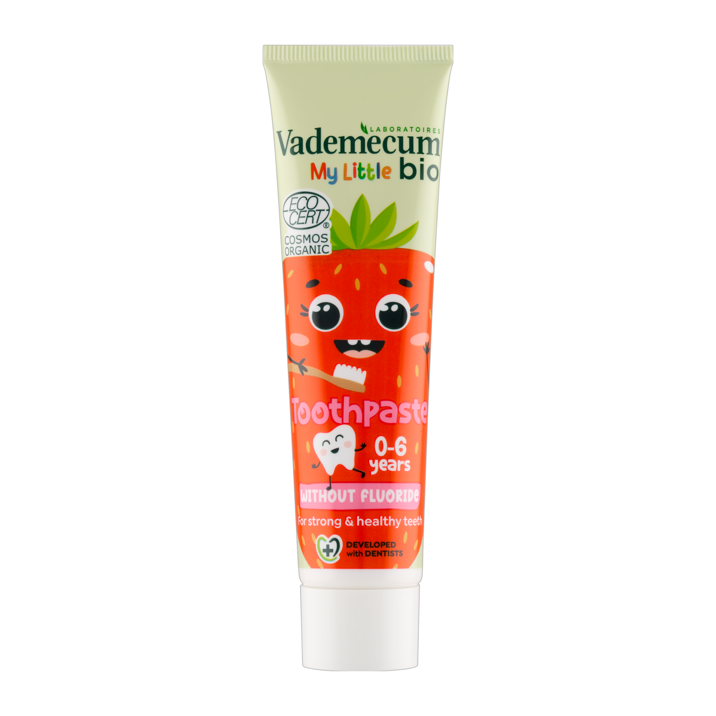 Vademecum BIO zubní pasta pro děti ve věku 0-6 let s přírodním jahodovým aroma. Bez fluoridu. Certifikováno u Ecocert Greenlife jako COSMOS ORGANIC podle COSMOS standardů: