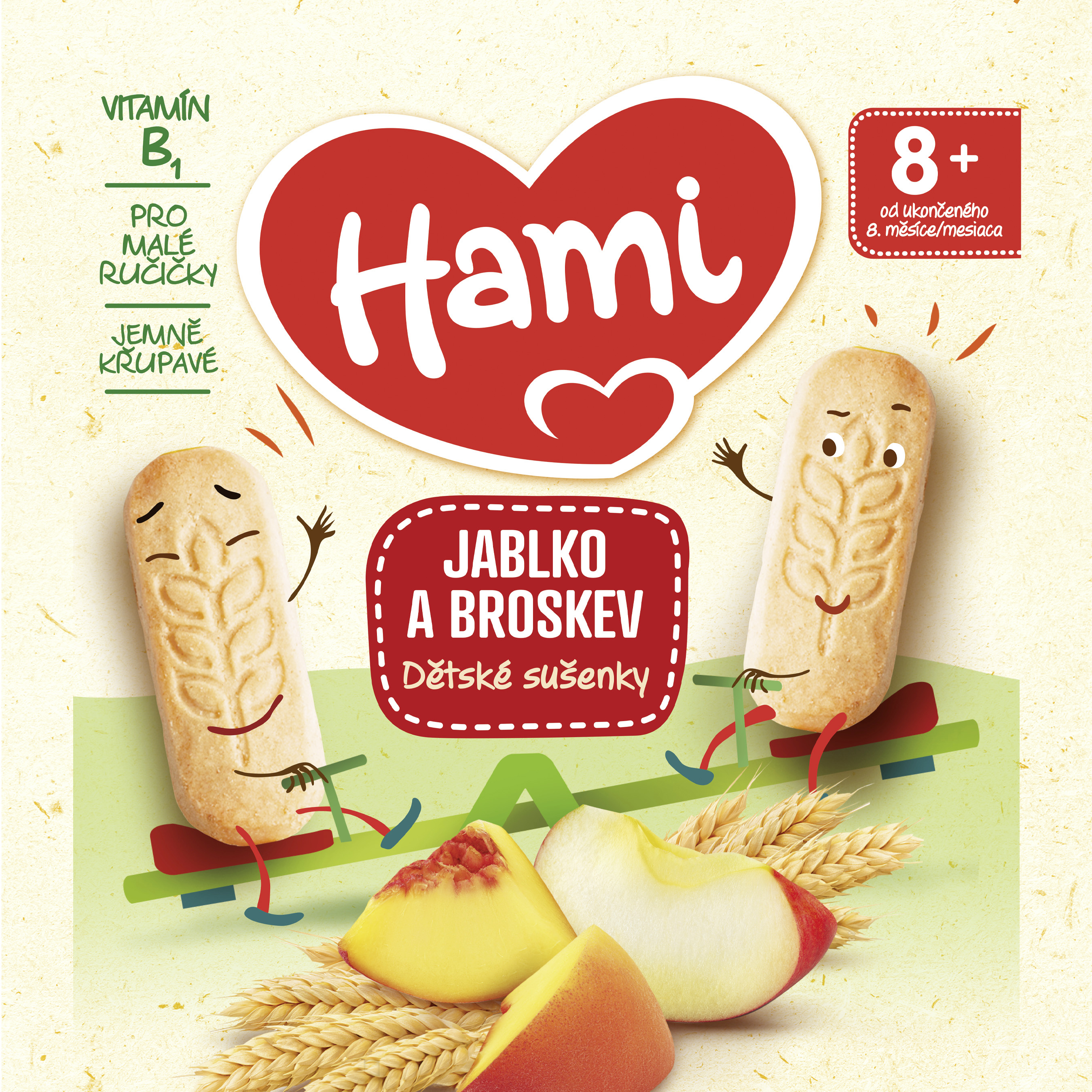 Dětské sušenky Hami jablko broskev jsou vyrobené z pečlivě vybraných obilovin, obsahují špaldovou mouku, vitamín B1 a jsou vhodné pro první zoubky. Užijte si objevování pestrých chutí s Hami! Hami - v příkrmech jsme s vámi. V Hami věříme, že na všem, co vaše děťátko ochutná a prožije v prvních letech jeho života, opravdu záleží.