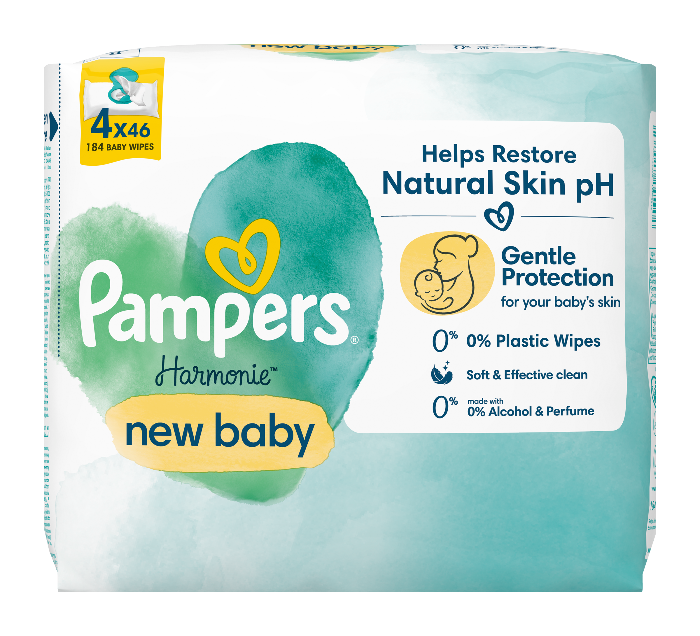 Šetrná péče a ochrana citlivé pokožky vašeho děťátka. Čisticí ubrousky Pampers Harmonie New Baby jsou šetrnější než vodou navlhčená bavlněná látka. Šetrné čisticí a ochranné složky pomáhají díky svému jedinečnému složení obnovovat přirozené pH pokožky, a tak ji chrání před podrážděním. Neobsahují alkohol a nejsou parfemované. Složení je dermatologicky testováno. Jsou schváleny dermatology z organizace Skin Health Alliance a certifikované podle normy Oeko-Tex Standard 100.