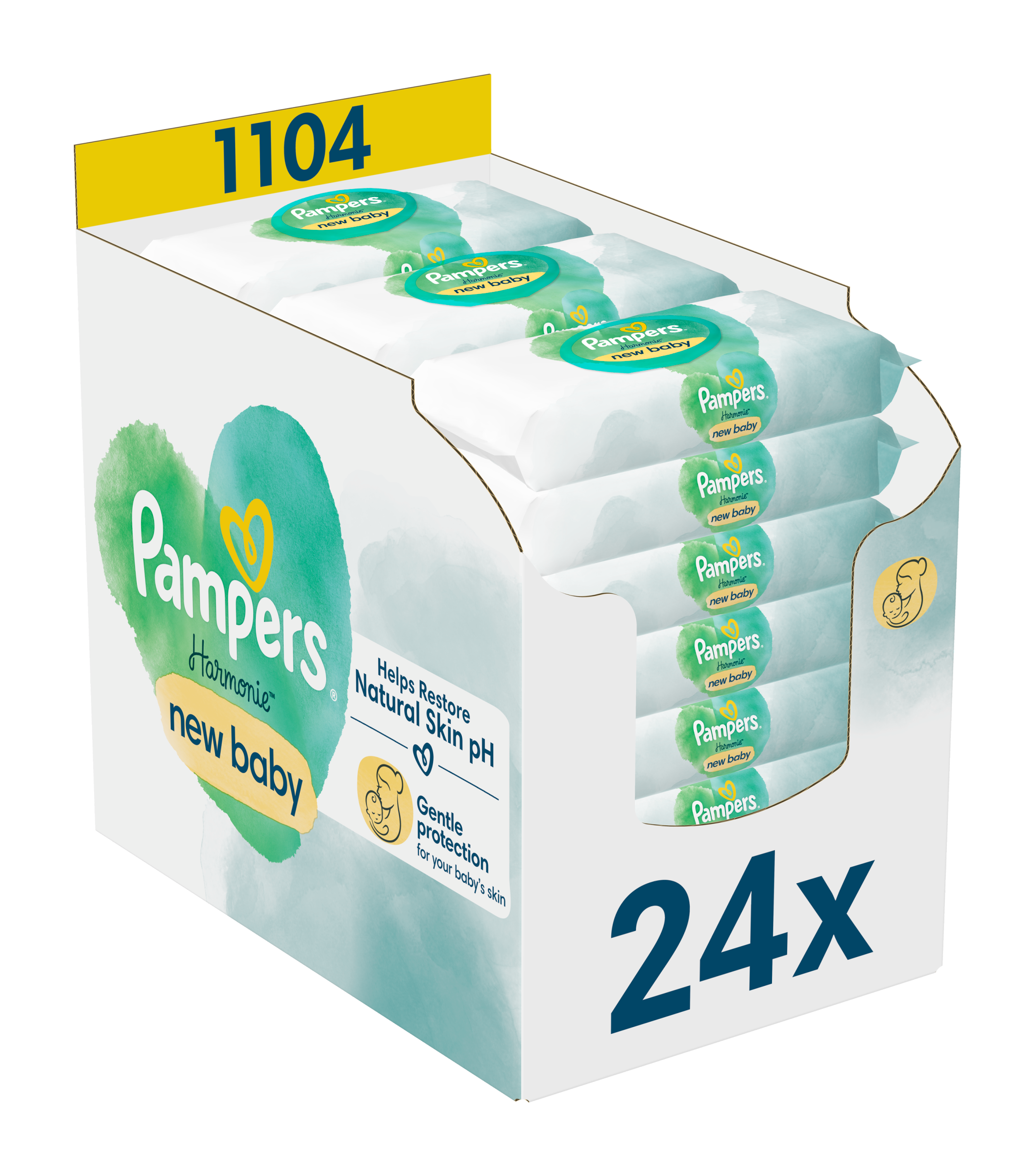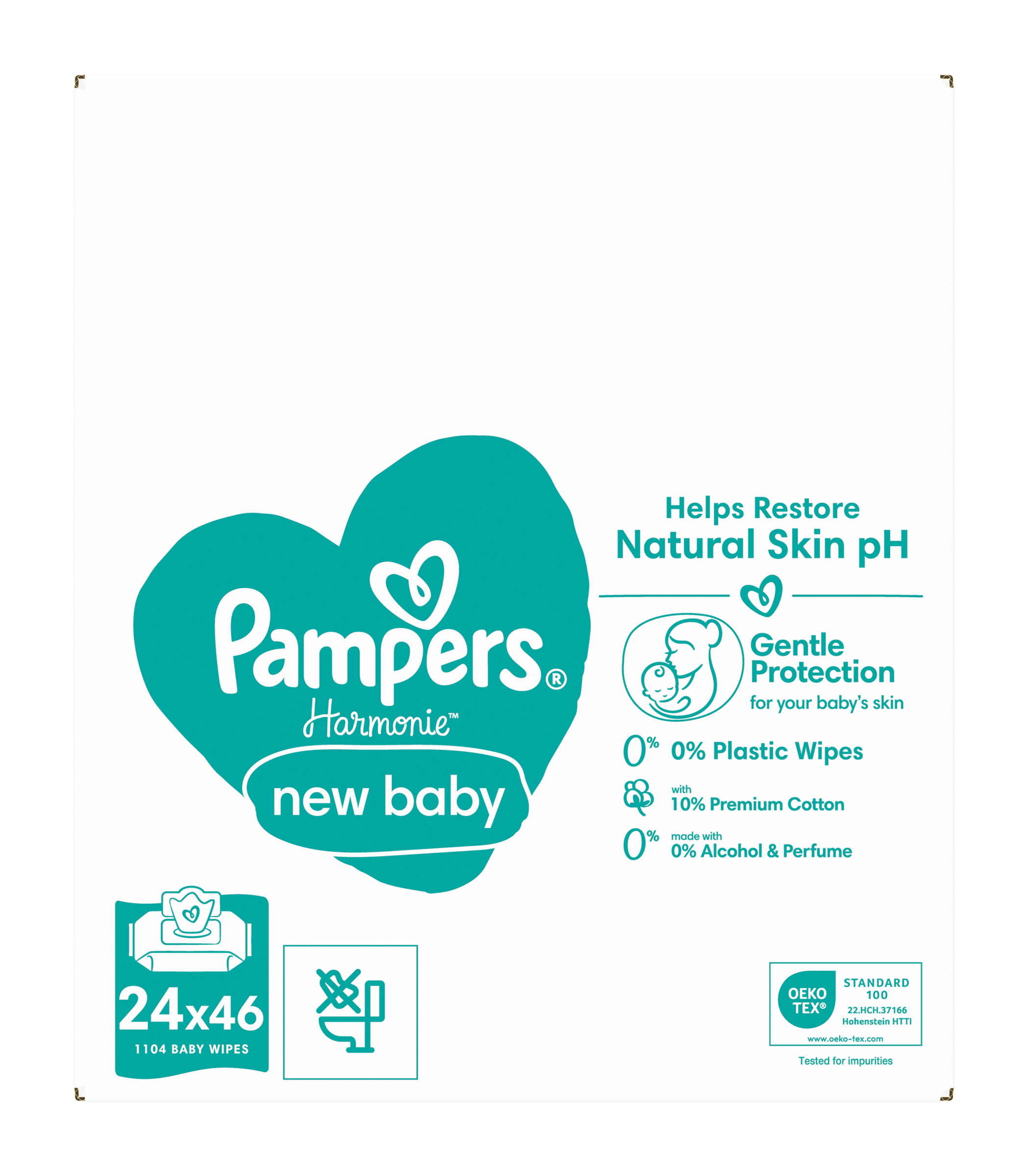 Šetrná péče a ochrana citlivé pokožky vašeho děťátka - s kapkou aloe vera. Čisticí ubrousky Pampers Harmonie New Baby jsou šetrnější než vodou navlhčená bavlněná látka. Šetrné čisticí a ochranné složky pomáhají díky svému jedinečnému složení obnovovat přirozené pH pokožky a tak ji chrání před podrážděním. Neobsahují alkohol, nejsou parfemované, se 100% rostlinnými vlákny, 10 % z nich tvoří prémiová bavlna. Složení je dermatologicky testované a schválené dermatology z organizace Skin Health Alliance a testováno na přítomnost nečistot (definovaných normou OEKO-TEX Standard 100).