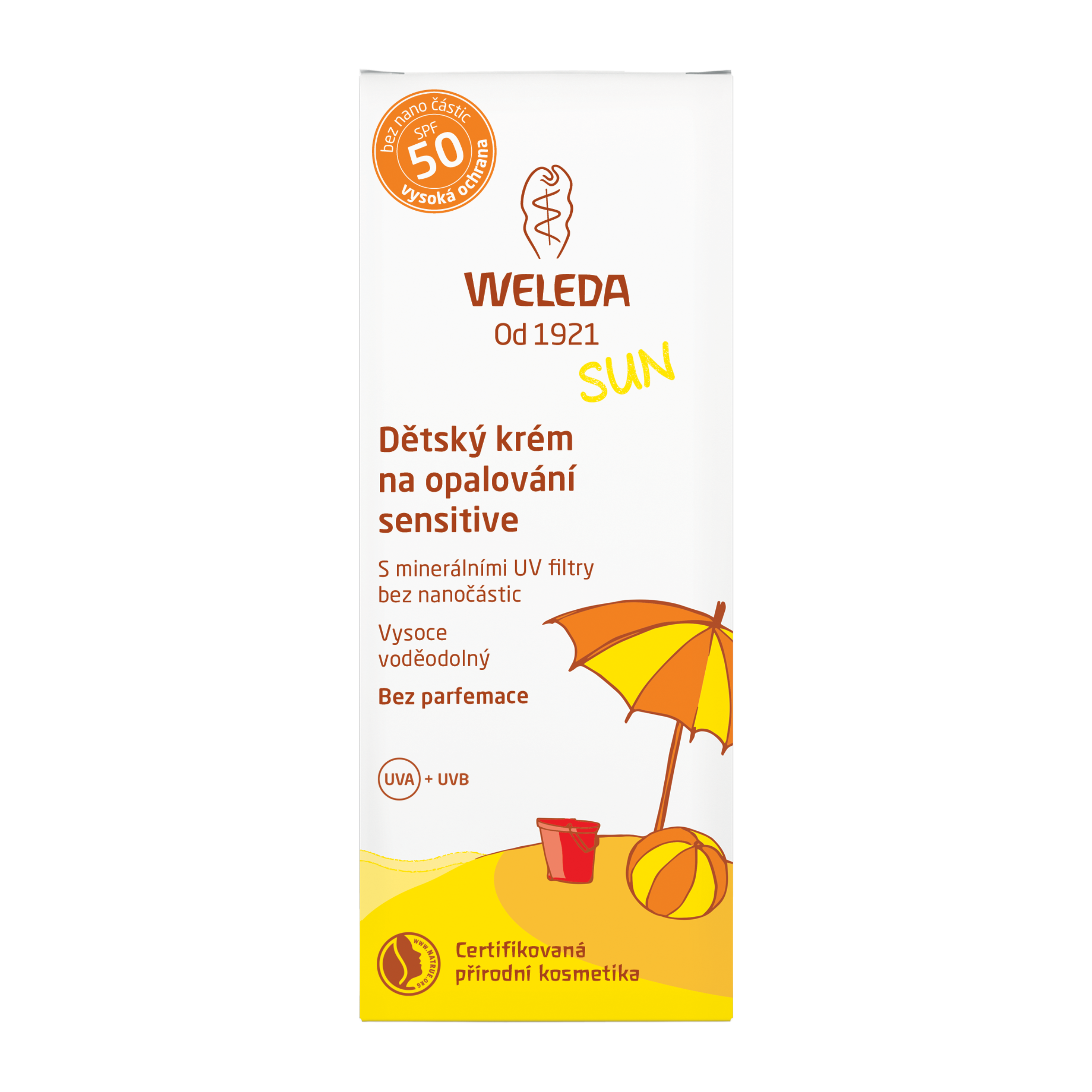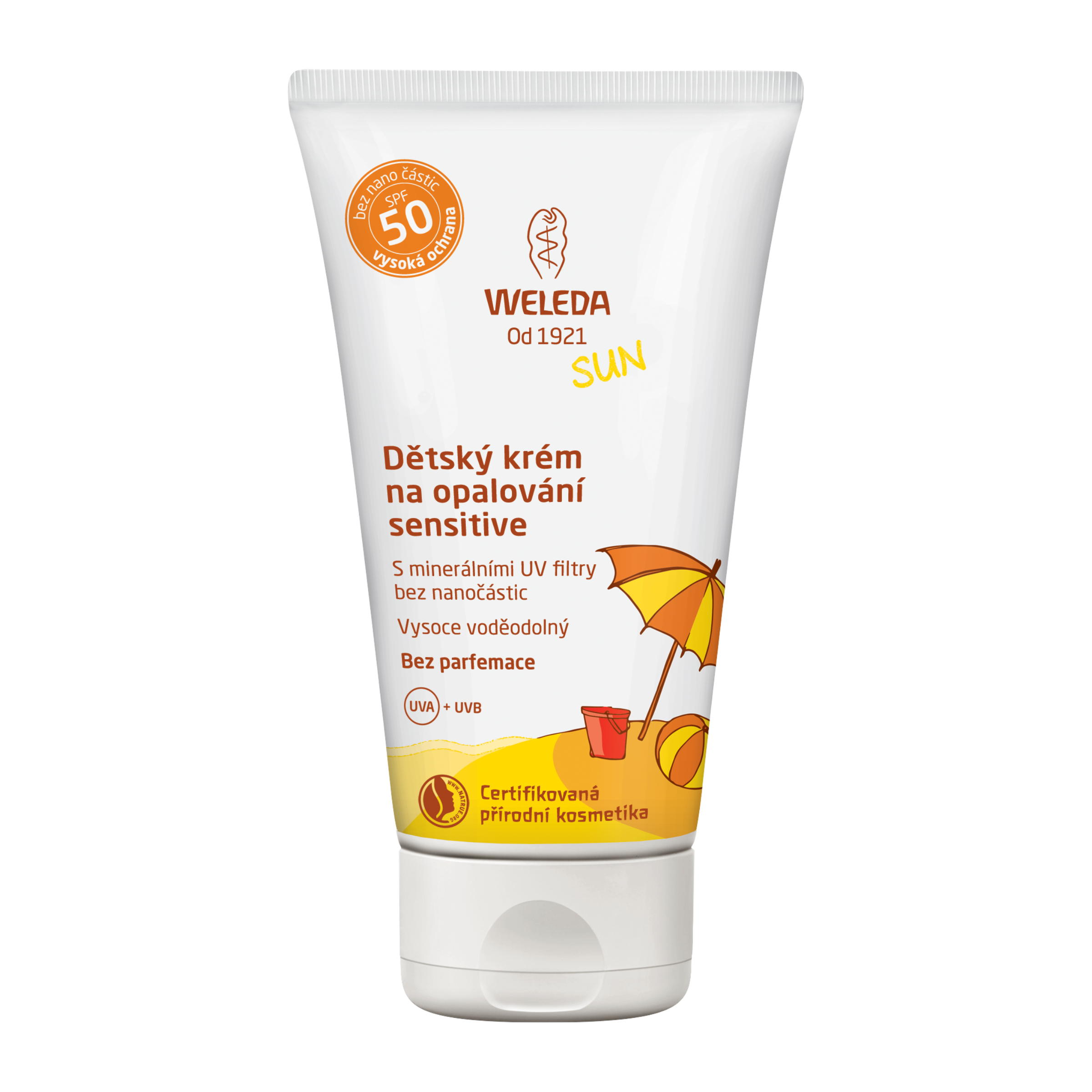 Dětský krém na opalování SPF 50 Sensitive Vysoce voděodolný krém na opalování SPF 50 bez parfemace pro děti, vhodný pro citlivou pokožku. Poskytuje spolehlivou ochranu proti UVA a UVB paprskům ihned po aplikaci. Obsahuje pouze minerální UV filtry bez nanočástic.