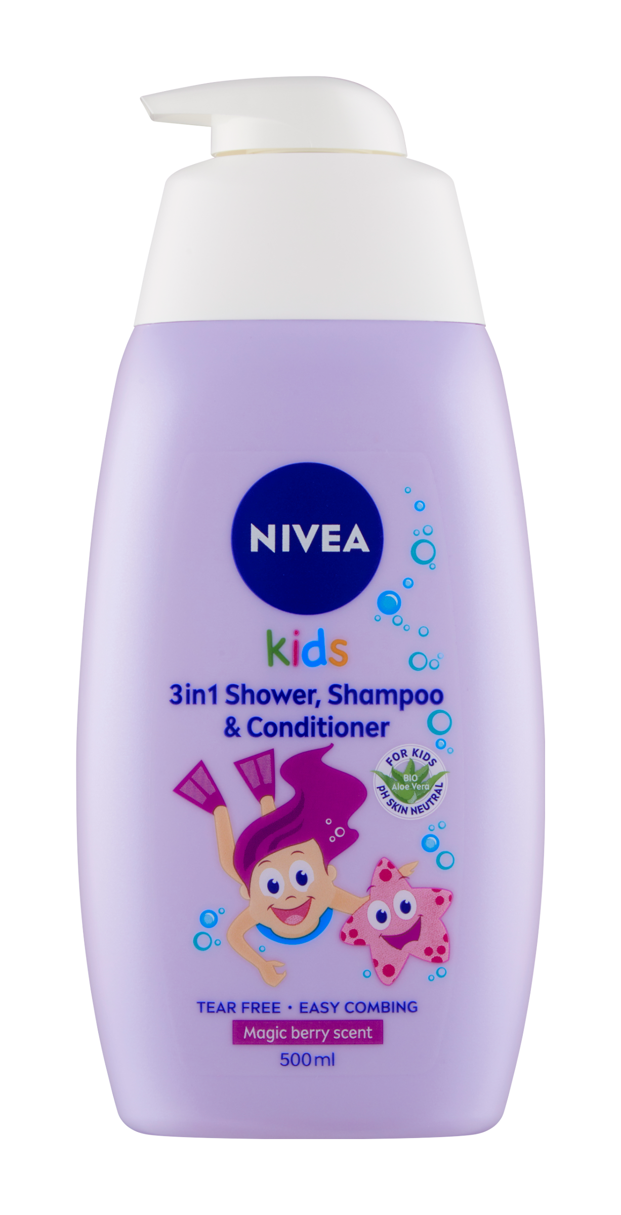 Nivea® Kids sprchový gel, šampon & kondicionér na vlasy šetrně čistí a ošetřuje dětskou pokožku a vlásky. Speciální složení bez obsahu mýdla poskytuje dětem intenzivní péči bez podráždění pokožky. Sprchový gel, šampon a kondicionér na vlasy 3 v 1 s vůní lesního ovoce zpříjemní každodenní koupání.