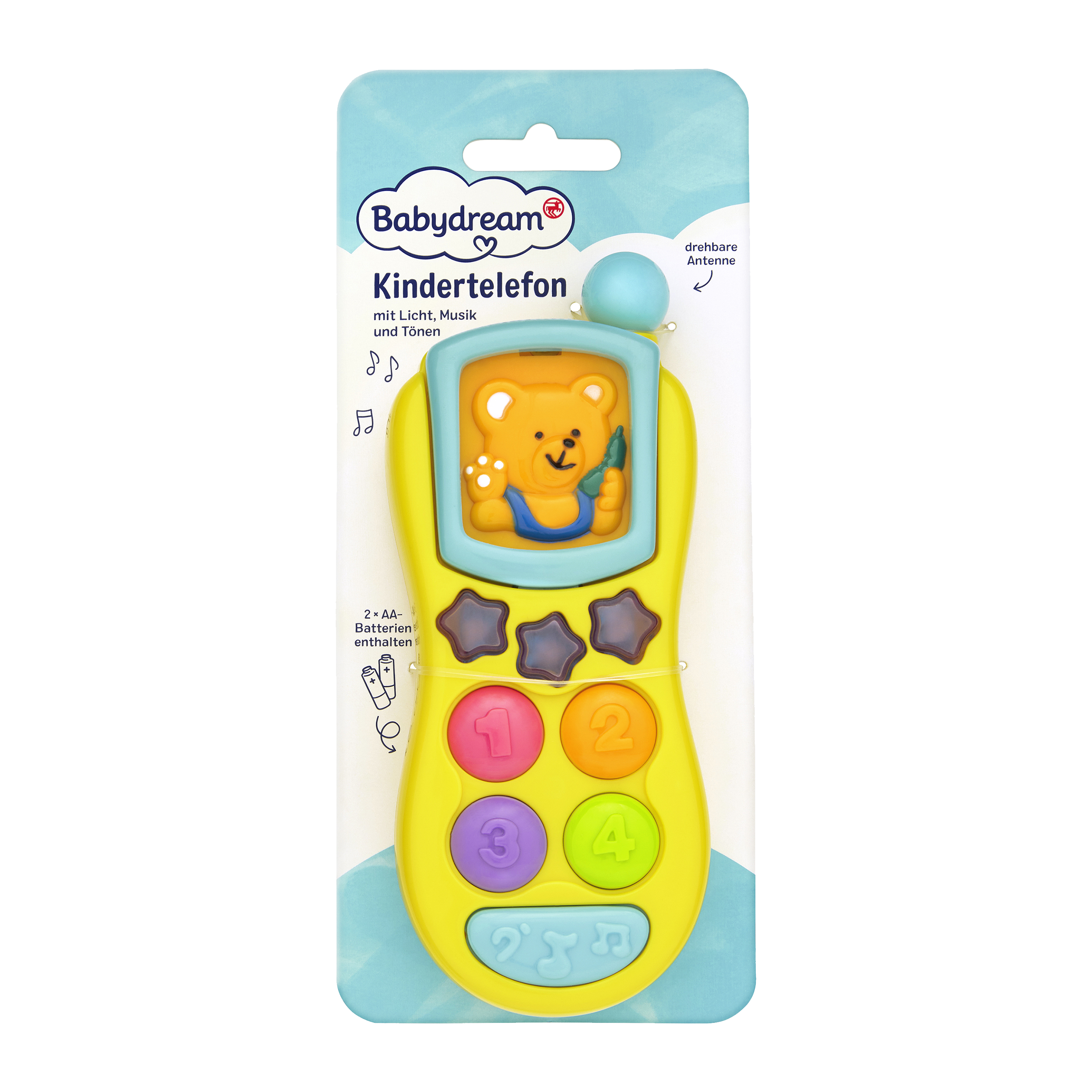 Funkce: Otočná anténa generuje praskavé zvuky. Teddy displej říká: „Hello“, „How are you“ a „Bye“. Klávesám 1 až 4 jsou přiřazeny různé vyzváněcí zvuky. Dolní tlačítko přehrává různé melodie.