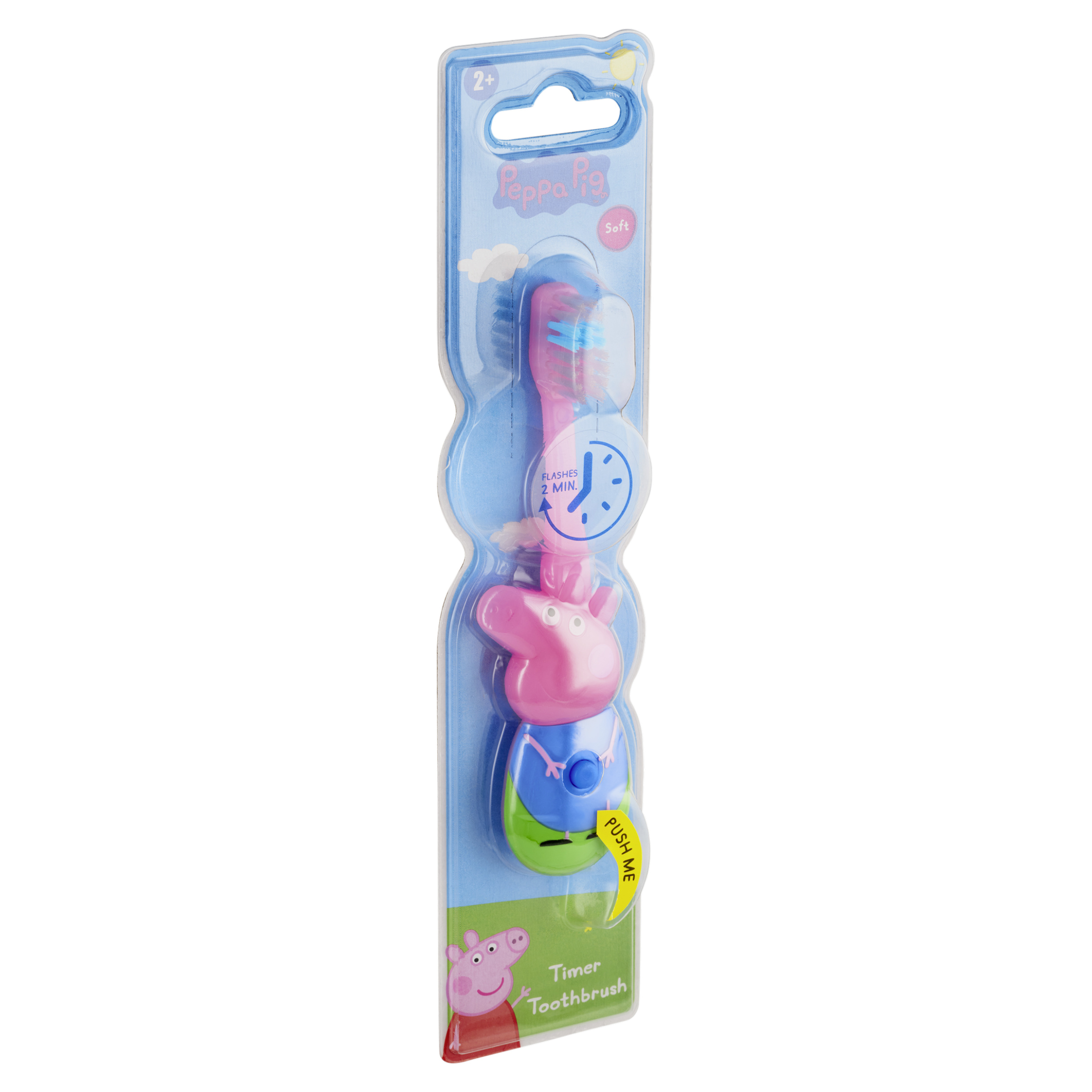 Dětský zubní kartáček Peppa Pig bliká po stisknutí tlačítka po dobu 2 minut. Dětem tak ukazuje správnou dobu čištění zubů. Motivuje děti k pravidelné hygieně a návykům péče o zuby. Obsahuje soft DuPont vlákna. Baterie nelze vyměnit.