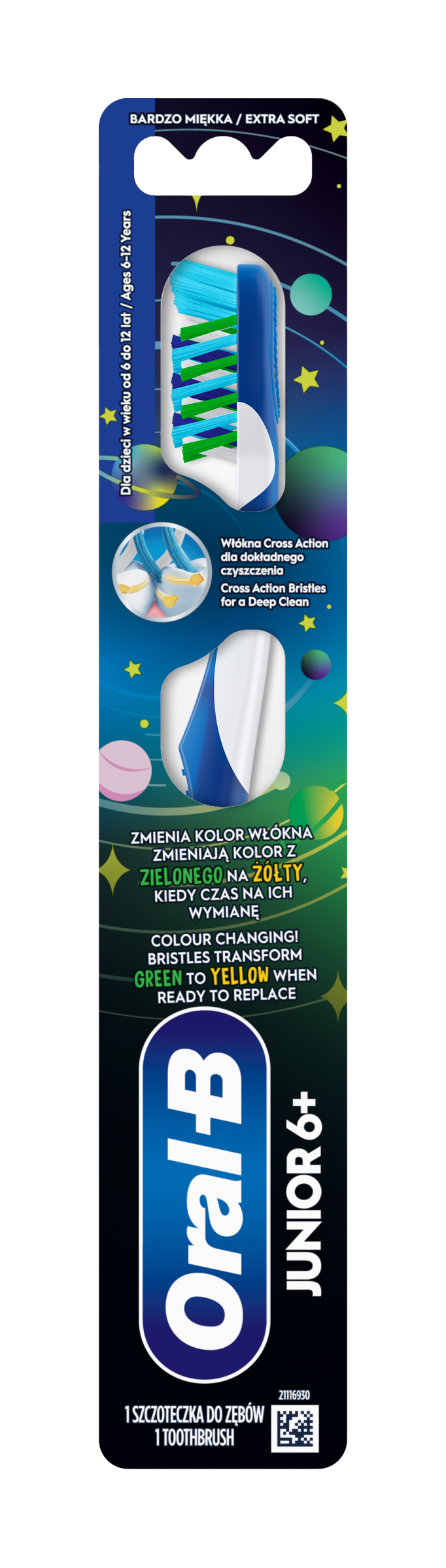 S kartáčkem ORAL-B JUNIOR 6+ si uděláte z čištění zubů neobvyklé dobrodružství. Tento manuální kartáček je určen pro děti ve věku 6–12 let a čistí mléčné i trvalé zuby. Má vlákna CrissCross, která odstraňují zubní plak i z těžko přístupných míst. Vestavěná část na čištění jazyka odstraňuje bakterie z jazyka a sliznice tváří a inovativní technologie změny barvy vás upozorní, kdy je třeba kartáček vyměnit.