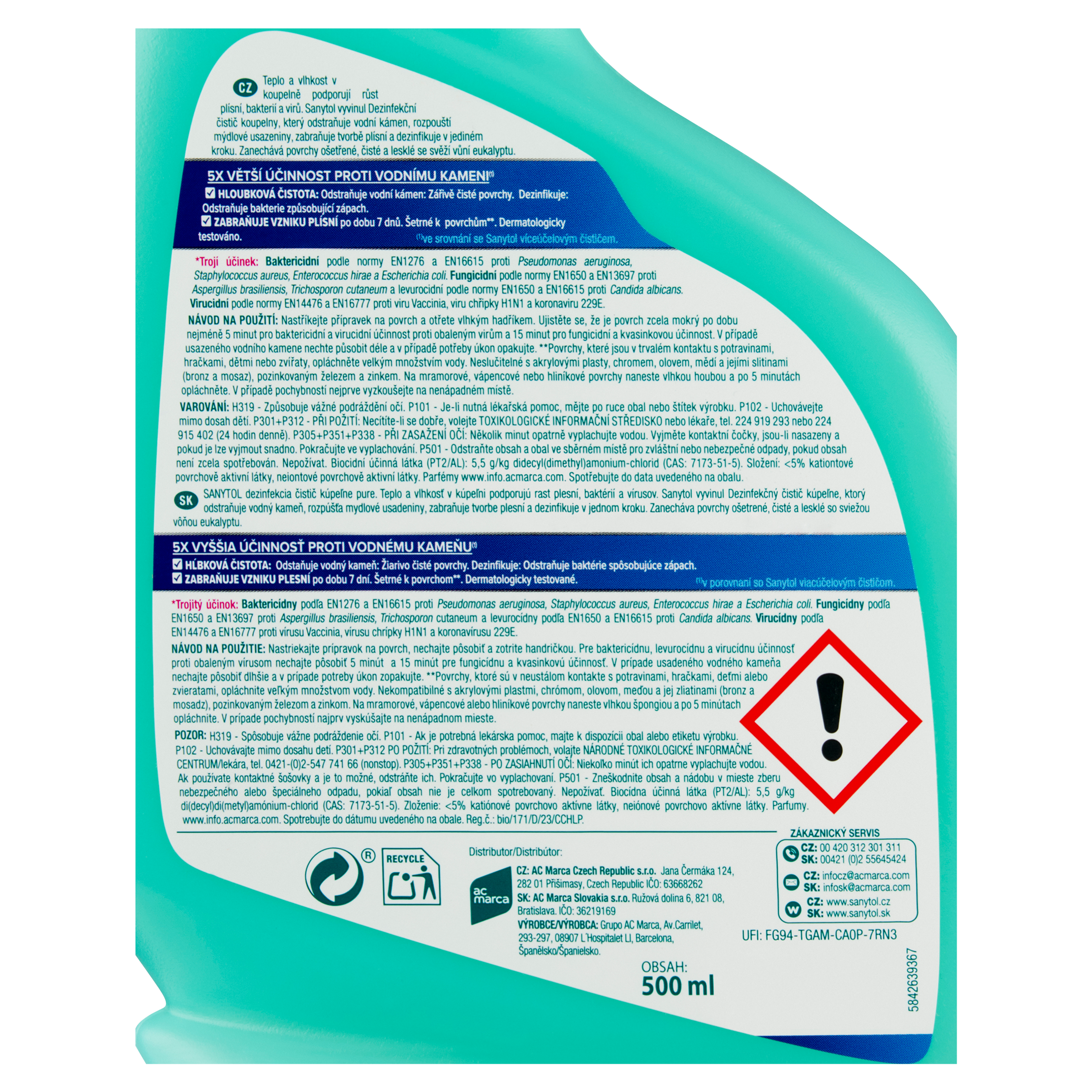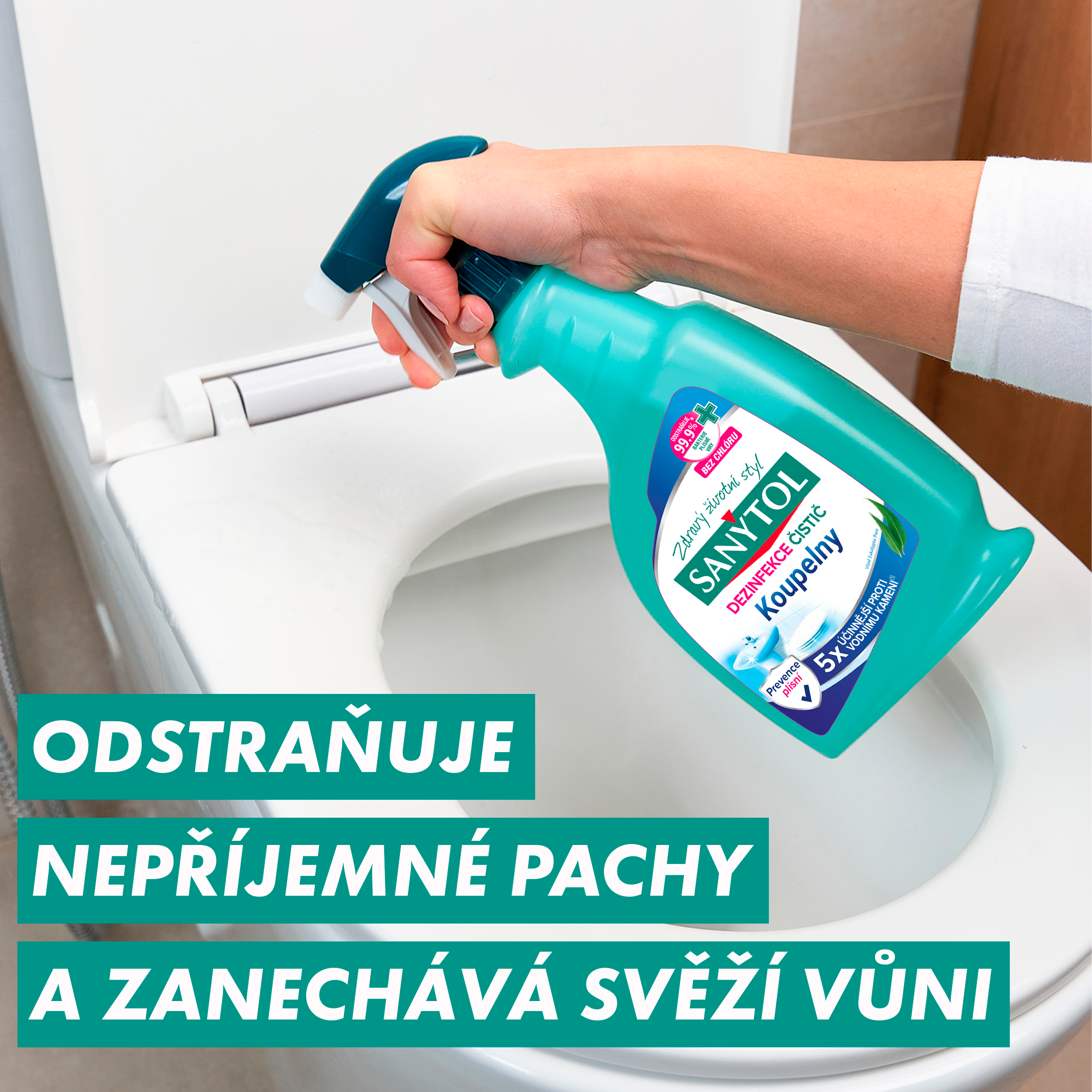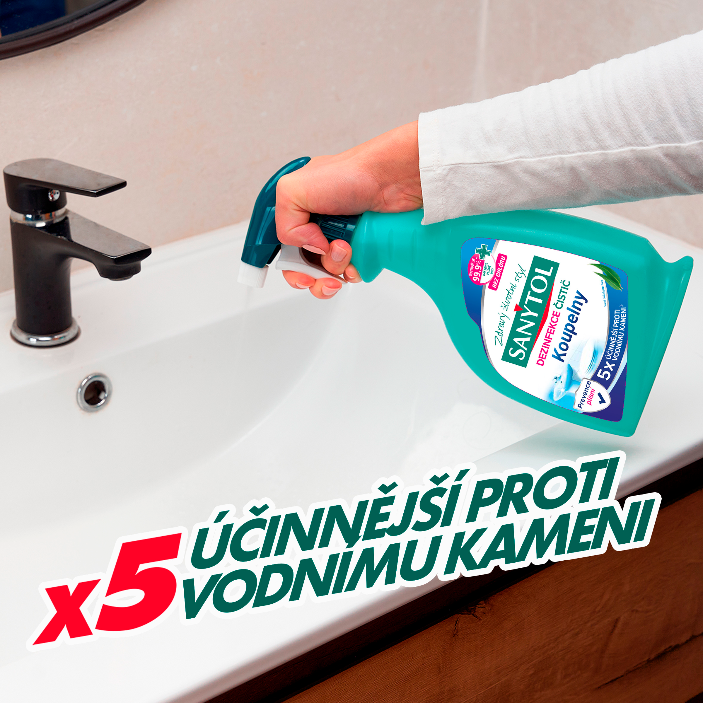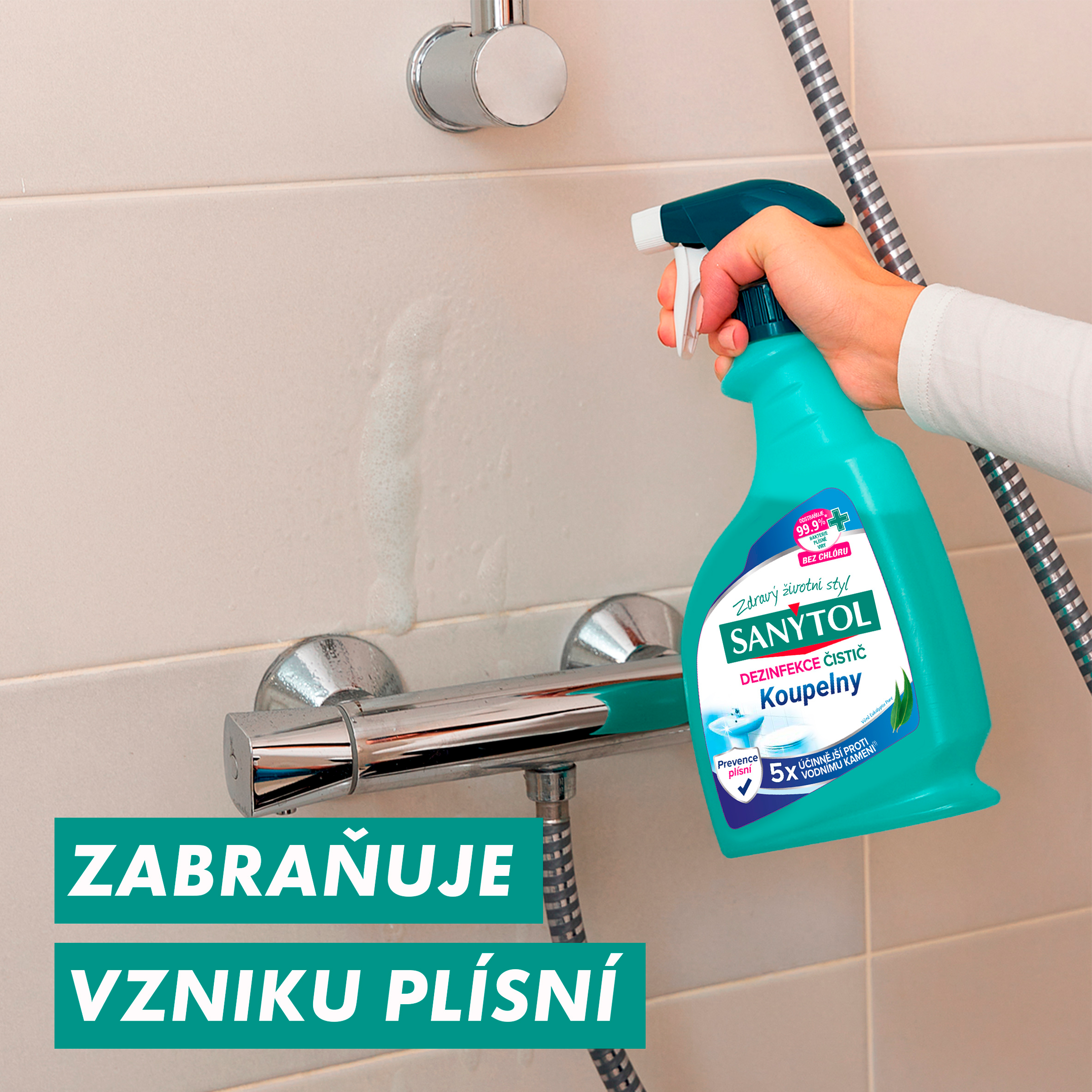 Odstraňuje *99,9%* + bakterie plísně viry. Teplo a vlhkost v koupelně podporují růst plísní, bakterií a virů. Sanytol vyvinul Dezinfekční čistič koupelny, který odstraňuje vodní kámen, rozpouští mýdlové usazeniny, zabraňuje tvorbě plísní a dezinfikuje v jediném kroku. Zanechává povrchy ošetřené, čisté a lesklé se svěží vůní eukalyptu.