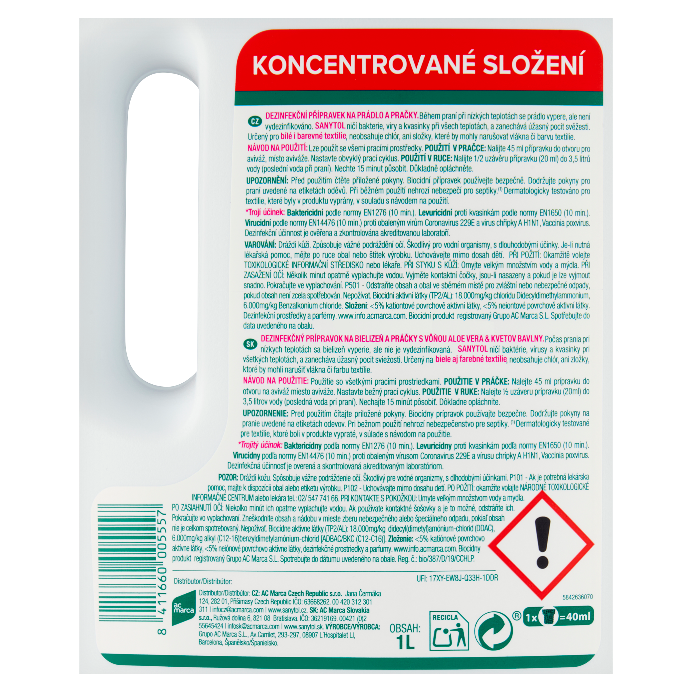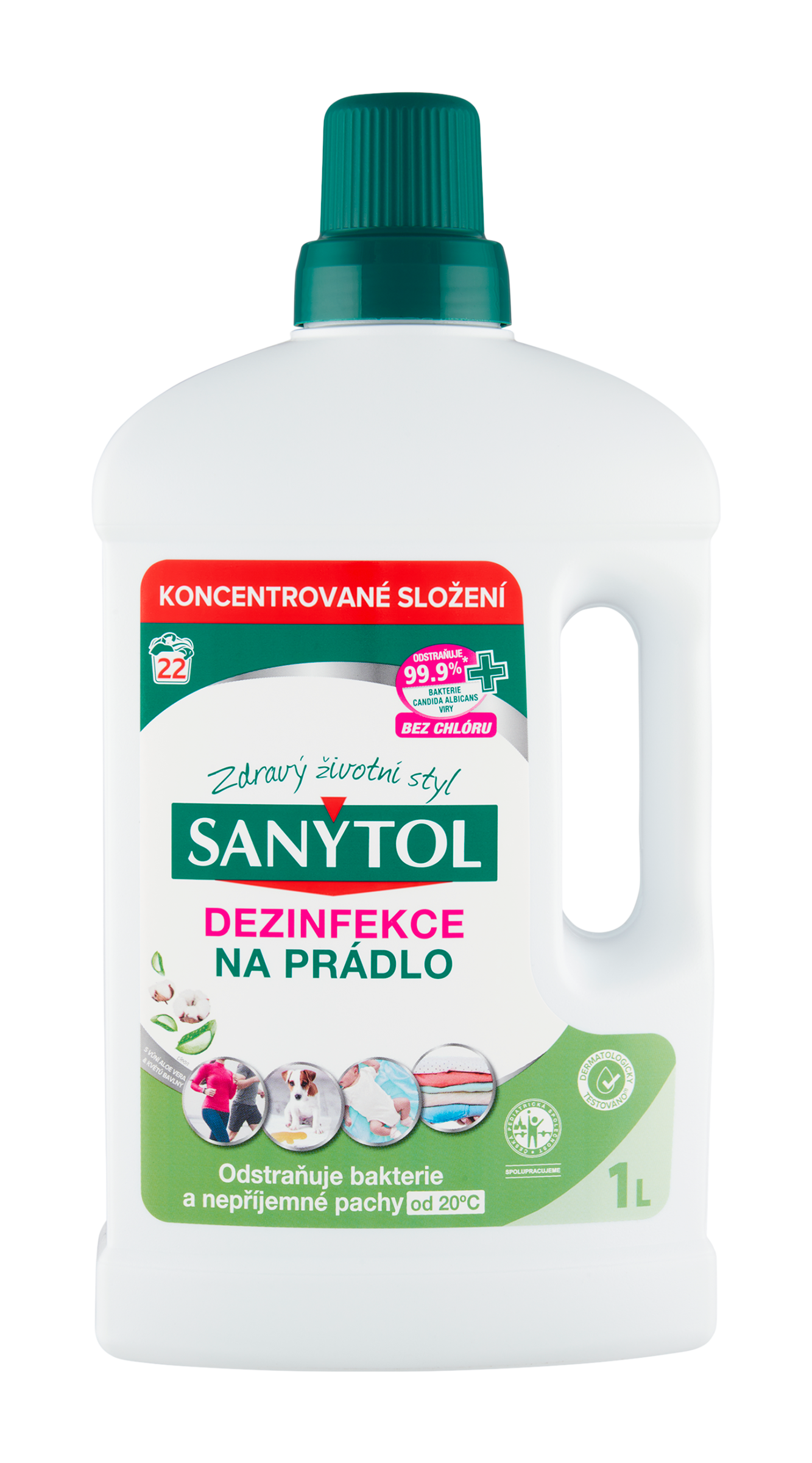 Odstraňuje 99.9 %* bakterie, Candida Albicans, viry. Dermatologicky testováno⁽¹⁾. Dezinfekční přípravek na prádlo a pračky. Během praní při nízkých teplotách se prádlo vypere, ale není vydezinfikováno. Sanytol ničí bakterie, viry a kvasinky při všech teplotách, a zanechává úžasný pocit svěžesti. Určený pro bílé i barevné textilie, neobsahuje chlór, ani složky, které by mohly narušovat vlákna či barvu textilie.