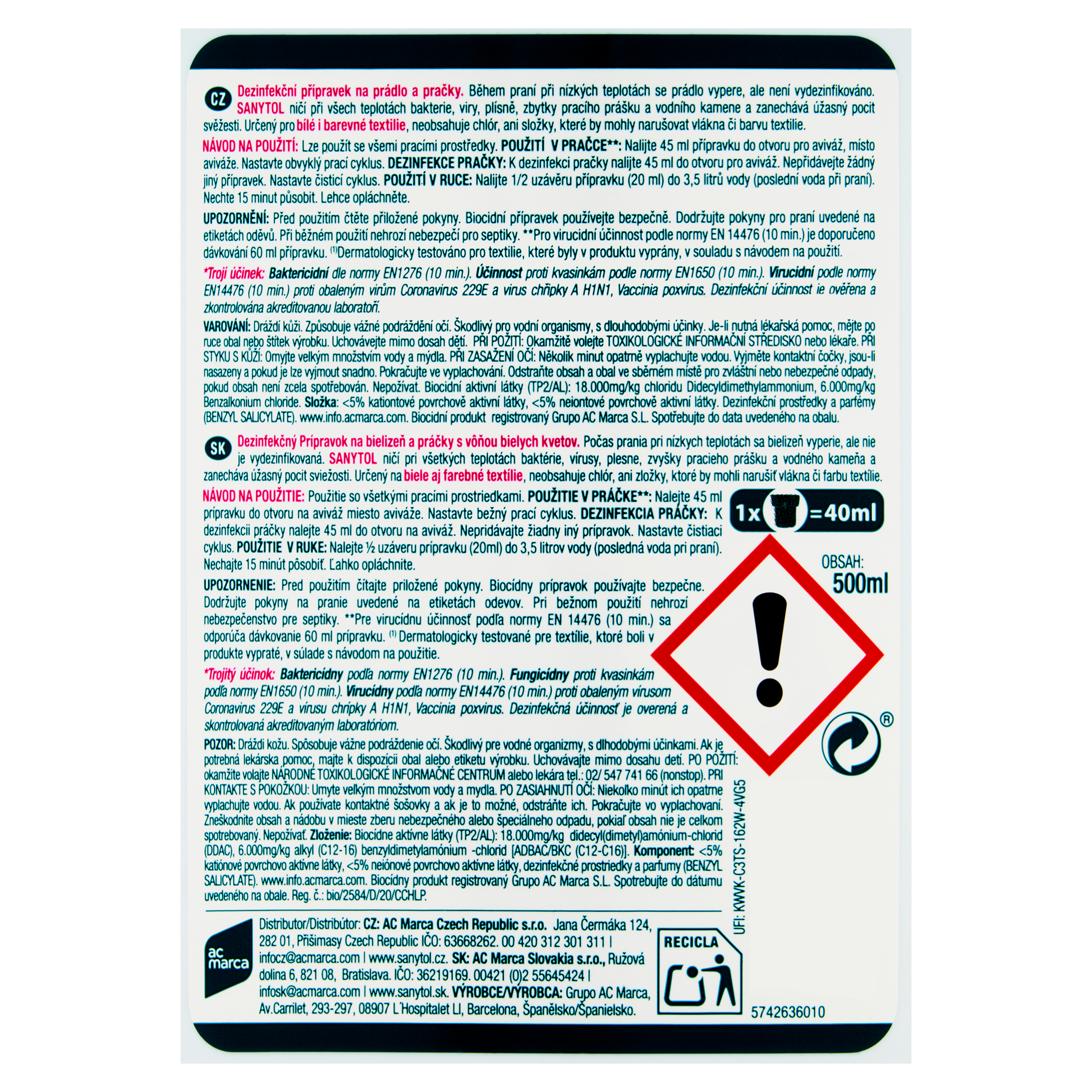 UPOZORNĚNÍ: Před použitím čtěte přiložené pokyny. Biocidní přípravek používejte bezpečně. Před použitím si přečtěte údaje na obalu a informace o výrobku. Dodržujte pokyny pro praní uvedené na etiketách oděvů. Při běžném použití nehrozí nebezpečí pro septiky. VAROVÁNÍ: H315 - Dráždí kůži. H319 - Způsobuje vážné podráždění očí. H412 - Škodlivý pro vodní organismy, s dlouhodobými účinky. P101 - Je-li nutná lékařská pomoc, mějte po ruce obal nebo štítek výrobku. P102 - Uchovávejte mimo dosah dětí. P301+P312 - PŘI POŽITÍ: Okamžitě volejte TOXIKOLOGICKÉ INFORMAČNÍ STŘEDISKO nebo lékaře, tel. 224 919 293 nebo 224 915 402 (24 hodin denně). P302+P352 - PŘI STYKU S KŮŽÍ: Omyjte velkým množstvím vody a mýdla. P305+P351+P338 - PŘI ZASAŽENÍ OČÍ: Několik minut opatrně vyplachujte vodou. Vyjměte kontaktní čočky, jsou-li nasazeny a pokud je lze vyjmout snadno. Pokračujte ve vyplachování. Nepožívat. Biocidní aktivní látky (TP2/AL): 18.000 mg/kg chloridu Didecyldimethylammonium, 6.000 mg/kg Benzalkonium chloride.