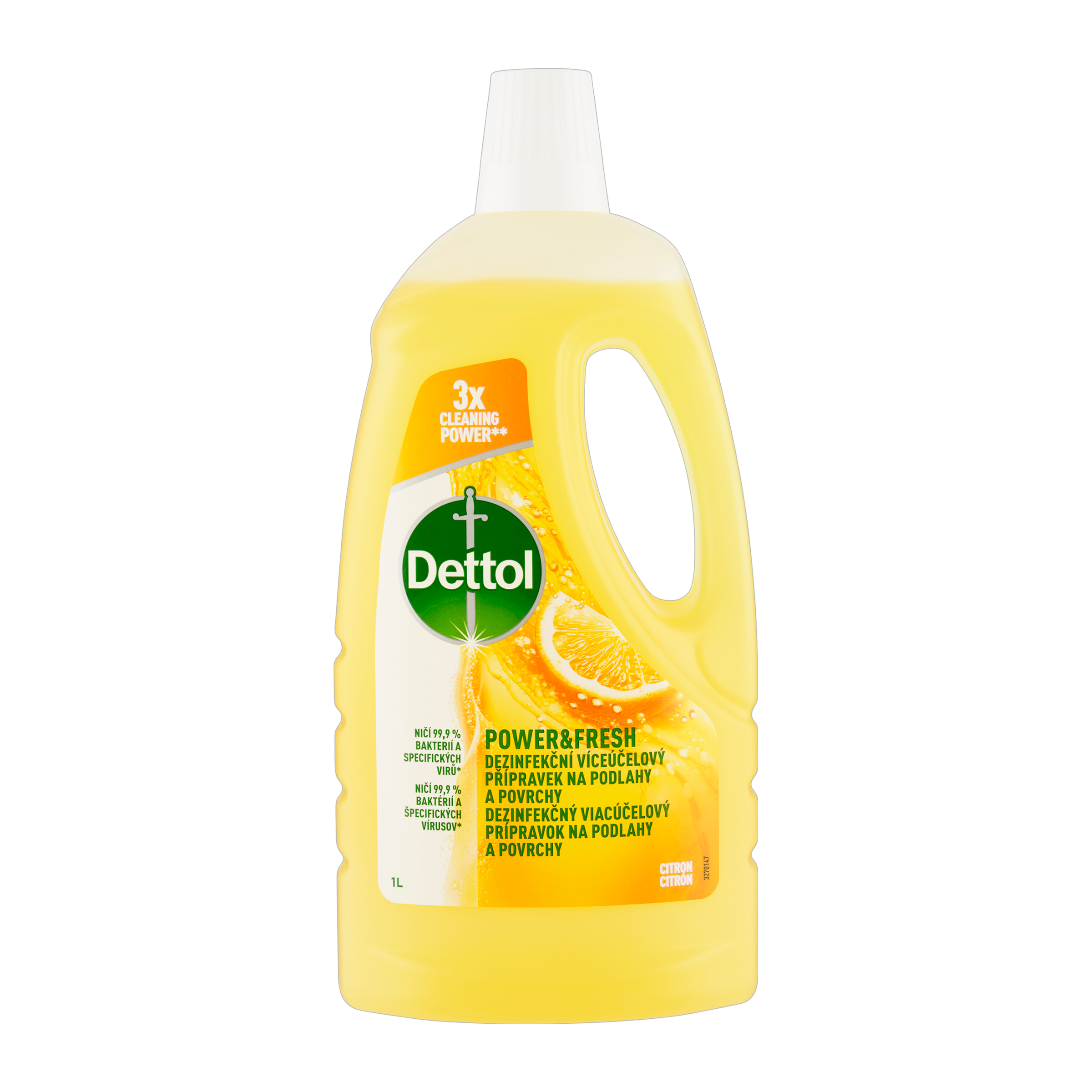 Dezinfekční přípravek na podlahy a povrchy Dettol Power & Fresh Citron je silný dezinfekční čistič na podlahy a všechny omyvatelné povrchy, který spojuje hygienickou účinnost s příjemnou svěží vůní. Díky trojici účinných vlastností snadno odstraní mastnotu, usazenou špínu i každodenní nečistoty a zároveň spolehlivě zlikviduje 99,9 % bakterií včetně E.coli a specifických virů* jako SARS-CoV-2. Při použití neředěného přípravku získáte maximální dezinfekční účinek, zářivý lesk a dlouhotrvající čistotu – ideální pro důkladný úklid celé domácnosti.
