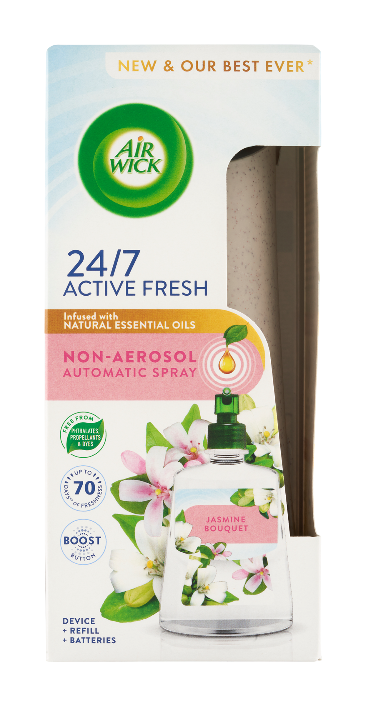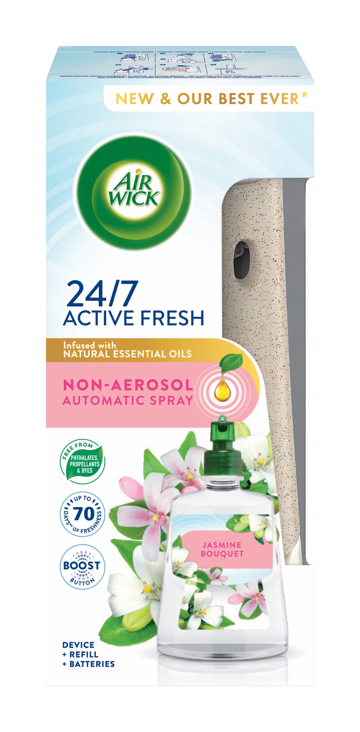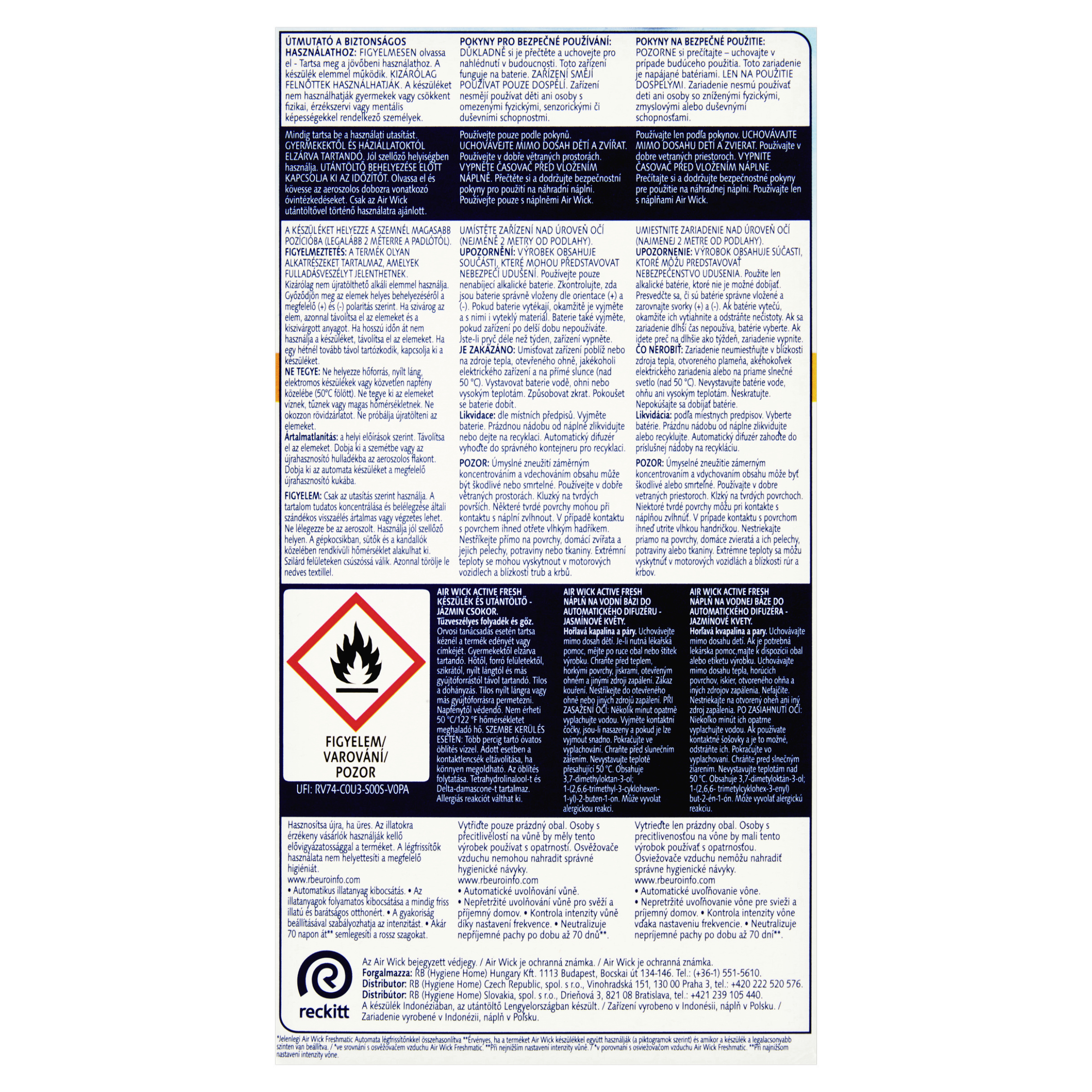 VAROVÁNÍ POKYNY PRO BEZPEČNÉ POUŽÍVÁNÍ: DŮKLADNĚ si je přečtěte a uchovejte pro nahlédnutí v budoucnosti. Toto zařízení funguje na baterie. ZAŘÍZENÍ SMĚJÍ POUŽÍVAT POUZE DOSPĚLÍ. Zařízení nesmějí používat děti ani osoby s omezenými fyzickými, senzorickými či duševními schopnostmi. Používejte pouze podle pokynů. UCHOVÁVEJTE MIMO DOSAH DĚTÍ A ZVÍŘAT. Používejte v dobře větraných prostorách. VYPNĚTE ČASOVAČ PŘED VLOŽENÍM NÁPLNĚ. Přečtěte si a dodržujte bezpečnostní pokyny pro použití na náhradní náplni. Používejte pouze s náplněmi Air Wick. UMÍSTĚTE ZAŘÍZENÍ NAD ÚROVEŇ OČÍ (NEJMÉNĚ 2 METRY OD PODLAHY). UPOZORNĚNÍ: VÝROBEK OBSAHUJE SOUČÁSTI, KTERÉ MOHOU PŘEDSTAVOVAT NEBEZPEČÍ UDUŠENÍ. Používejte pouze nenabíjecí alkalické baterie. Zkontrolujte, zda jsou baterie správně vloženy dle orientace (+) a (-). Pokud baterie vytékají, okamžitě je vyjměte a s nimi i vyteklý materiál. Baterie také vyjměte, pokud zařízení po delší dobu nepoužíváte. Jste-li pryč déle než týden, zařízení vypněte. JE ZAKÁZÁNO: Umisťovat zařízení poblíž nebo na zdroje tepla, otevřeného ohně, jakéhokoli elektrického zařízení a na přímé slunce (nad 50 °C). Vystavovat baterie vodě, ohni nebo vysokým teplotám. Způsobovat zkrat. Pokoušet se baterie dobít. POZOR: Úmyslné zneužití záměrným koncentrováním a vdechováním obsahu může být škodlivé nebo smrtelné. Používejte v dobře větraných prostorách. Kluzký na tvrdých površích. Některé tvrdé povrchy mohou při kontaktu s náplní zvlhnout. V případě kontaktu s povrchem ihned otřete vlhkým hadříkem. Nestříkejte přímo na povrchy, domácí zvířata a jejich pelechy, potraviny nebo tkaniny. Extrémní teploty se mohou vyskytnout v motorových vozidlech a blízkosti trub a krbů. AIR WICK ACTIVE FRESH NÁPLŇ NA VODNÍ BÁZI DO AUTOMATICKÉHO DIFUZÉRU - JASMÍNOVÉ KVĚTY. Hořlavá kapalina a páry. Uchovávejte mimo dosah dětí. Je-li nutná lékařská pomoc, mějte po ruce obal nebo štítek výrobku. Chraňte před teplem, horkými povrchy, jiskrami, otevřeným ohněm a jinými zdroji zapálení. Zákaz kouření. Nestříkejte do otevřeného ohně nebo jiných zdrojů zapálení. PŘI ZASAŽENÍ OČÍ: Několik minut opatrně vyplachujte vodou. Vyjměte kontaktní čočky, jsou-li nasazeny a pokud je lze vyjmout snadno. Pokračujte ve vyplachování. Chraňte před slunečním zářením. Nevystavujte teplotě přesahující 50 °C. Obsahuje 3,7-dimethyloktan-3-ol; 1-(2,6,6-trimethyl-3-cyklohexen-1-yl)-2-buten-1-on. Může vyvolat alergickou reakci. Osoby s přecitlivělostí na vůně by měly tento výrobek používat s opatrností. Osvěžovače vzduchu nemohou nahradit správné hygienické návyky. Postupujte POZORNĚ podle pokynů. MĚJTE DIFUZÉR NATOČENÝ SMĚREM OD VAŠÍ TVÁŘE PO CELOU DOBU JEHO POUŽÍVÁNÍ.