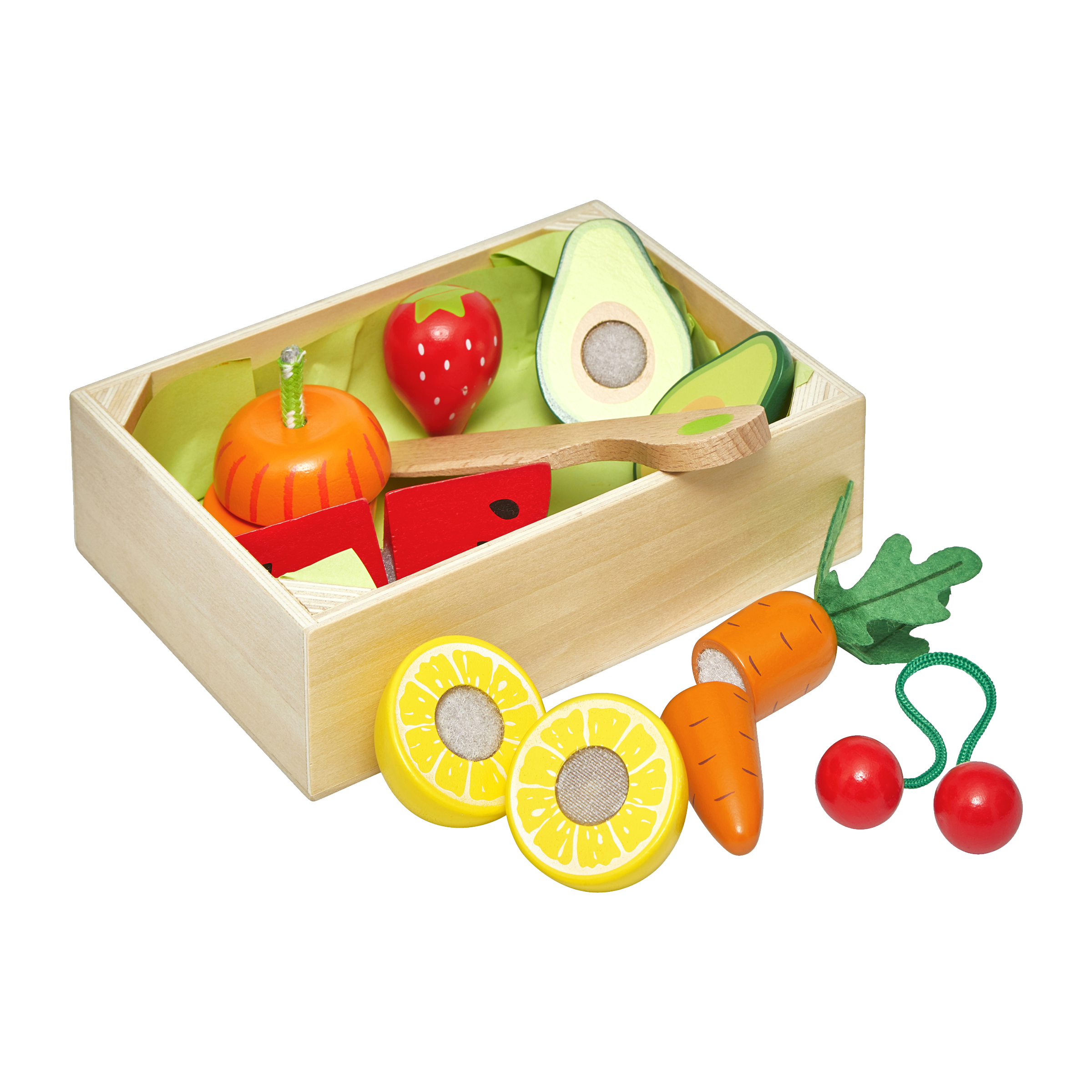 Dřevěný box Ovoce a zelenina Ideenwelt je skvělá hračka pro děti, která je nejen zábavná, ale i edukativní. Tento set obsahuje realistické ovoce a zeleninu, včetně nože, který umožňuje dětem učit se správně krájet a zlepšovat motorické dovednosti. Děti si mohou hrát na kuchaře a připravovat své oblíbené pokrmy s jahodami, mrkví, dýní, melounem, citronem a dvěma třešněmi. Dřevěný box s ovocem je ideální hračka pro kreativní rozvoj a trénink jemné motoriky.