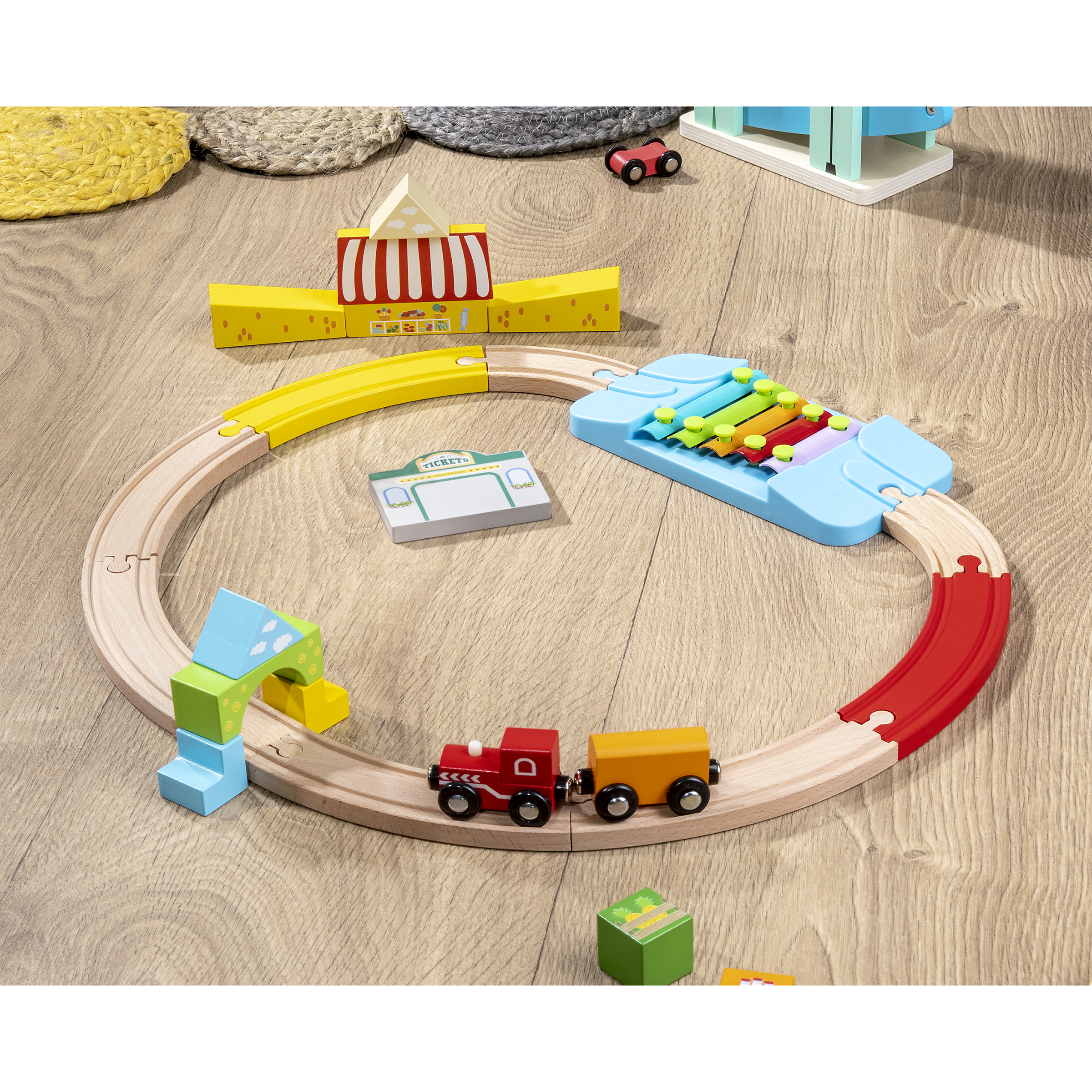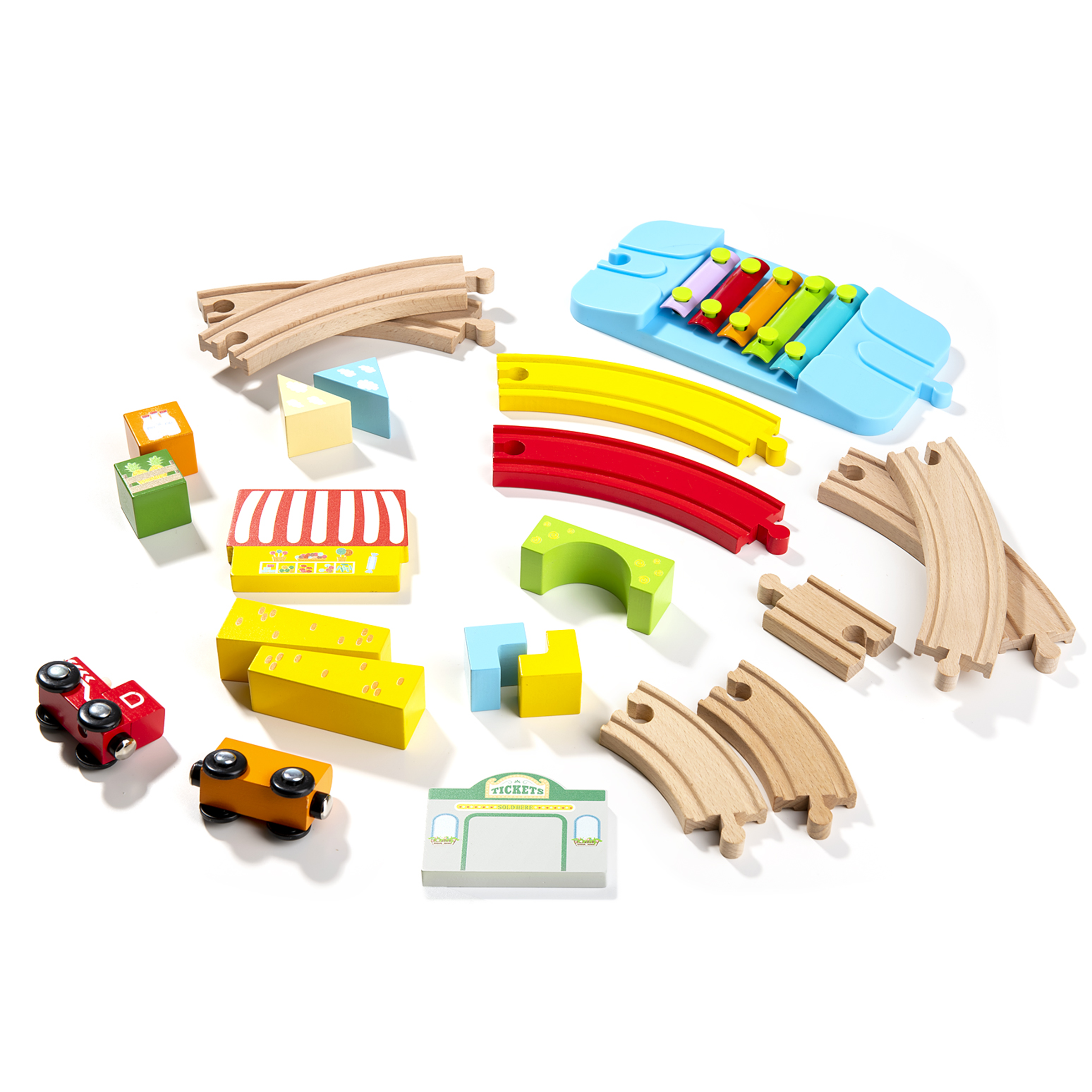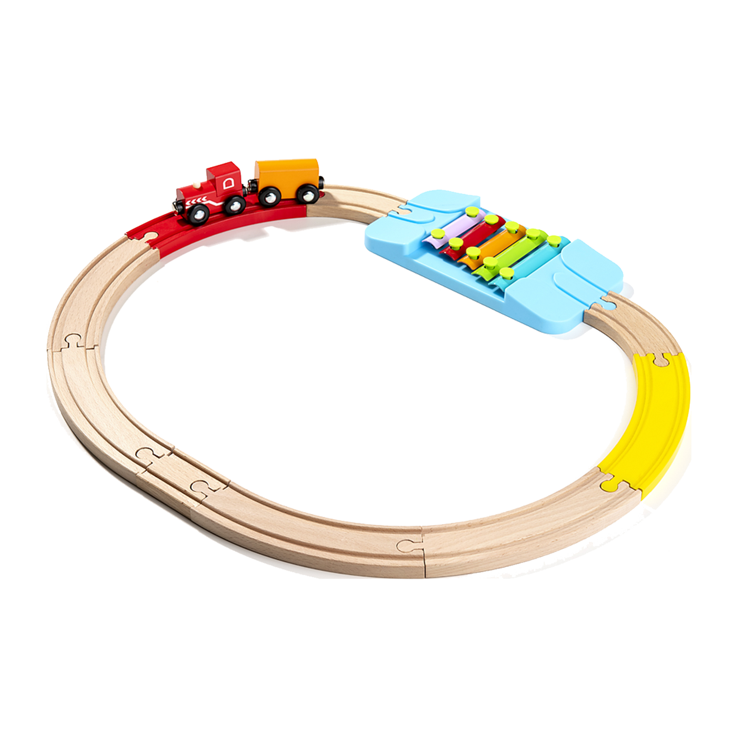 - sada obsahuje: 9 kolejnic, 1 xylofonovou dráhu, 1 vlak s 1 vagónem, 11 kostek