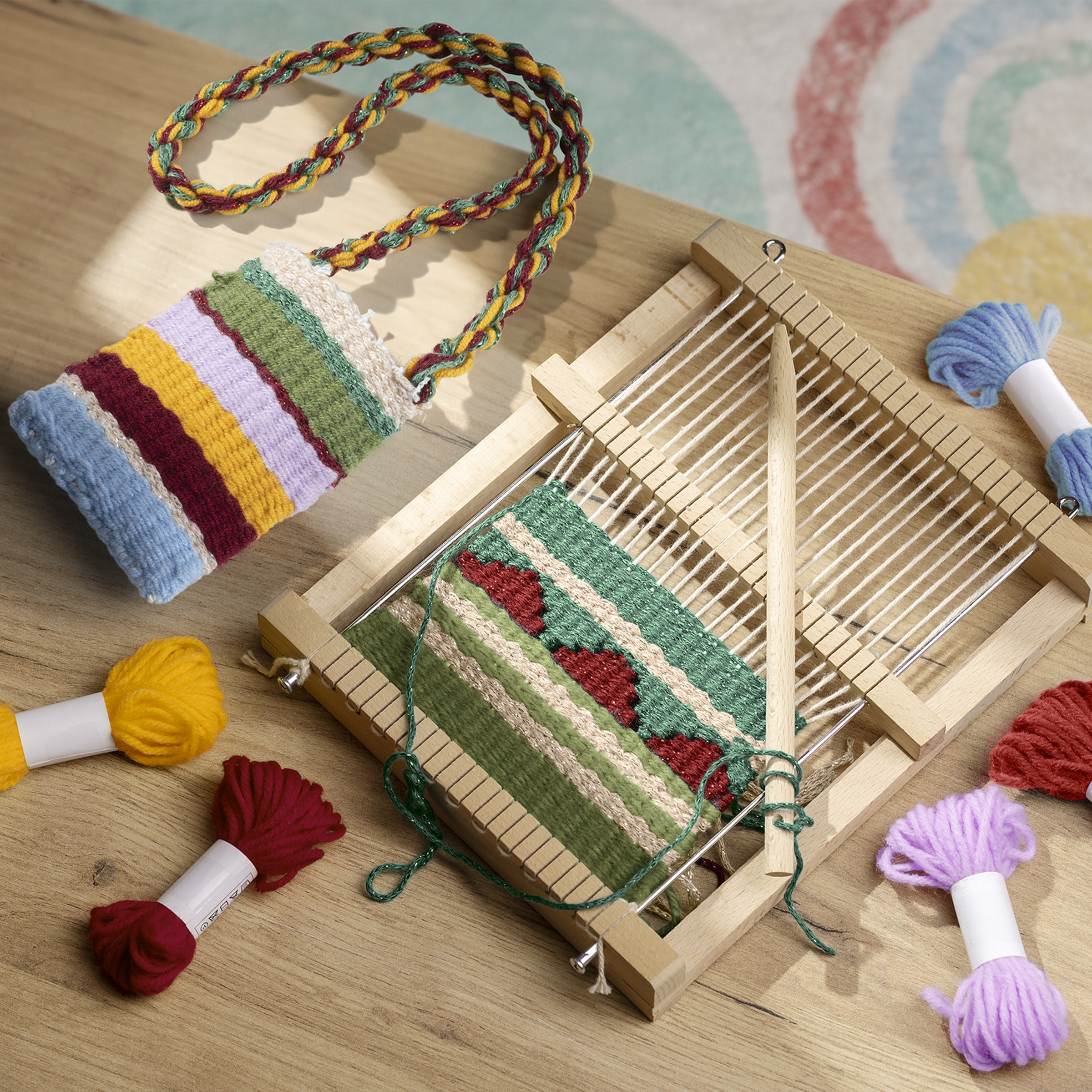 - obsah: 6 x barevná vlna, 3 x třpytivá vlna, tkalcovský rám (22 x 19 cm), člunek, 2 pojistné jehlice, osnovní nit