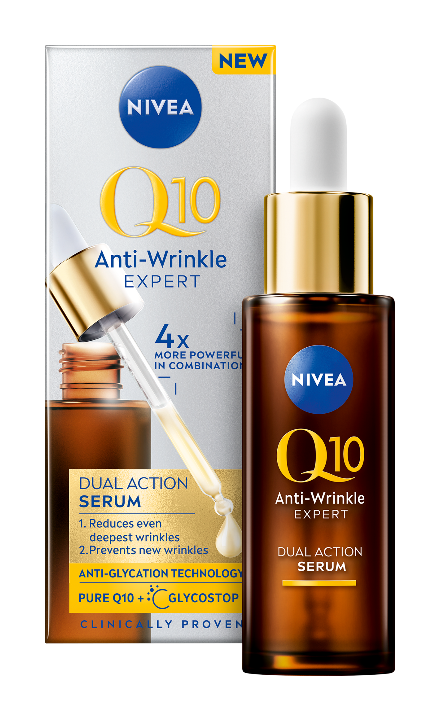 Nivea® Expertní duální sérum proti vráskám Q10 s inovativním složením s technologií proti glykaci působí dvojí silou:
