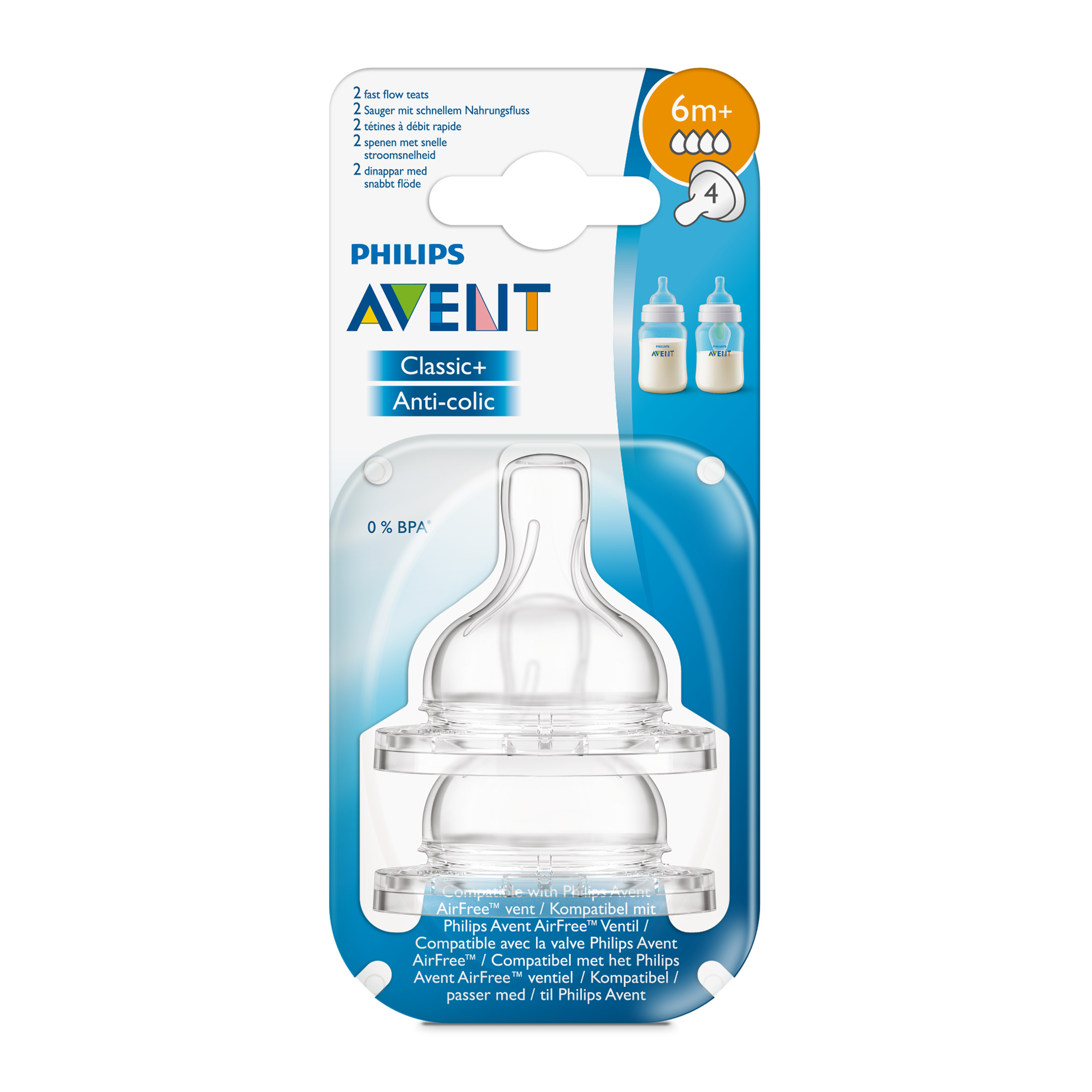 Dudlík na láhev Philips AVENT se 4 otvory - s rychlým průtokem. Pro děti od 6 měsíců.