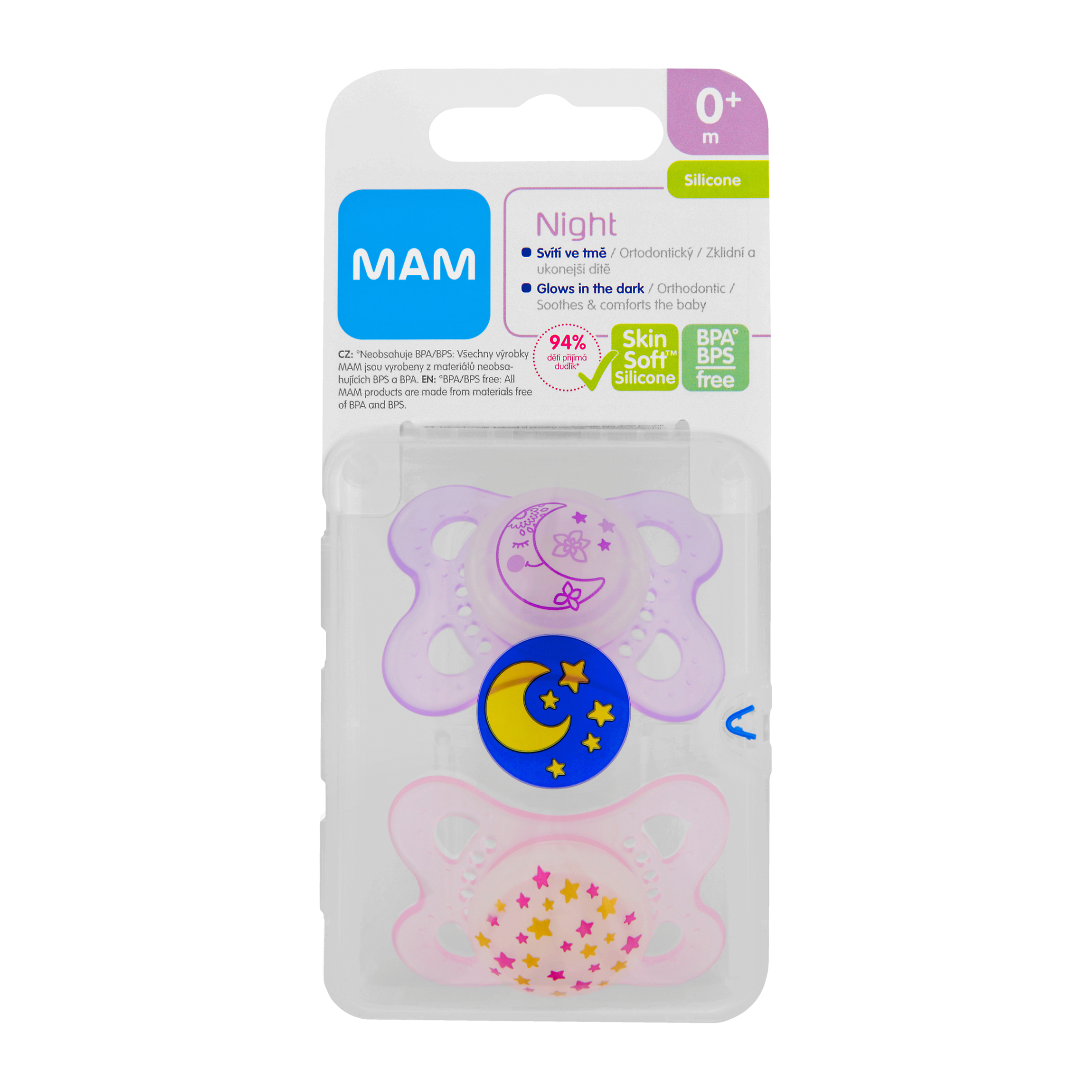 MAM dudlík Original Night je vyvinut pro noční použití. Knoflík dudlíku ve tmě svítí, takže ho rodiče i děti snadno mohou nalézt. Dudlík má symetrický tvar, a proto se vždy dokonale přizpůsobí dětským ústům. Díky knoflíku ho lze snadno a rychle uchopit a rovněž jednoduše připevnit k pásku. Inovativní savička MAM je jemná jako pokožka a je dětmi snadno přijímána. Dudlík je šetrný k pokožce díky velkým vzduchovým otvorům a také unikátním MAM důlkům. MAM dudlíky byly vyvíjeny společně se zubními experty pro zdravý vývoj zubů.