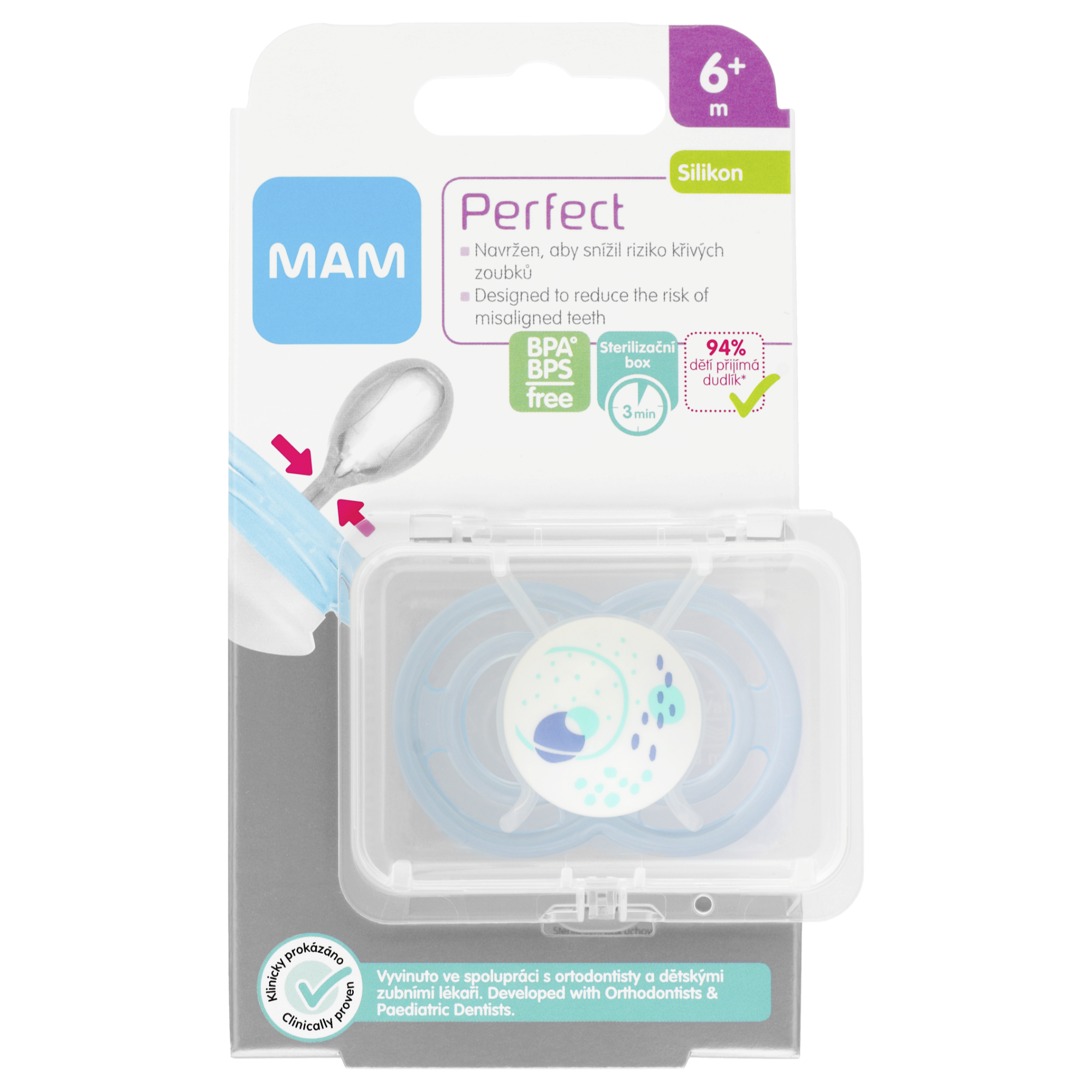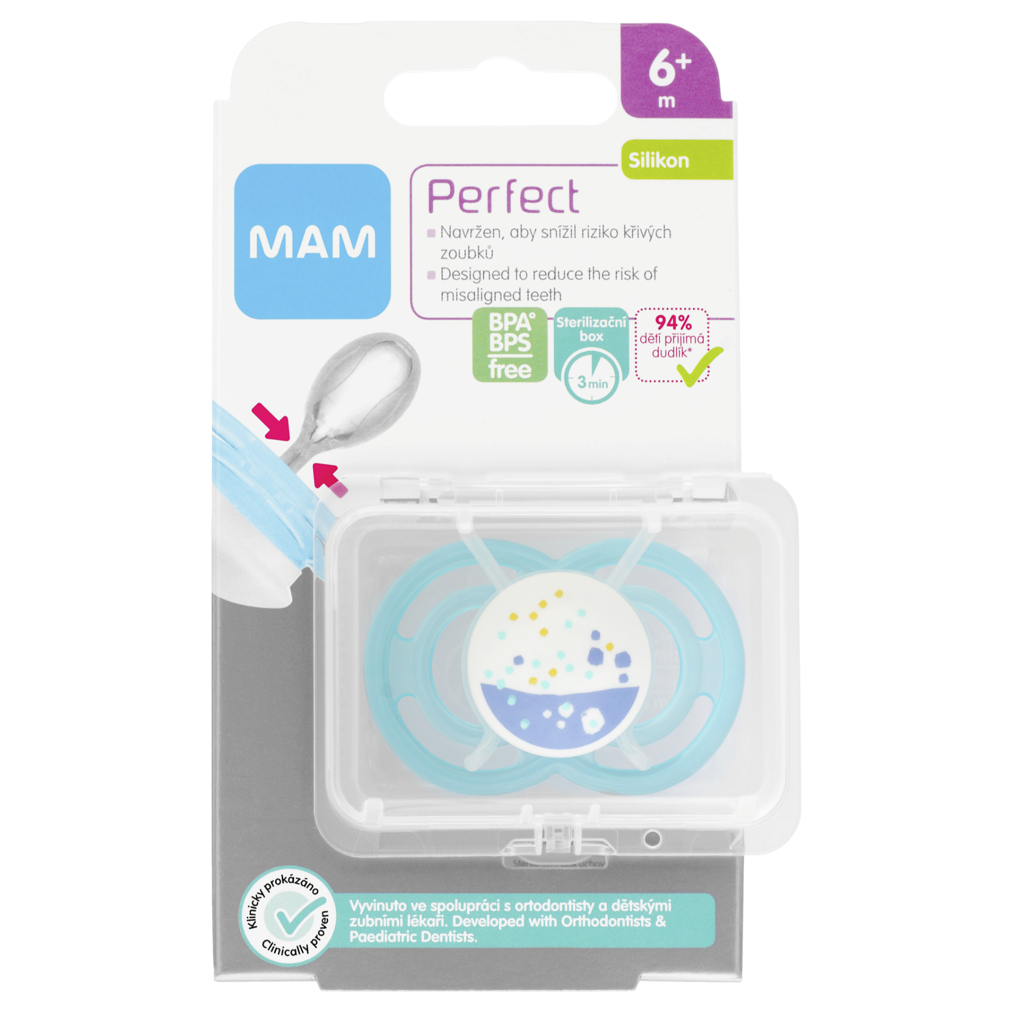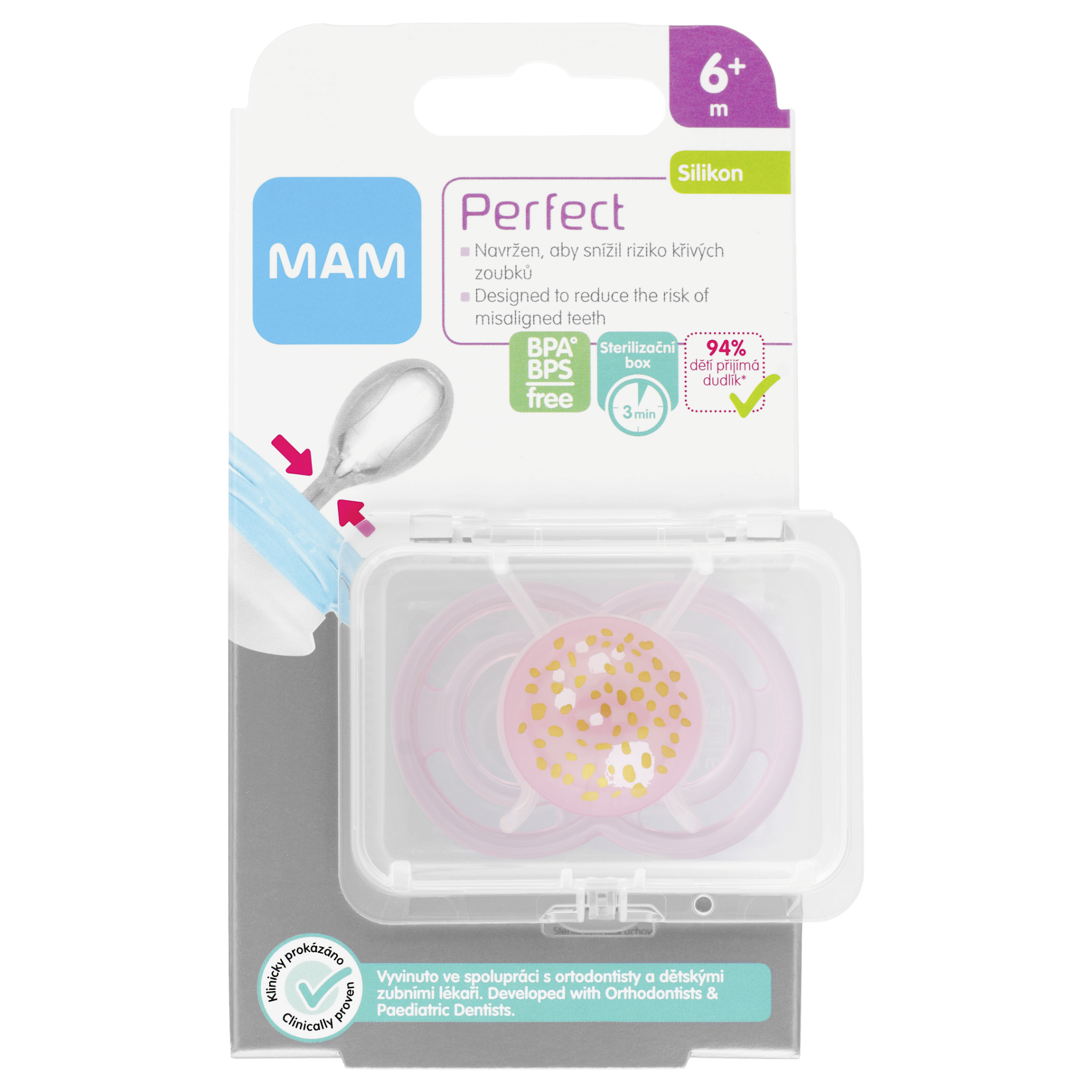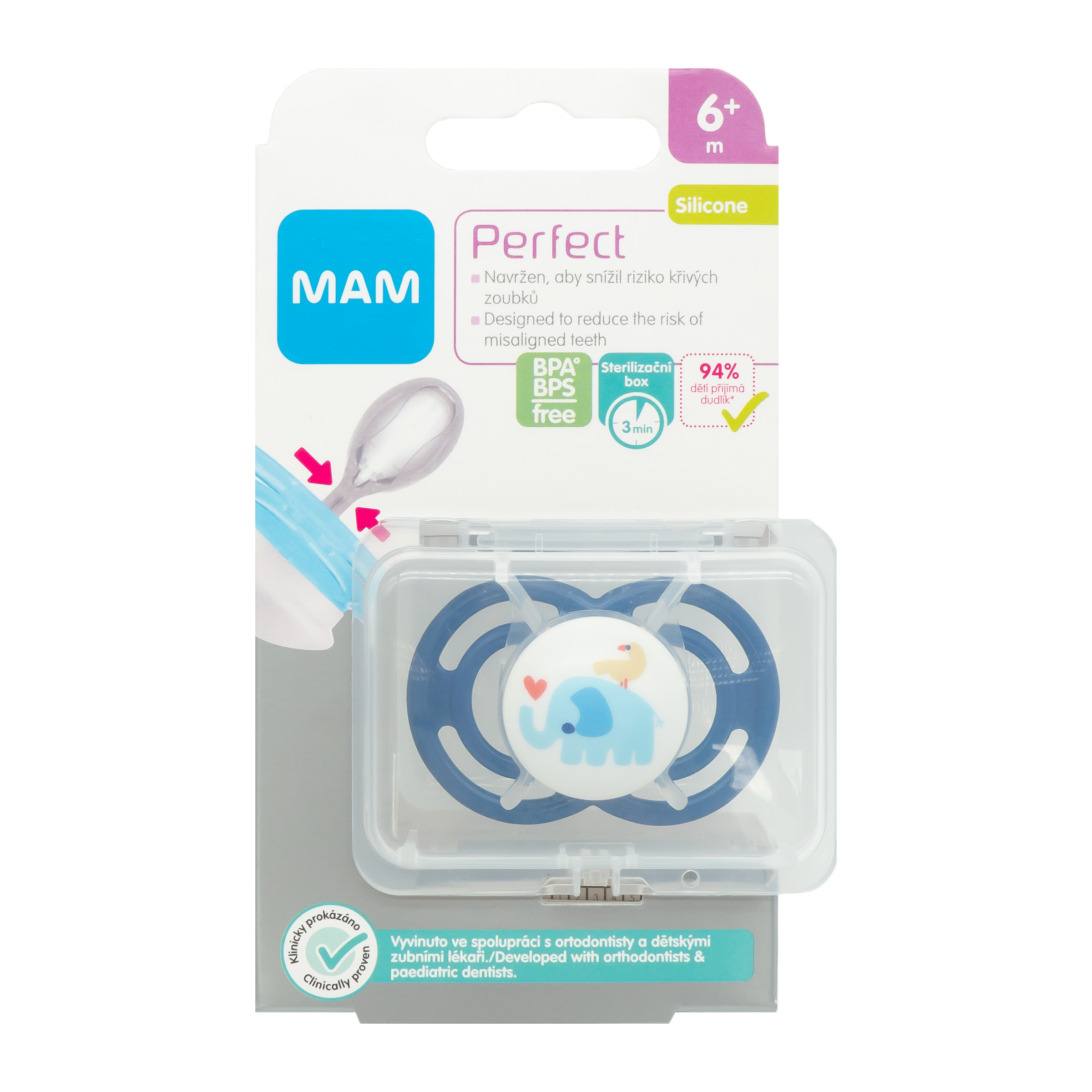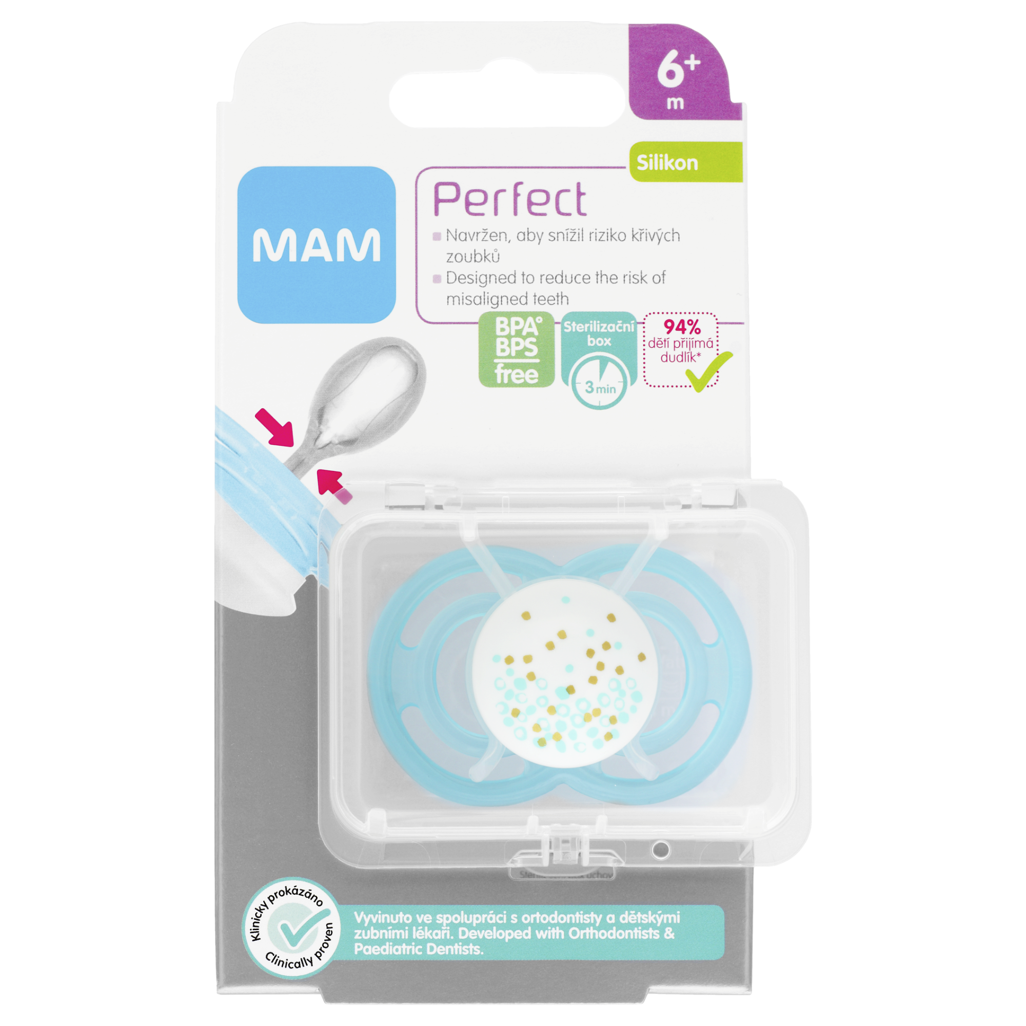 MAM dudlík Perfect snižuje nebezpečí křivého růstu zoubků a vadného skusu. Díky jedinečné savičce Dento-Flex, jemné jako pokožka, je krček dudlíku o 60 % tenčí a 4krát měkčí (v průměru: o 36-76 % tenčí a 2-8krát měkčí než běžné silikonové dudlíky). Zoubky tak získají větší prostor pro svůj růst, a riziko zkřivení zoubků se tak sníží. Je balen v praktickém sterilizačním boxu.