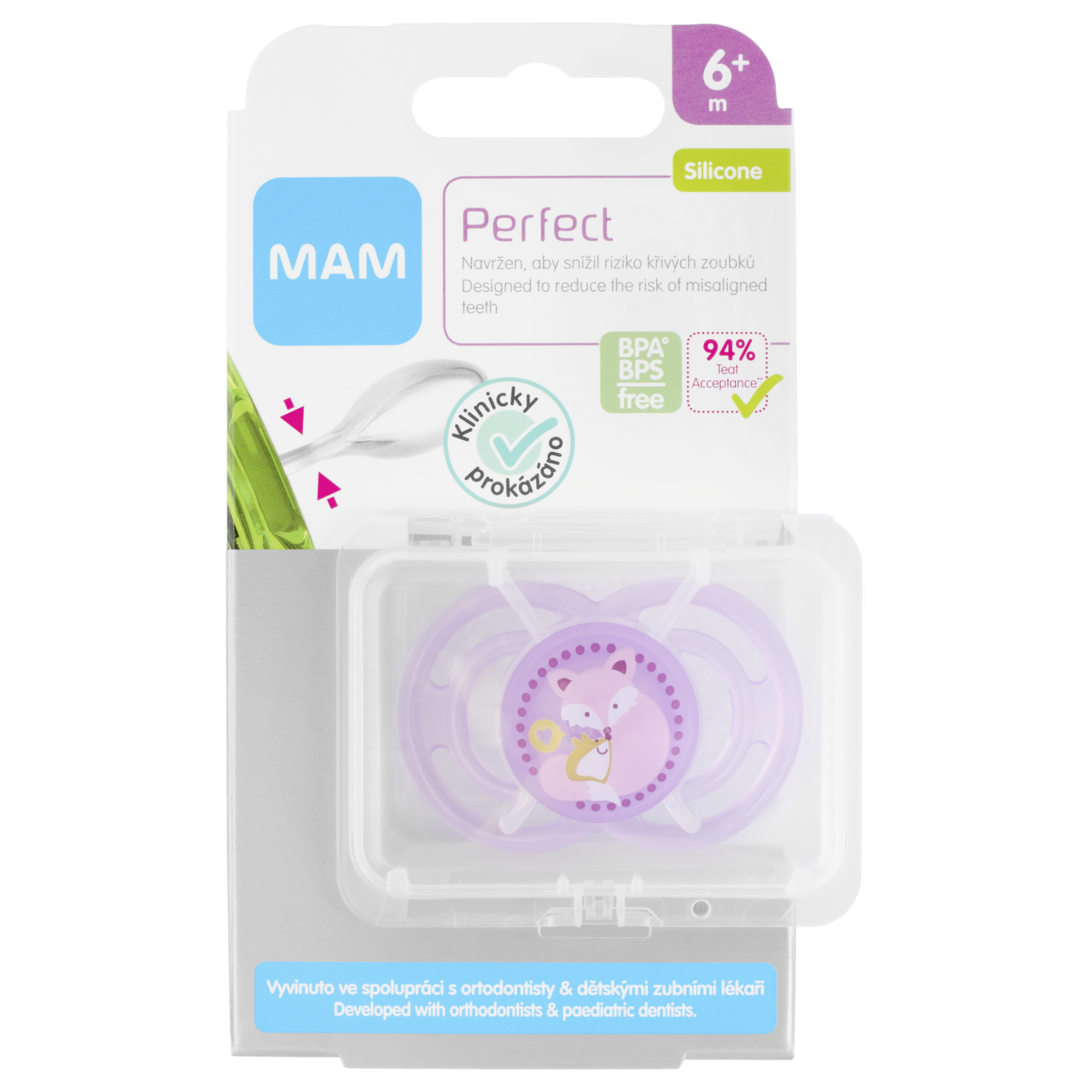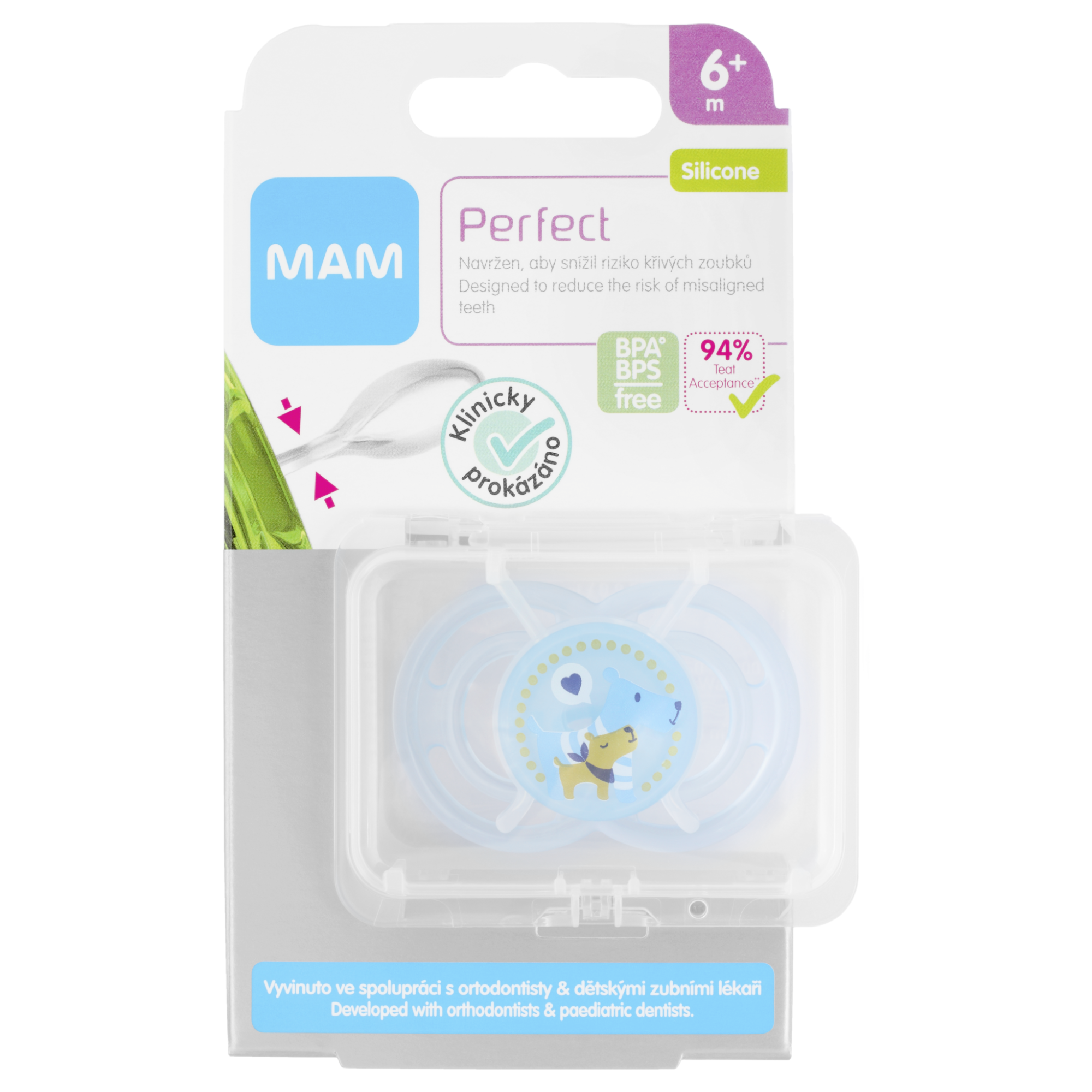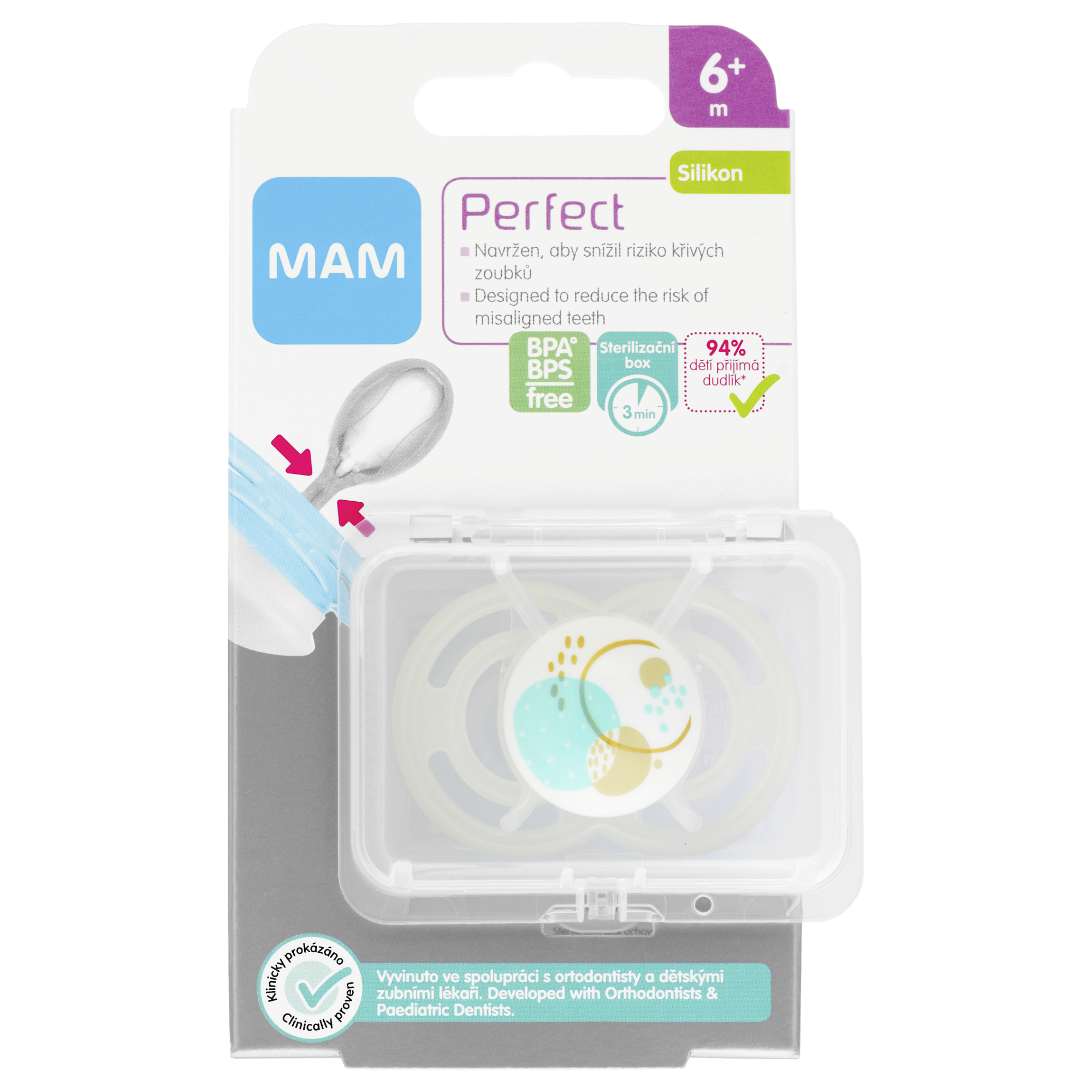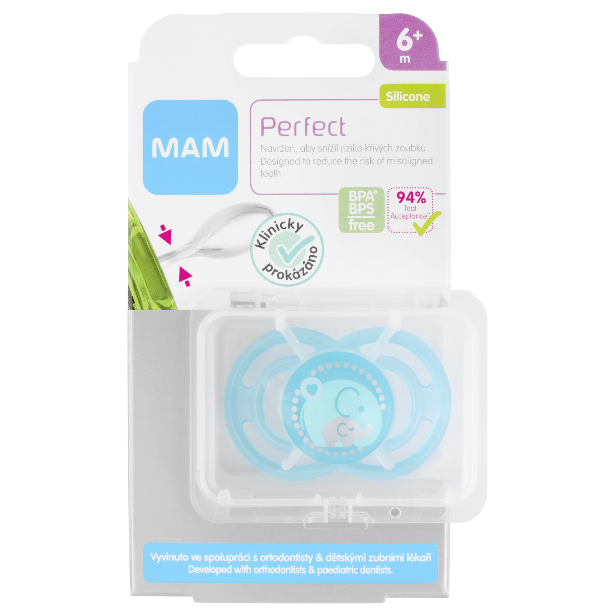 MAM dudlík Perfect snižuje nebezpečí křivého růstu zoubků a vadného skusu. Díky jedinečné savičce Dento-Flex, jemné jako pokožka, je krček dudlíku o 60 % tenčí a 4krát měkčí (v průměru: o 36-76 % tenčí a 2-8krát měkčí než běžné silikonové dudlíky). Zoubky tak získají větší prostor pro svůj růst, a riziko zkřivení zoubků se tak sníží. Je balen v praktickém sterilizačním boxu.