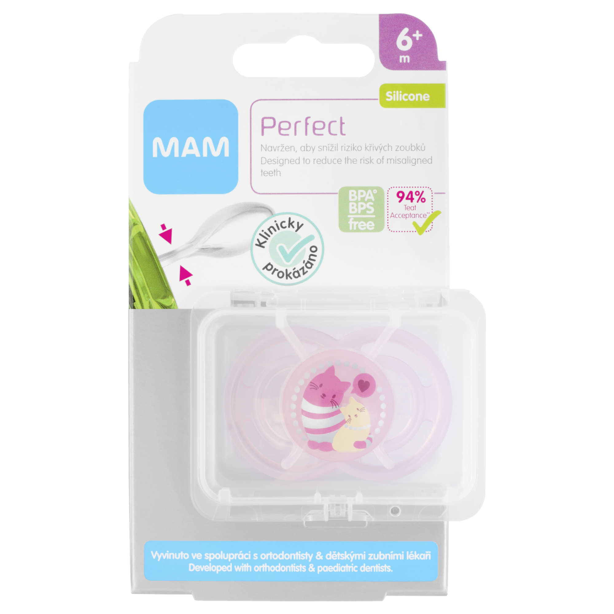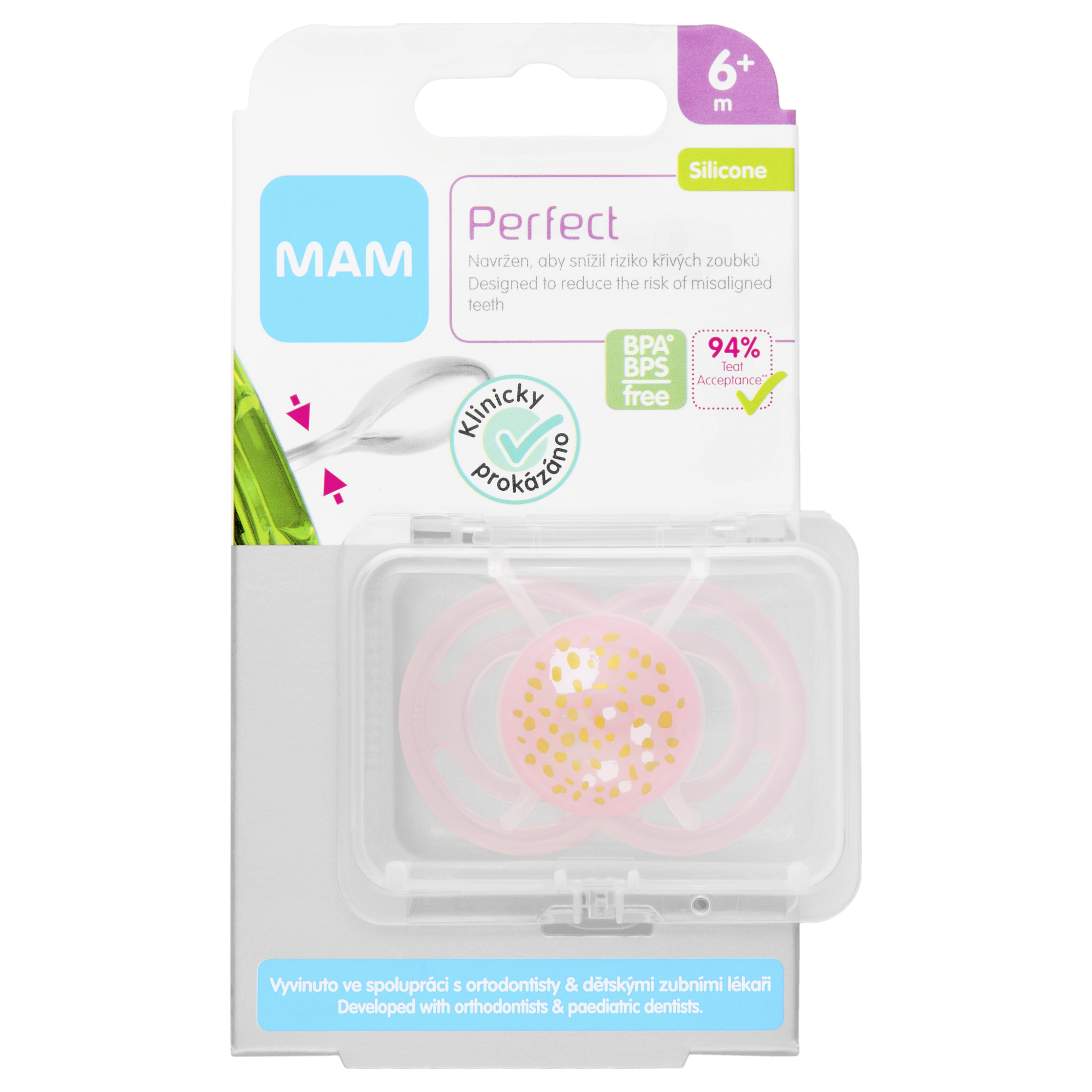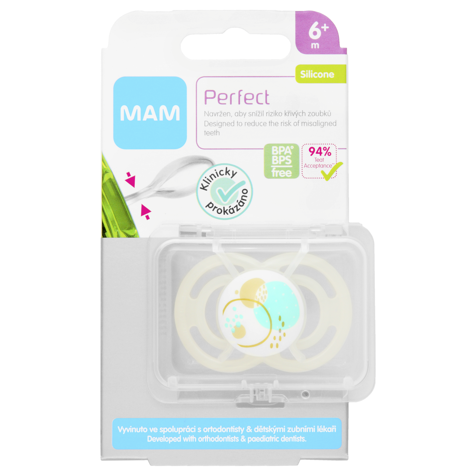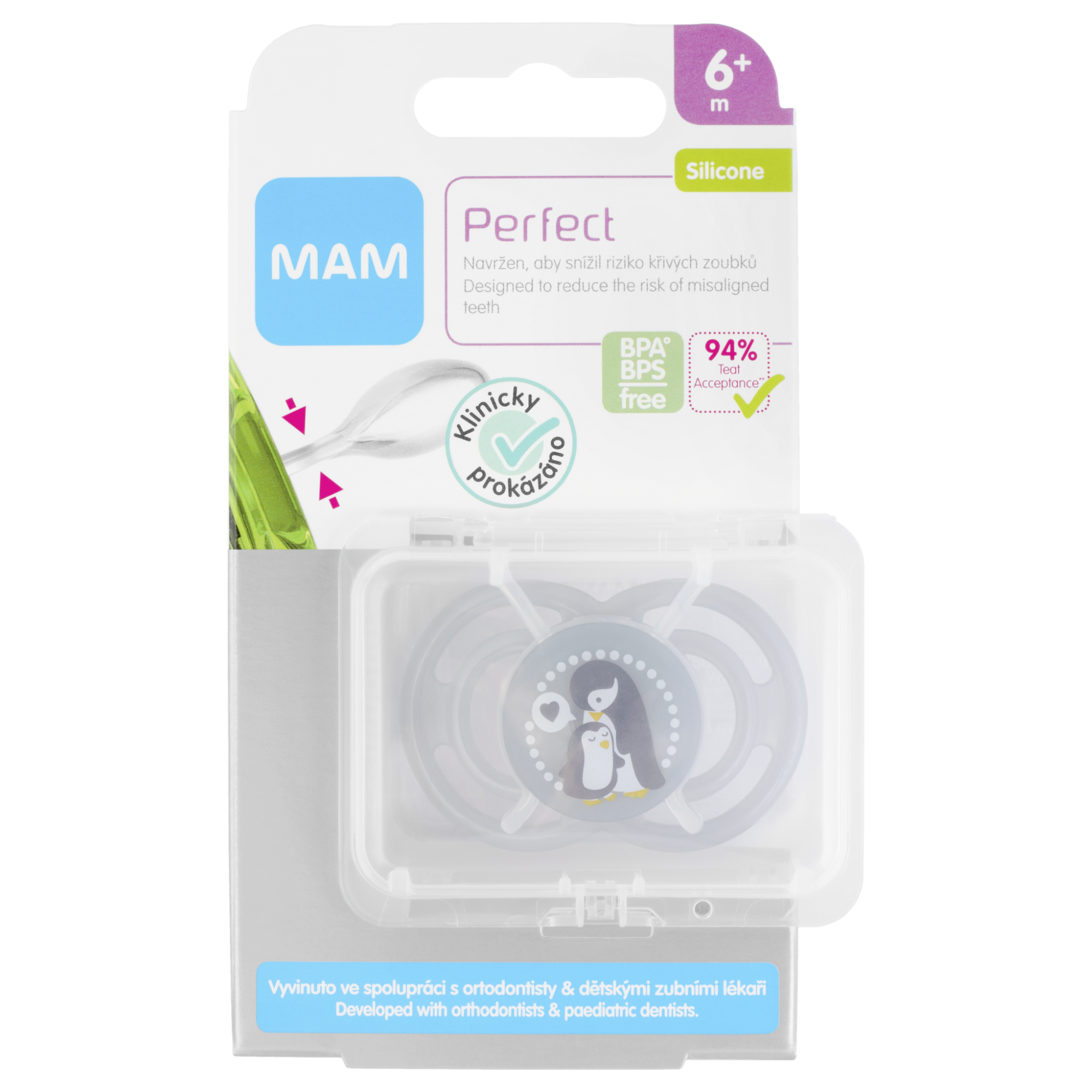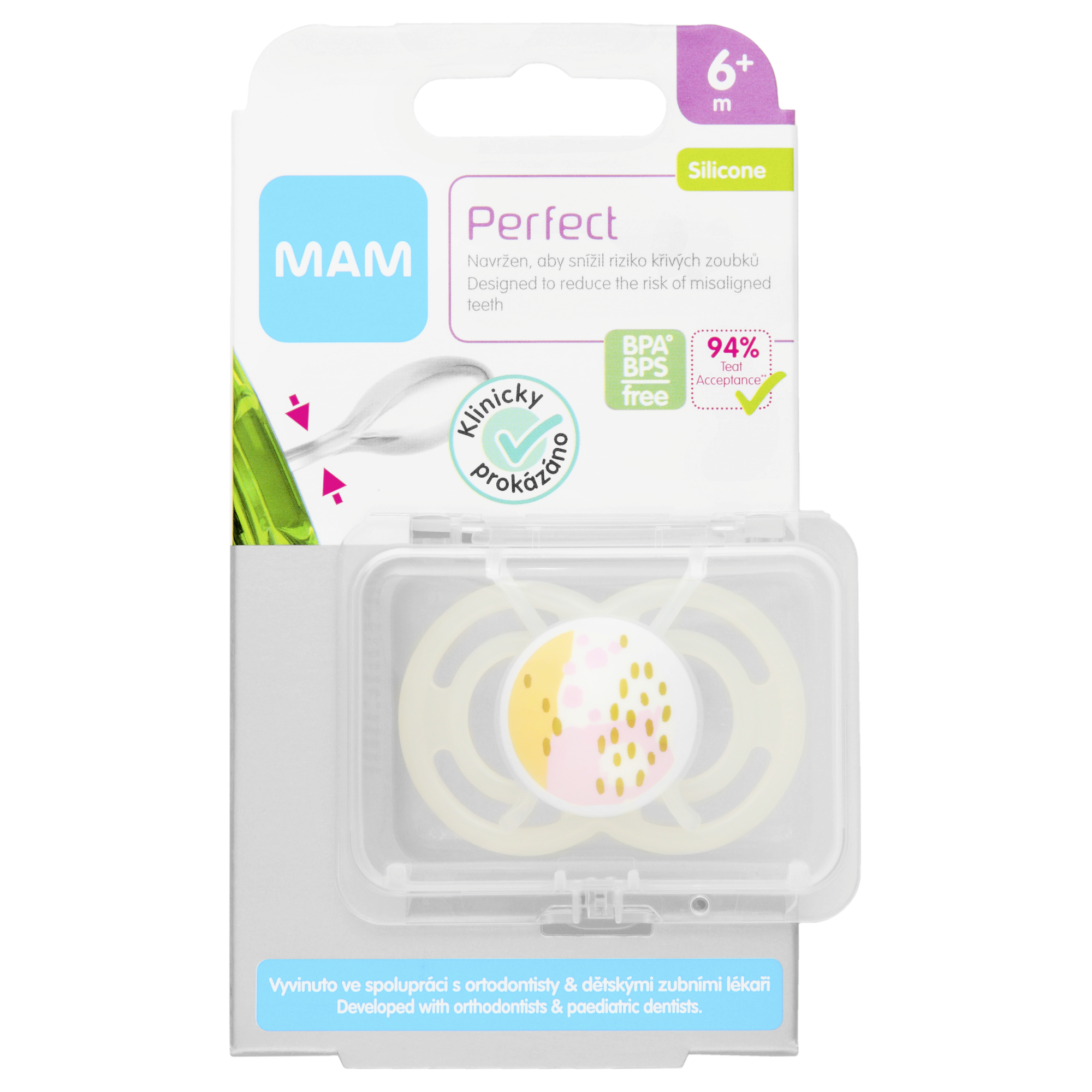 MAM dudlík Perfect snižuje nebezpečí křivého růstu zoubků a vadného skusu. Díky jedinečné savičce Dento-Flex, jemné jako pokožka, je krček dudlíku o 60 % tenčí a 4krát měkčí (v průměru: o 36-76 % tenčí a 2-8krát měkčí než běžné silikonové dudlíky). Zoubky tak získají větší prostor pro svůj růst, a riziko zkřivení zoubků se tak sníží. Je balen v praktickém sterilizačním boxu.