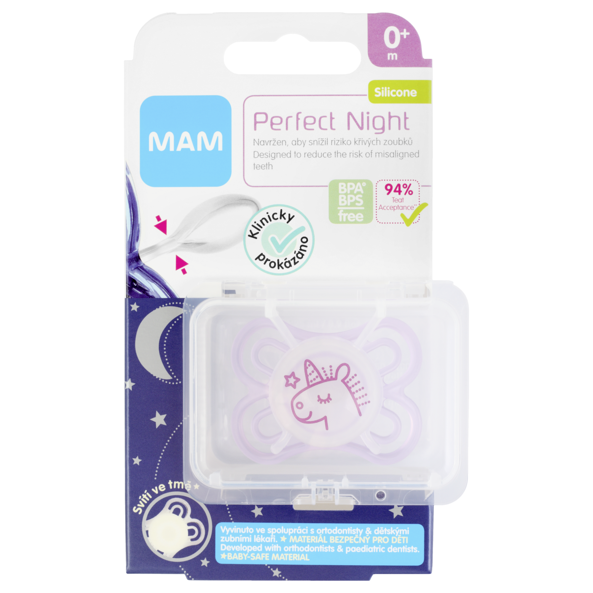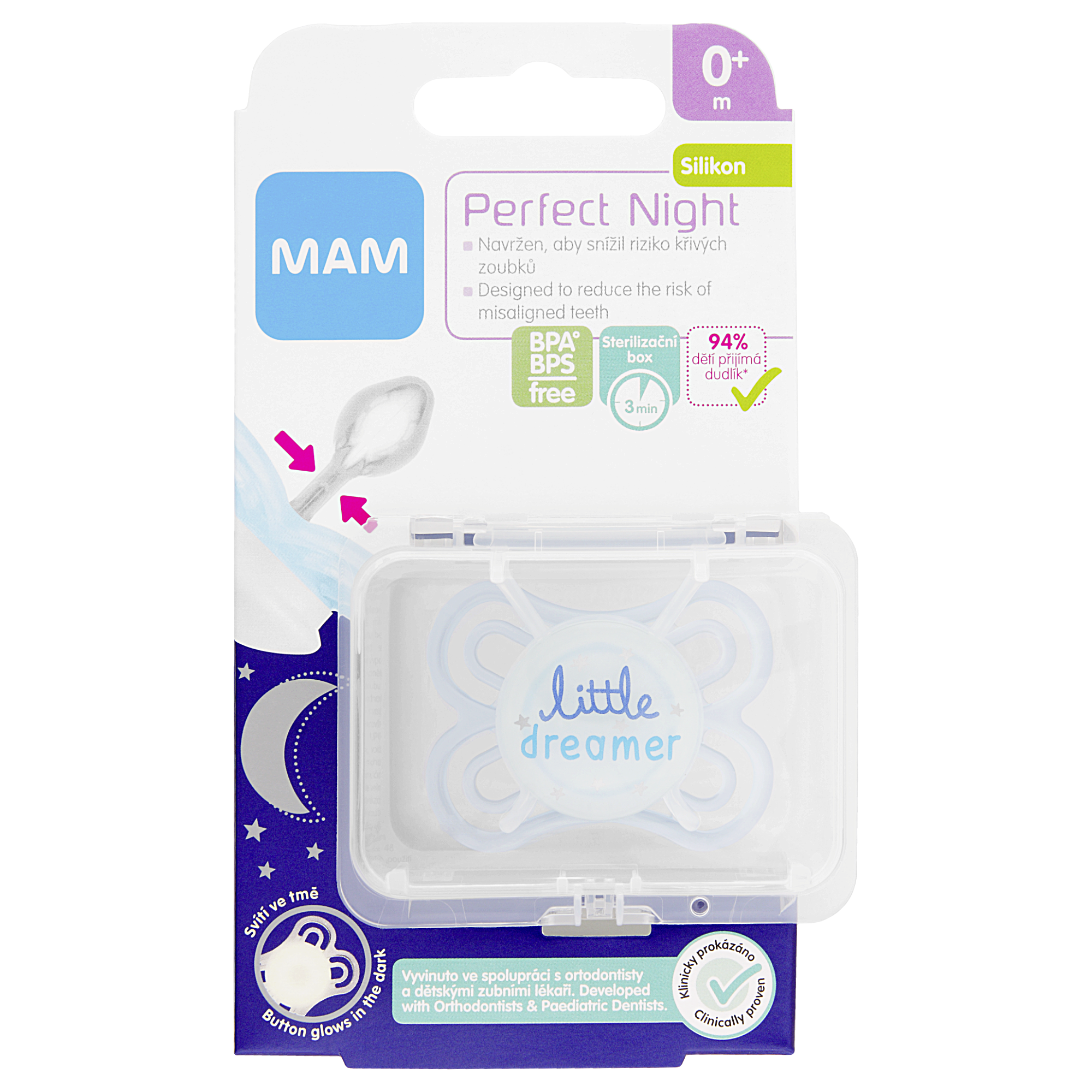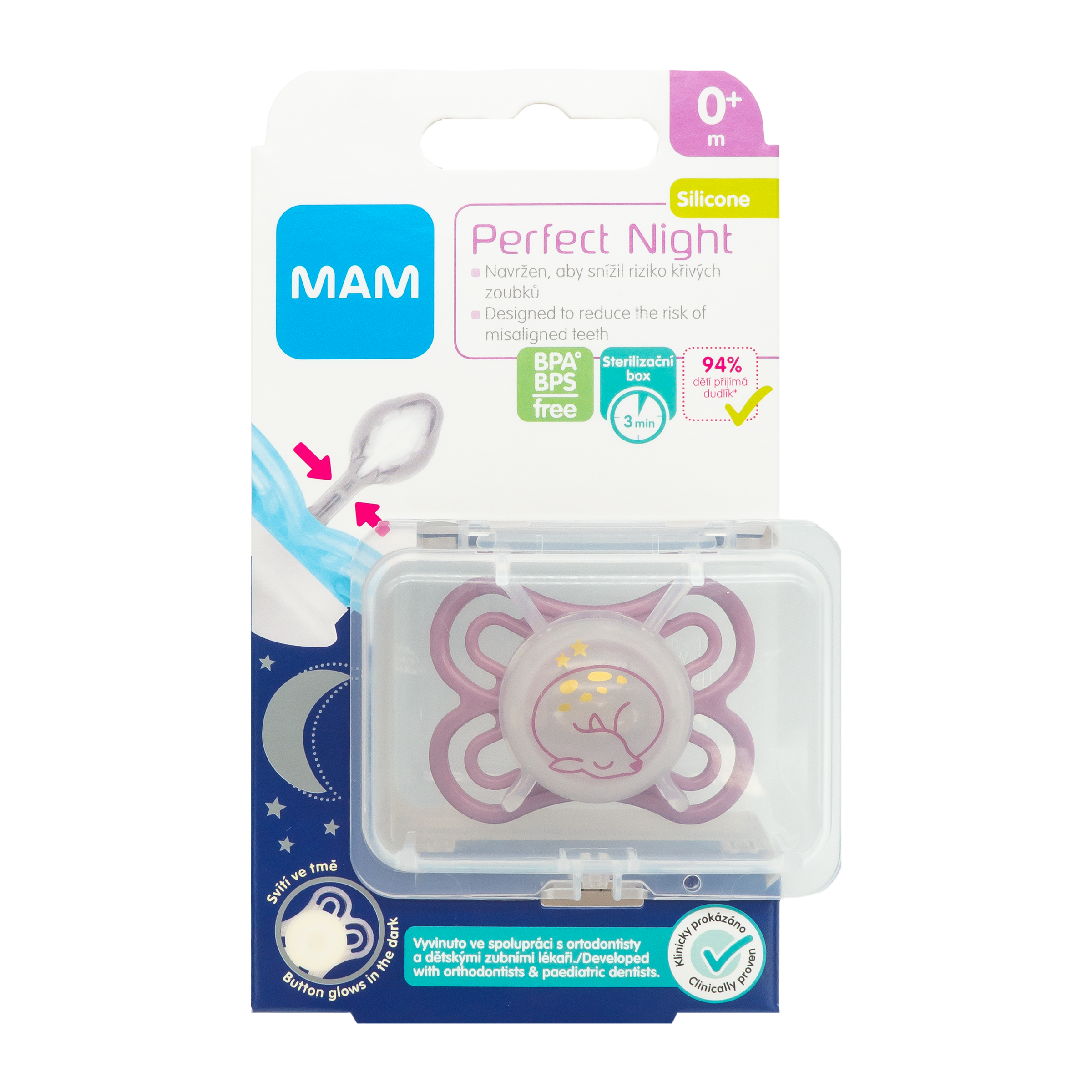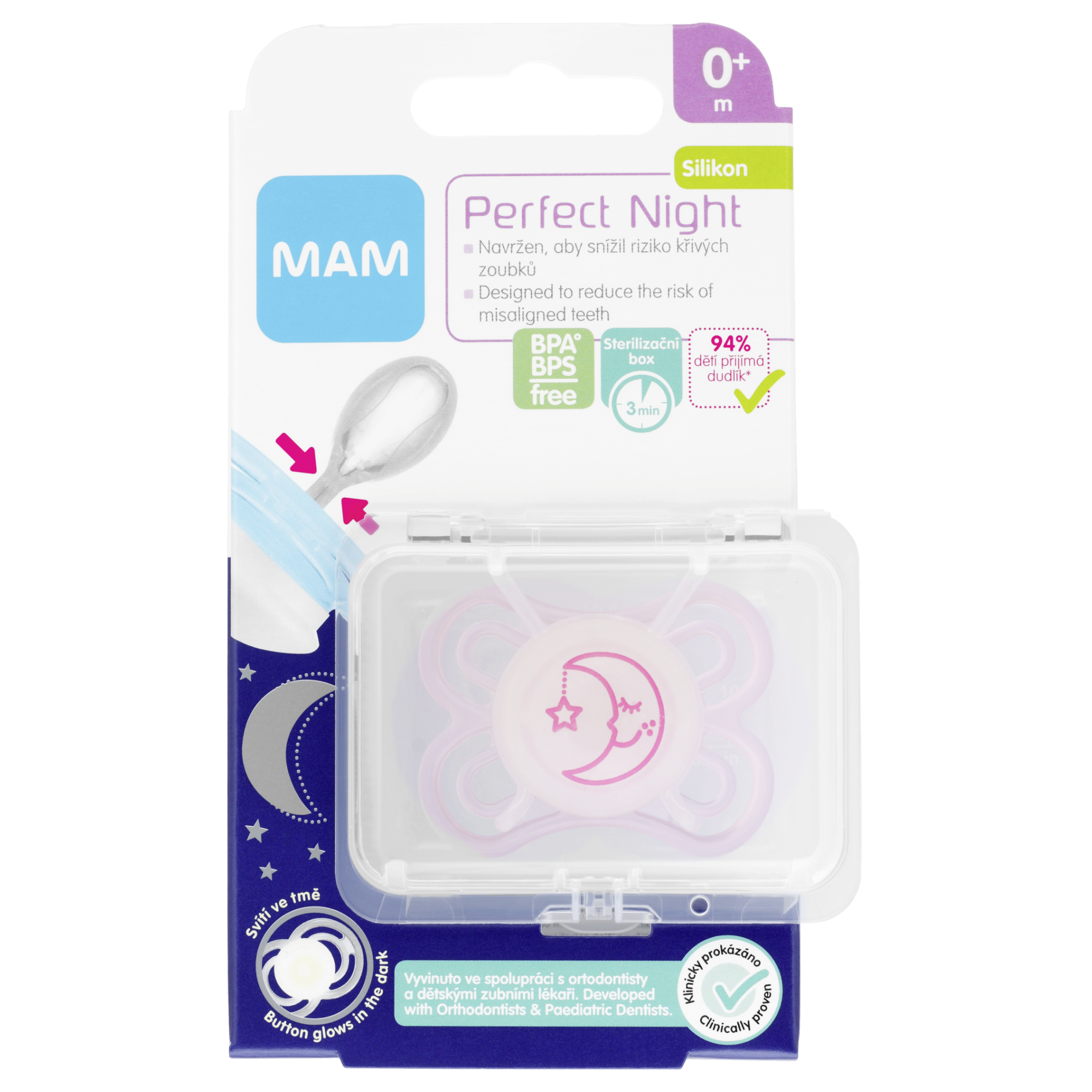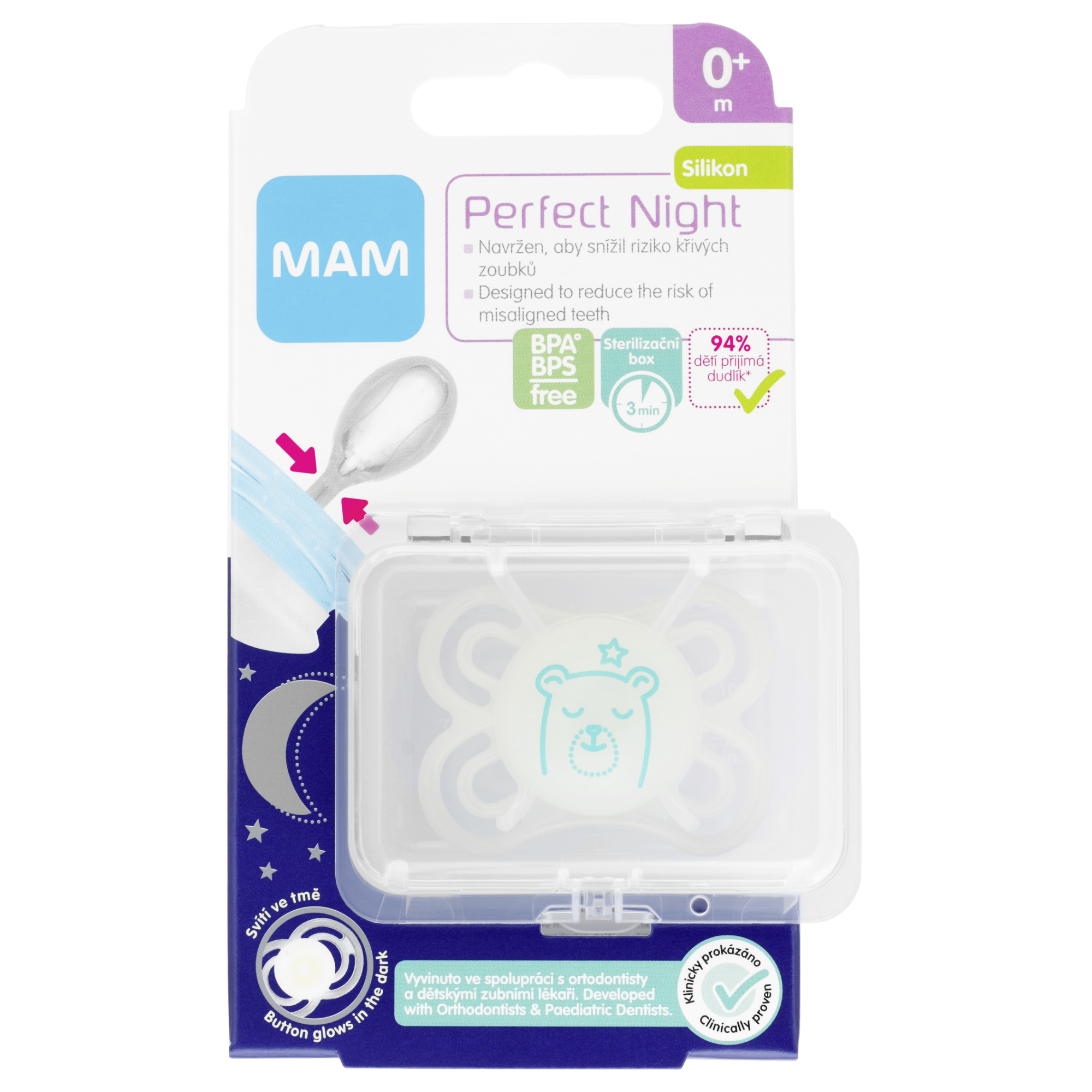 MAM dudlík Perfect Night snižuje nebezpečí křivého růstu zoubků a vadného skusu. Díky jedinečné savičce Dento-Flex, jemné jako pokožka, je krček dudlíku o 60 % tenčí a 4krát měkčí (v průměru: o 36-76 % tenčí a 2-8 krát měkčí než běžné silikonové dudlíky). Zoubky tak získají větší prostor pro svůj růst, a riziko zkřivení zoubků se tak sníží. S průměrem pouhých 2,8 mm je krček savičky MAM Perfect nejtenčím, který je dostupný na trhu (testováno výzkumným institutem v Rakousku na 27 dudlících z celého světa). Dudlík je vyvinut pro noční použití. Knoflík dudlíku ve tmě svítí, takže rodiče i děti ho snadno mohou nalézt. Je balen v praktickém sterilizačním boxu.