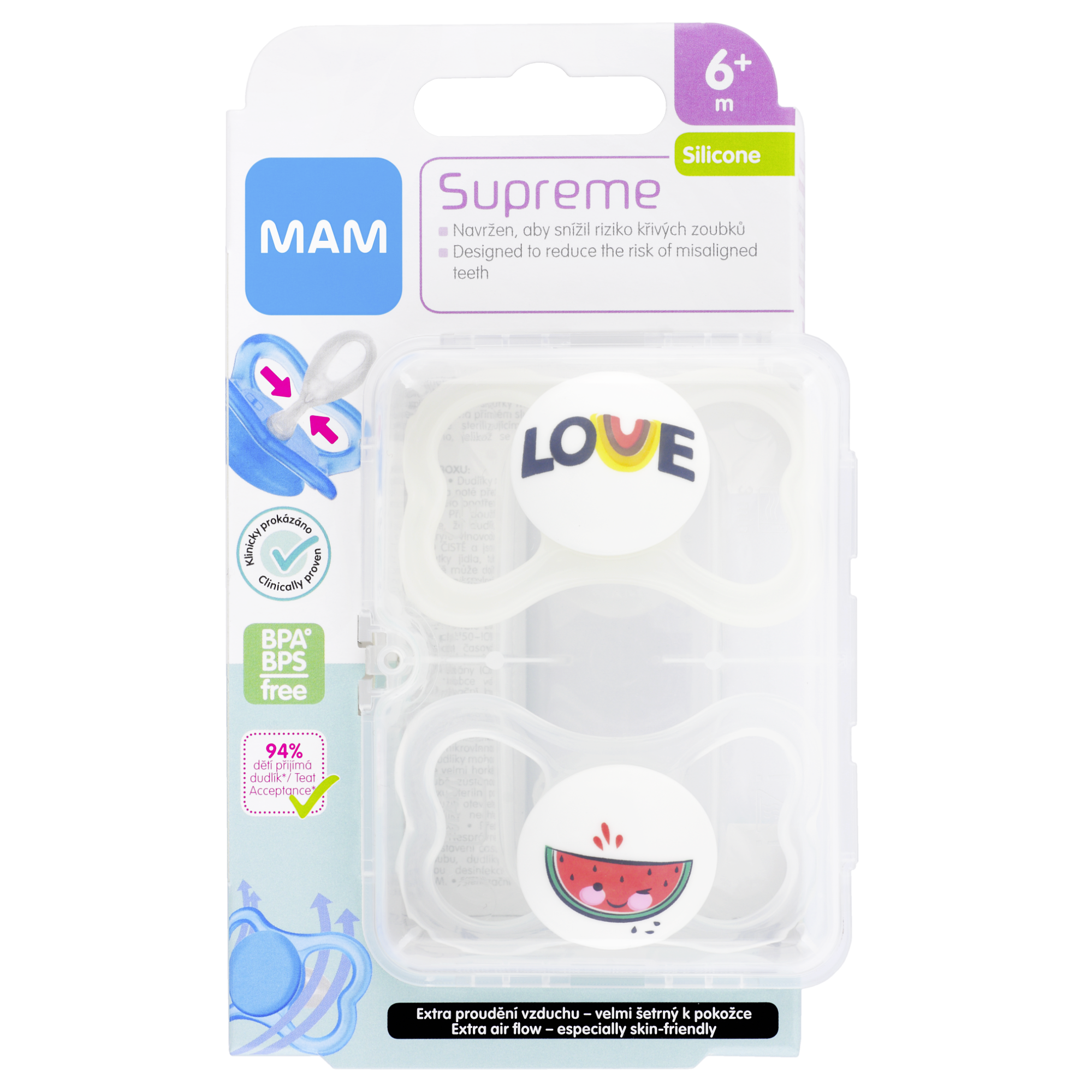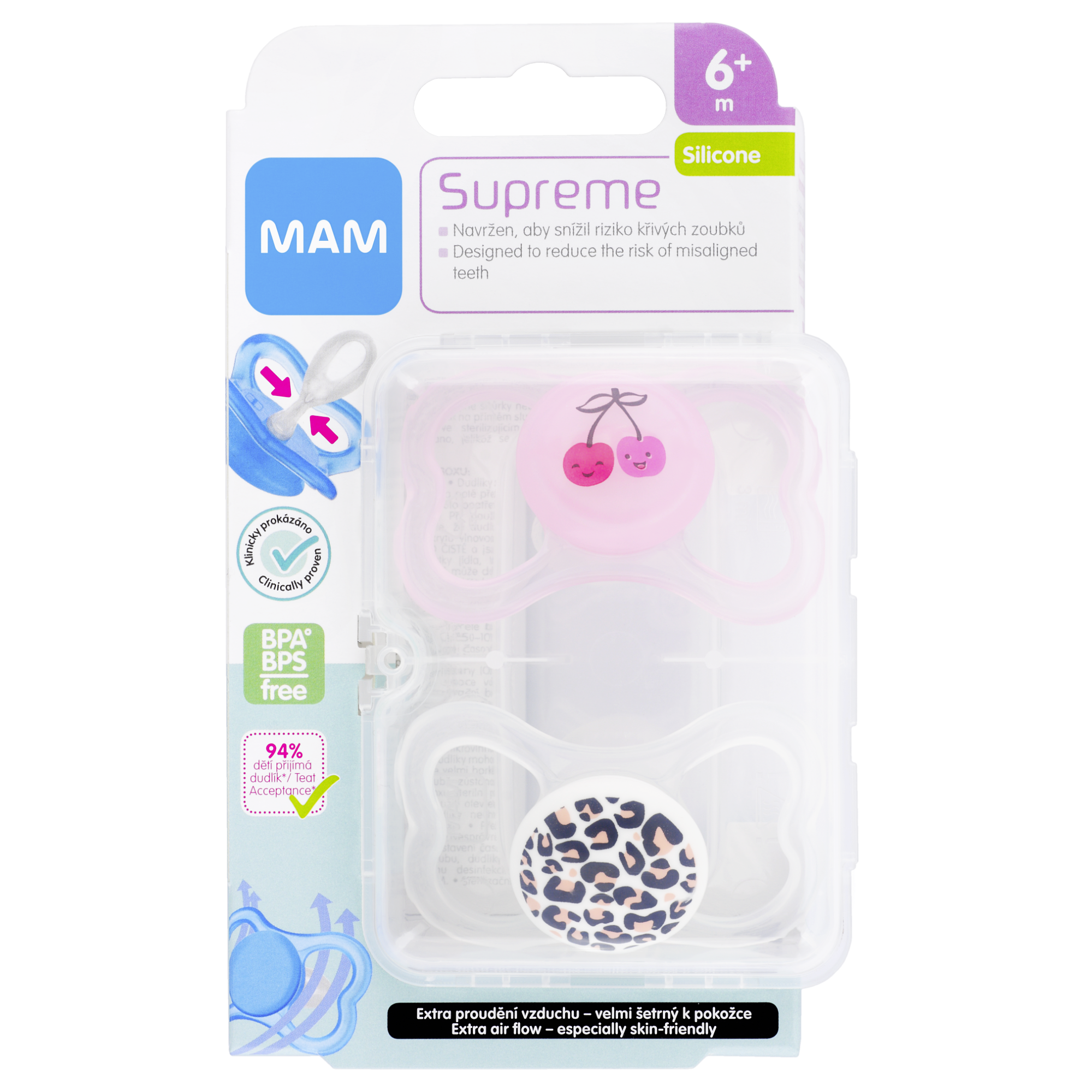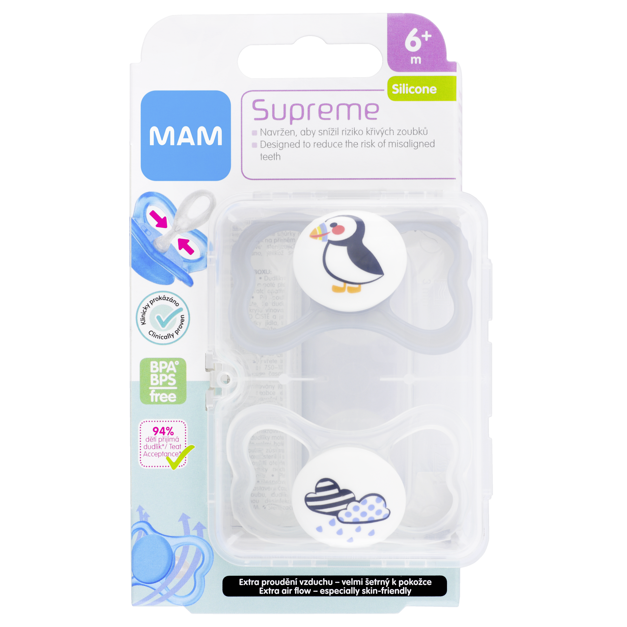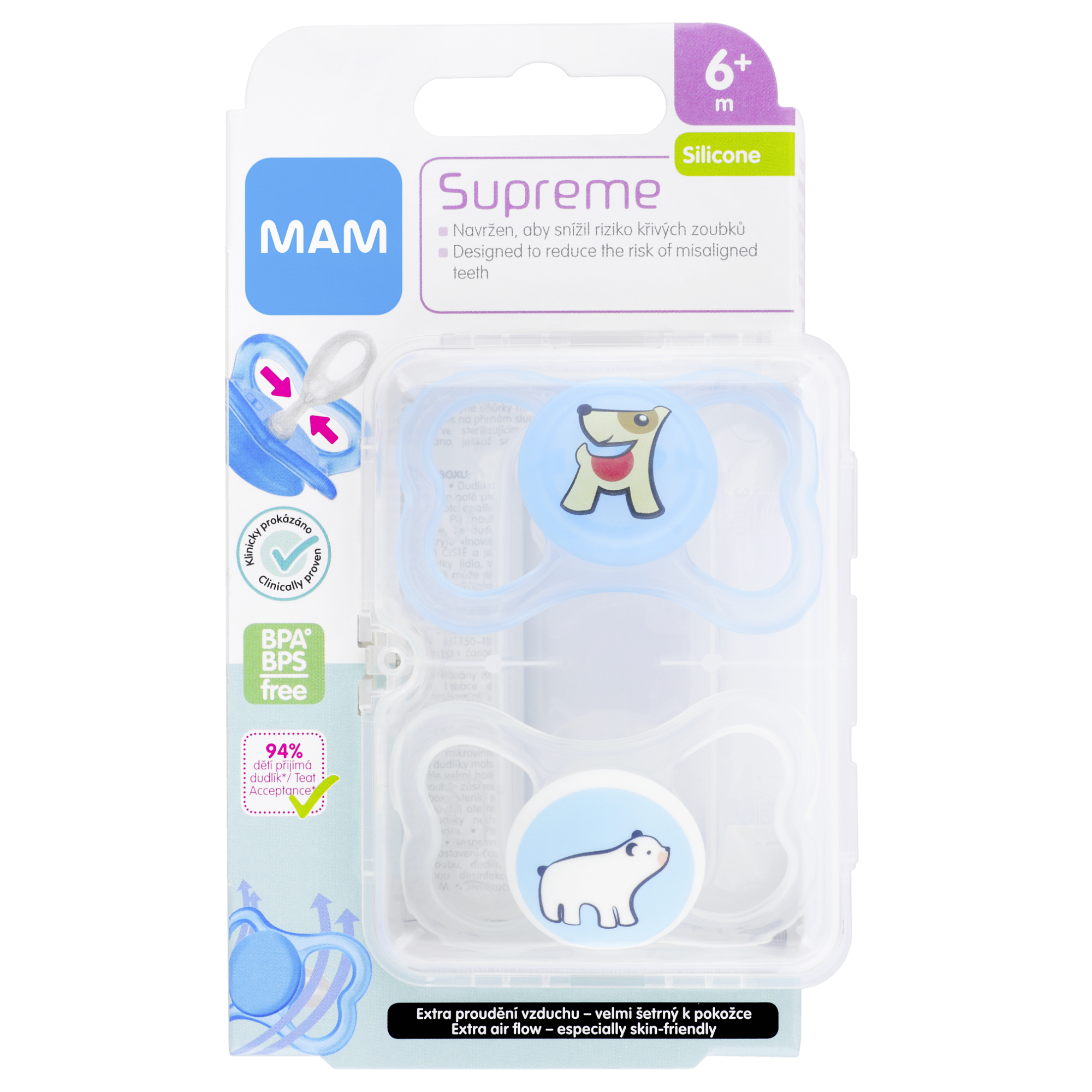 Novinka MAM Supreme je kombinací oblíbených dudlíků MAM Air s extra velkými otvory pro proudění vzduchu a MAM Perfect s extra tenkou savičkou snižující nebezpečí křivého růstu zoubků a vadného skusu. Díky jedinečné savičce Dento-Flex, jemné jako pokožka, je krček dudlíku o 60 % tenčí a 4krát měkčí (v průměru: o 36 - 76 % tenčí / 2 - 8krát měkčí než běžné silikonové dudlíky). Zoubky tak získají větší prostor pro svůj růst, a riziko zkřivení zoubků se tak sníží. Speciální design ochranného krytu umožňuje extra proudění vzduchu, díky čemuž dokonale sedí a je šetrný k dětské pokožce v okolí úst. Navíc balen v praktickém sterilizačním boxu.