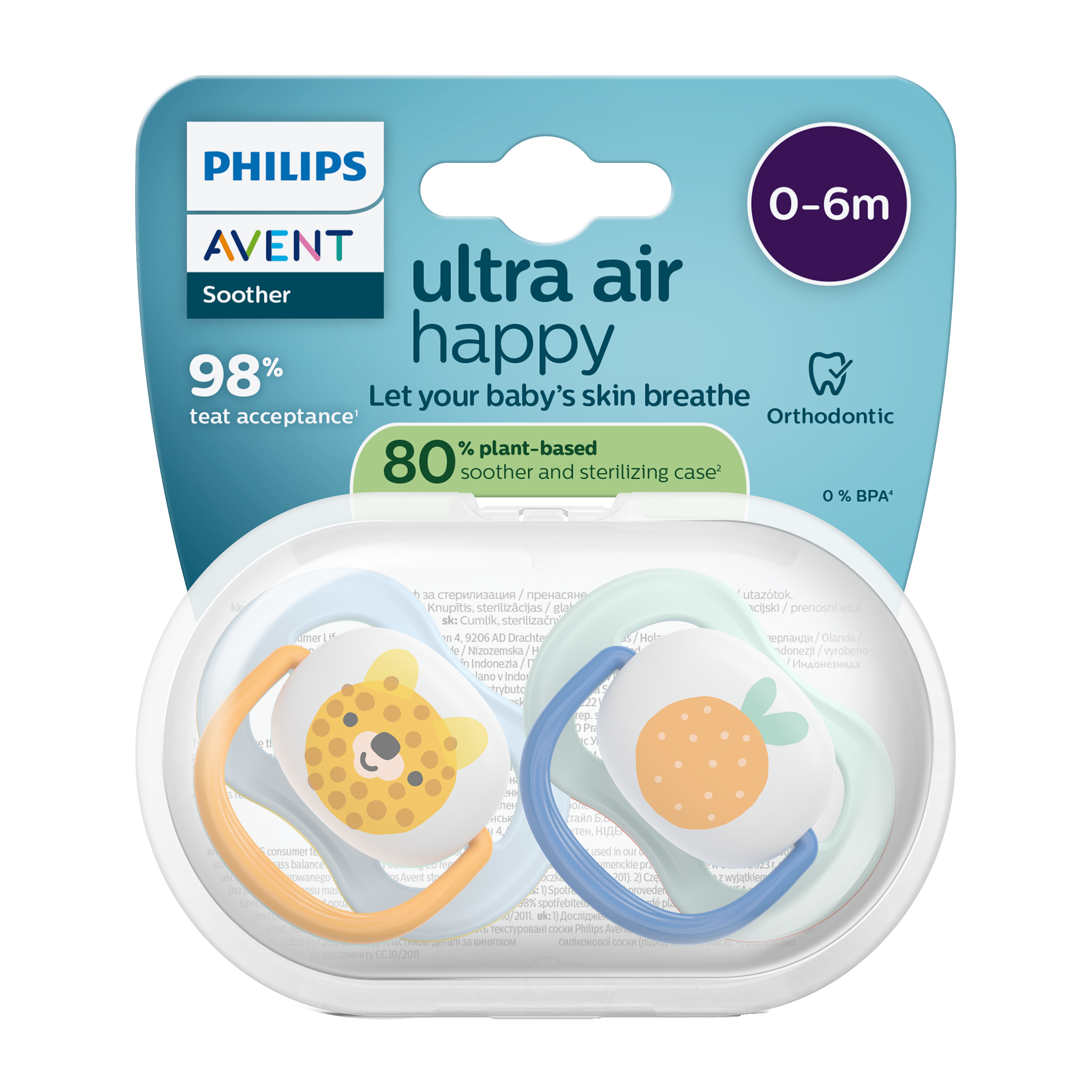 Díky velkým otvorům může dětská pokožka dýchat, takže při uklidňování zůstává sušší. *Když jsme se rodičů zeptali, jak jejich děti na náš silikonový dudlík s texturovanou povrchovou úpravou reagují, v průměru 98 % z nich odpovědělo, že jejich miminko šidítka Philips Avent Ultra Soft a Ultra Air přijímá. Dudlík je vyroben ze 100% silikonu. Dudlíky Ultra Soft a Ultra Air jsou vyráběny ze silikonu, protože se jedná o bezpečný a inertní materiál, široce využívaný pro lékařské účely, neobsahuje nebezpečné chemikálie, hormonálně aktivní látky (např. BPA) ani alergeny.