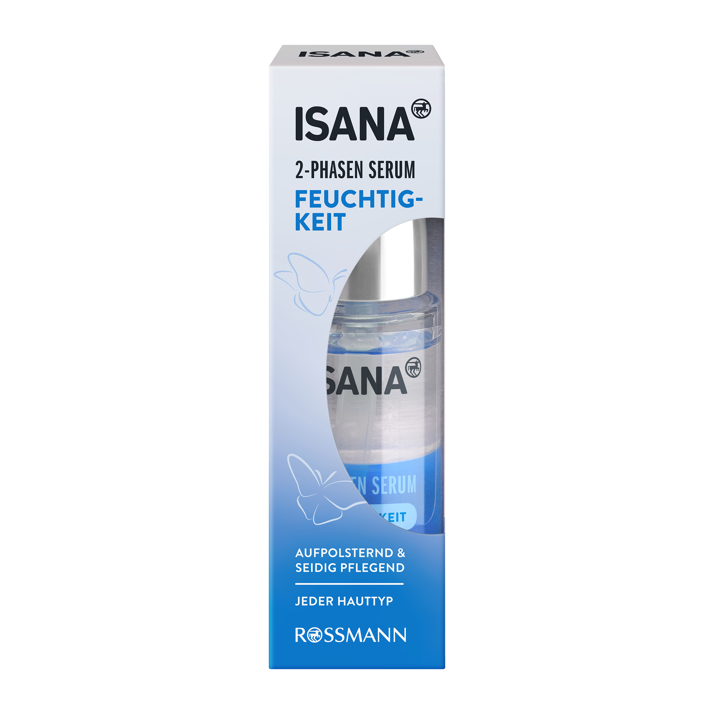 Dvoufázové hydratační sérum ISANA je inovativní receptura pro dehydratovanou pleť a skládá se ze dvou vizuálně atraktivních fází, které se protřepáním spojí a poté plně rozvinou svůj účinek. Kombinace vícefázového komplexu kyseliny hyaluronové s hydratačními a vypínacími vlastnostmi a vybraných přírodních olejů působí proti vysušeným linkám a pocitům pnutí, přispívá k rovnováze vlhkosti a zanechává pleť příjemně vyživenou.