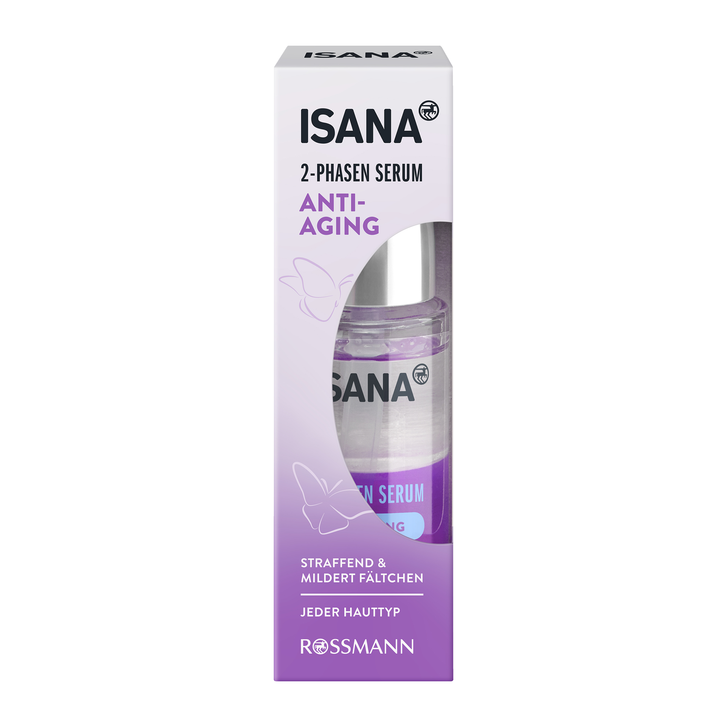 ISANA 2-fázové sérum proti stárnutí je inovativní přípravek pro zralou pleť, který se skládá ze 2 vizuálně atraktivních fází, které se protřepáním spojí a následně plně rozvinou svůj účinek. Kombinace dobře tolerované alternativy retinolu bakuchiolu s antioxidačními a kolagen stimulujícími vlastnostmi, stejně jako cenných tetrapeptidů a vybraných přírodních olejů podporuje zlepšení pružnosti a pevnosti pleti. Tím působí proti prvním jemným linkám a vráskám.