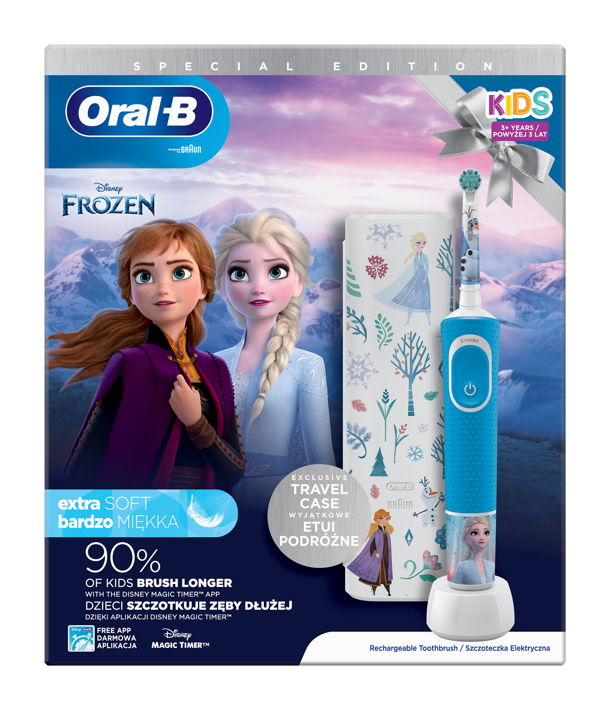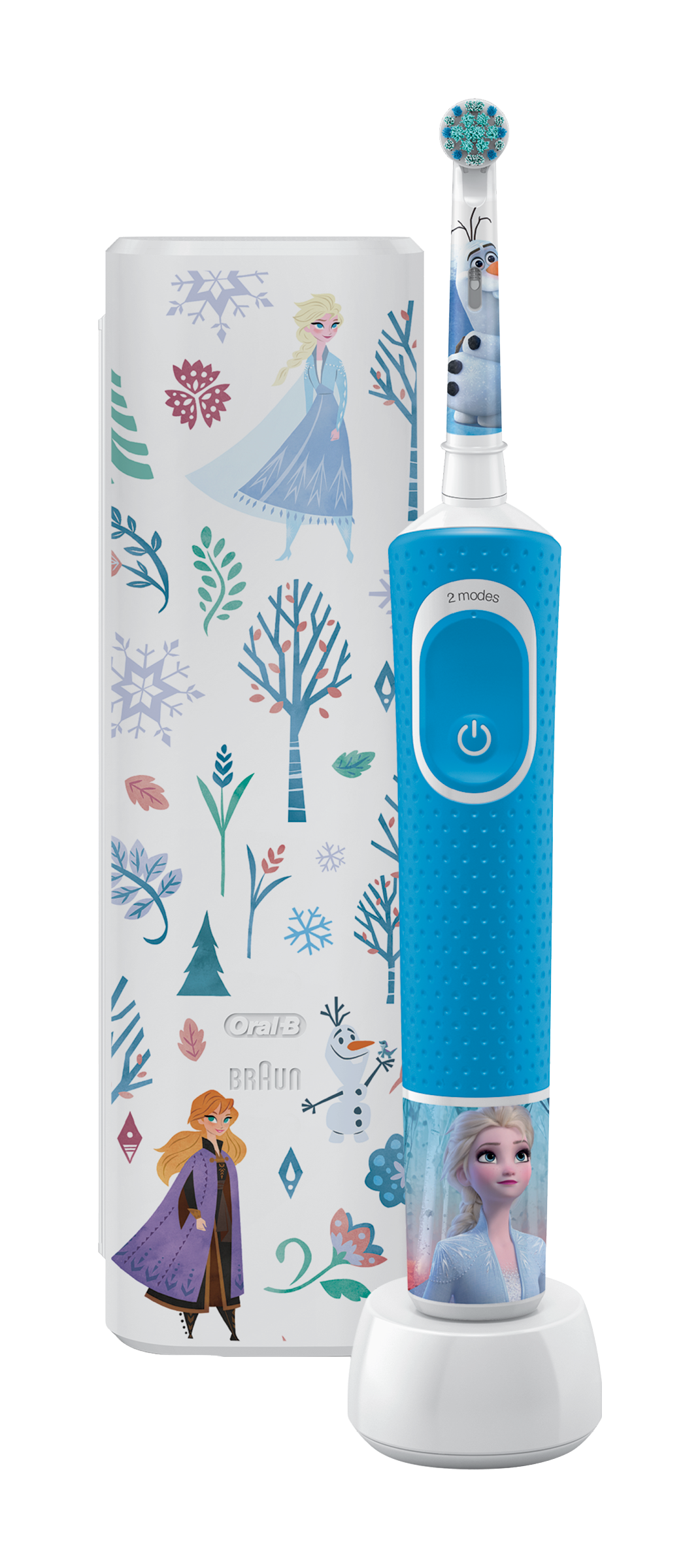 Elektrický zubní kartáček Oral-B Kids 3+ pobaví děti motivem z Disney Ledového království a jako produkt doporučovaný zubními lékaři současně vyčistí zuby šetrně a účinně. Tento kartáček má 2 režimy čištění včetně unikátního jemného režimu pro děti, takže dětské zoubky čistí opravdu šetrně. Odstraňuje více zubního plaku než běžný manuální zubní kartáček. K dispozici jsou čtyři samolepky s motivy Disney Ledového království na vylepšení rukojeti.